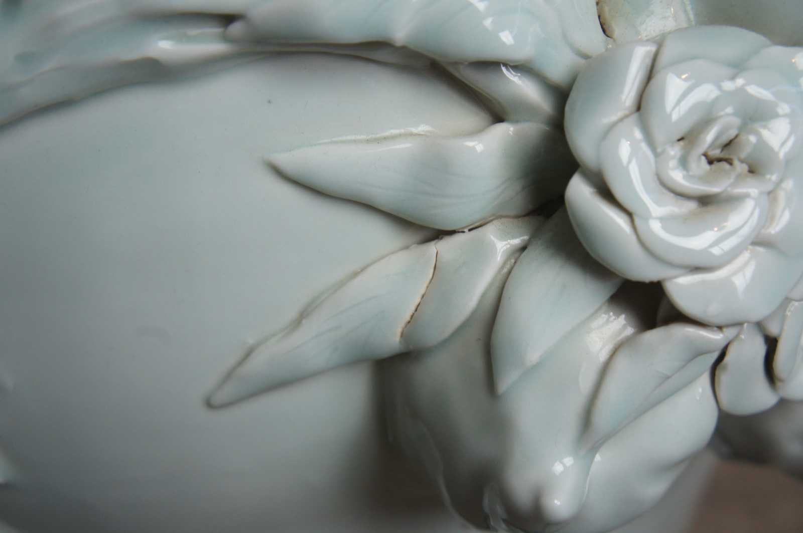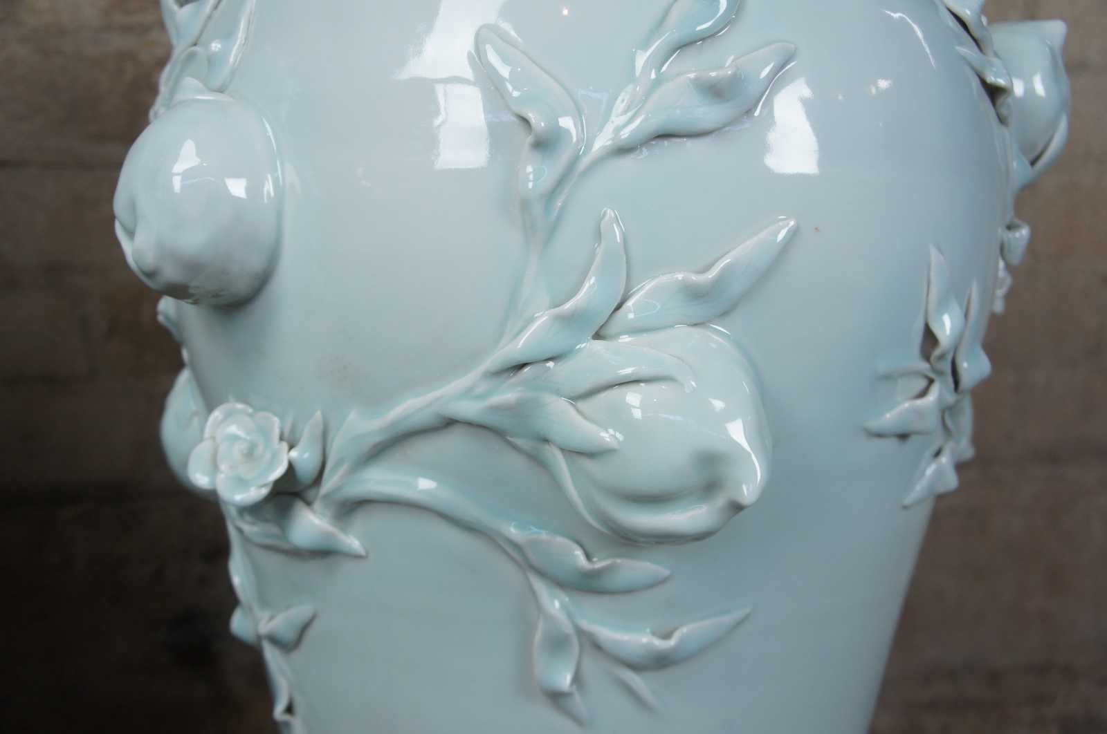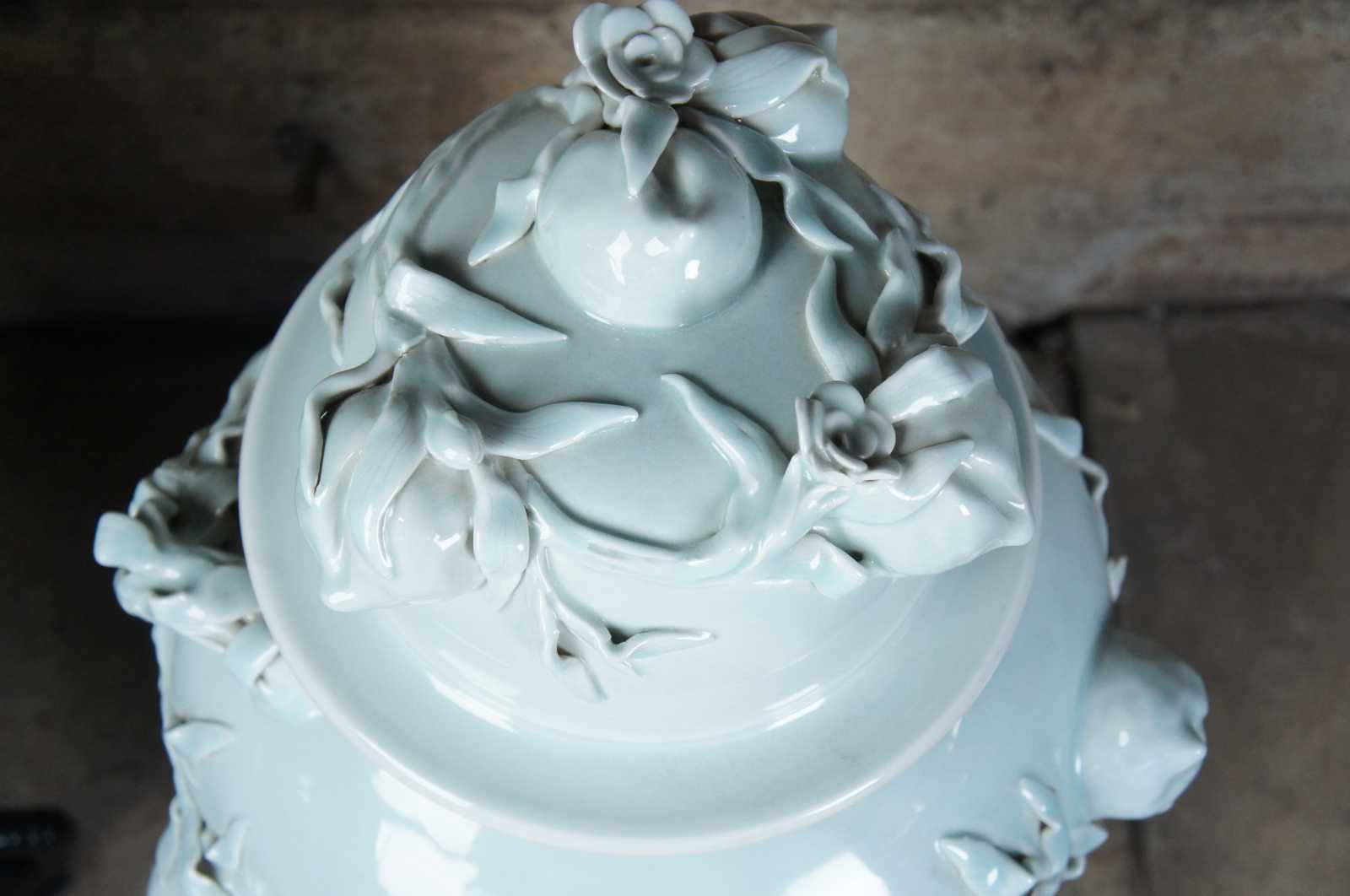 Late 20th century glazed ceramic palace urns on stand. Features two lidded ginger jars with high relief pomegranate motif. Each sits upon ornate black lacquer stand. Color is white with blue teal hue.