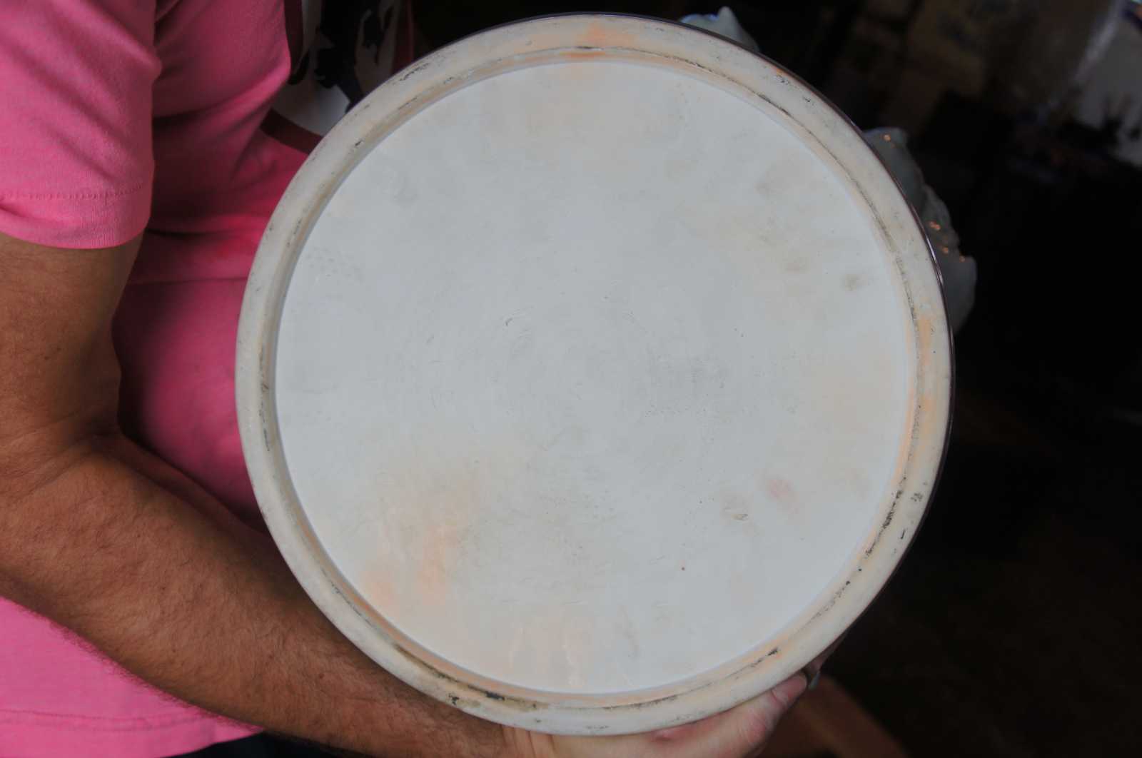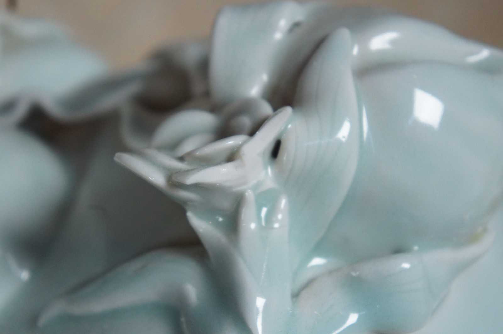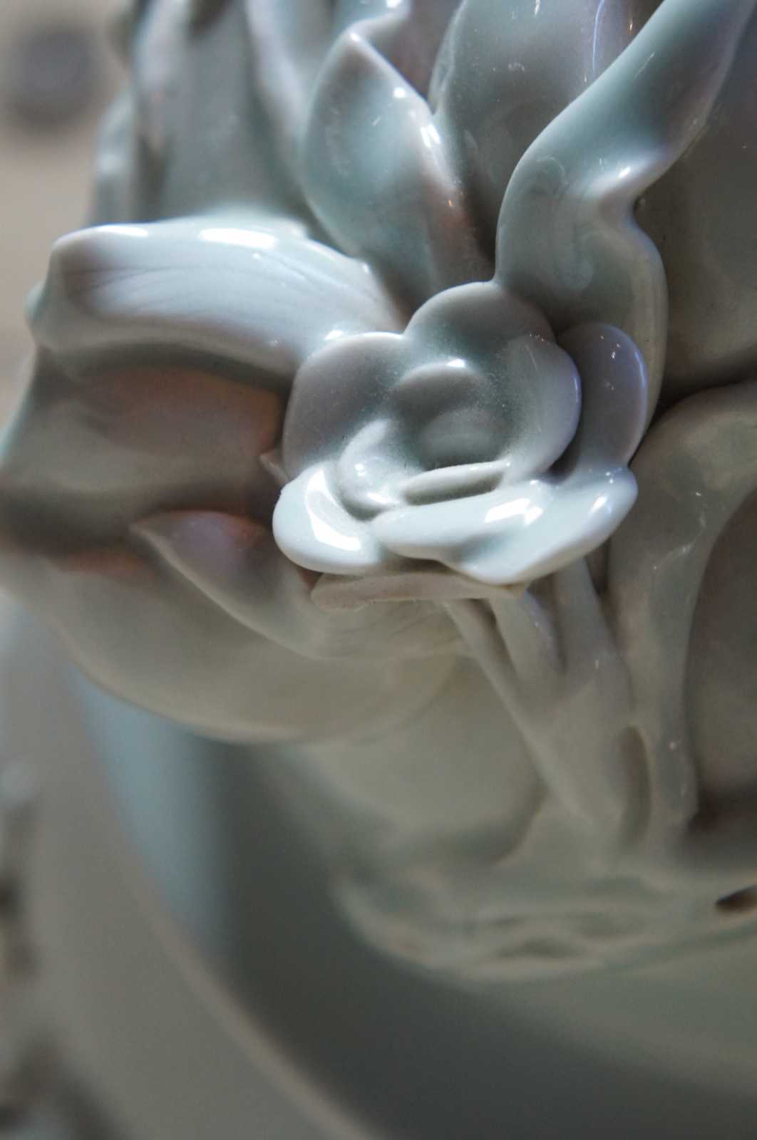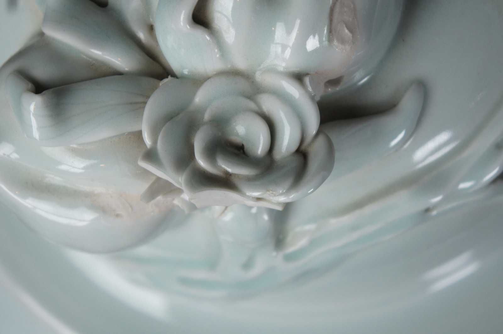 Late 20th century glazed ceramic palace urns on stand. Features two lidded ginger jars with high relief pomegranate motif. Each sits upon ornate black lacquer stand. Color is white with blue teal hue.