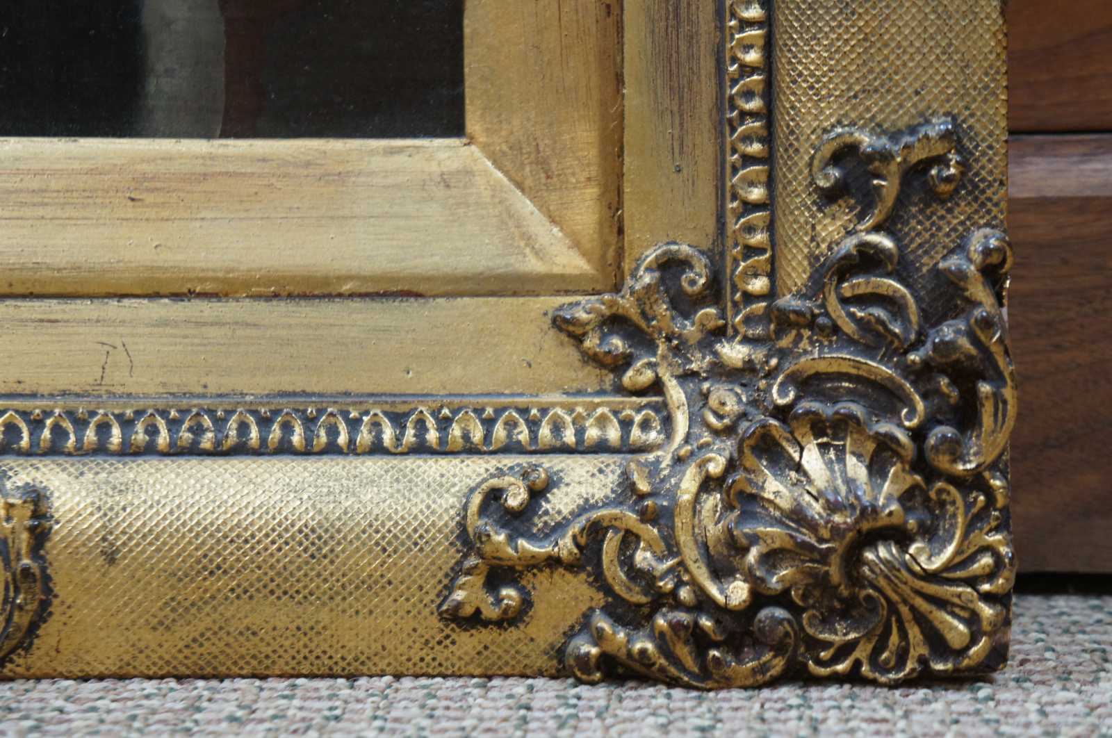 Antique early Victorian portrait painting of a wealthy woman / aristocrat in black, wearing a bonnet, ornate gold frame.