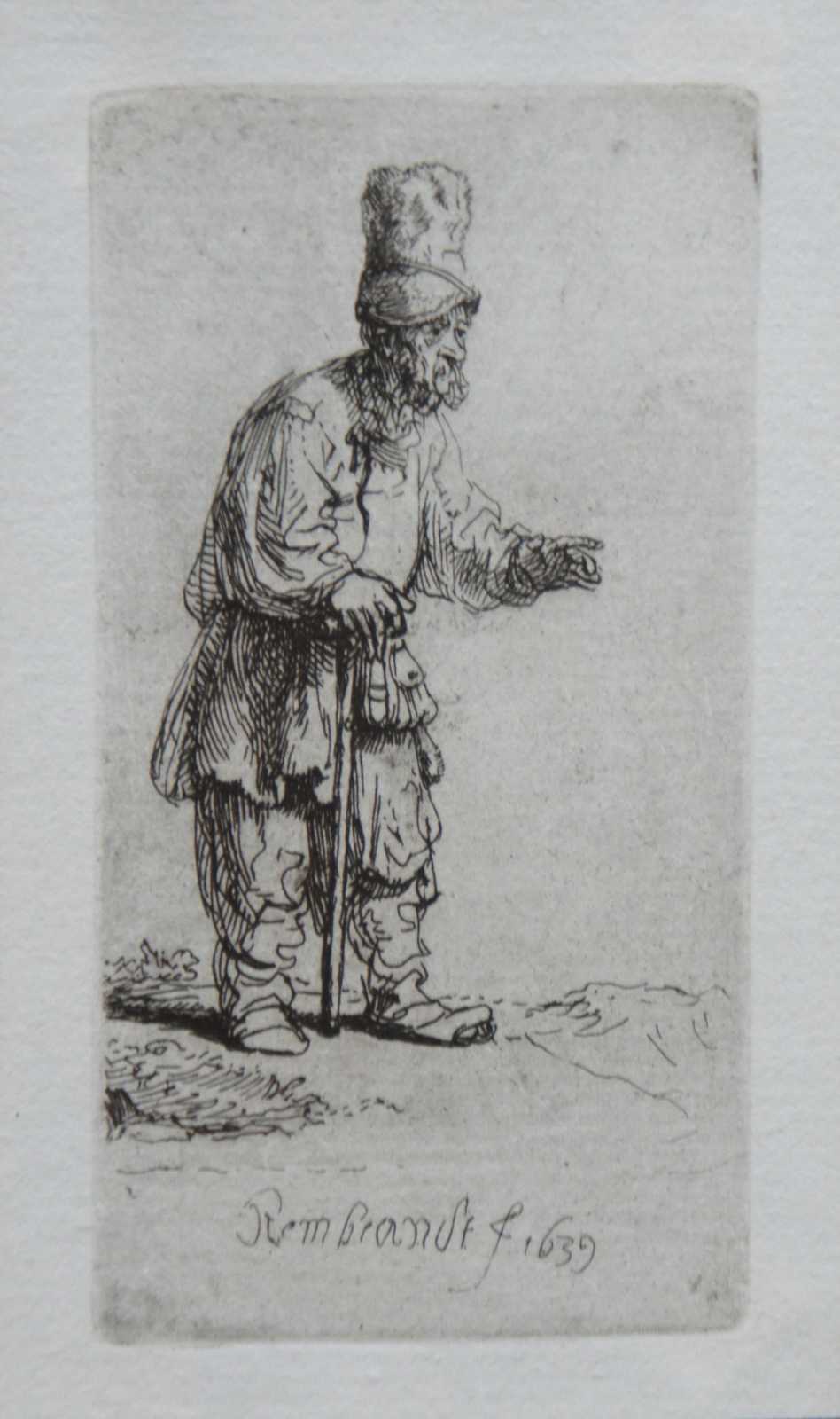 Antique Framed drypoint etching by Rembrandt signed in plate and dated 1639, “A Peasant in a High Cap, Standing Leaning on a Stick” Rembrandt Harmenszoon Van Rijn was born in Leyden on July 15, 1606. In 1620 he became a student at the Latin School of Leyden University, but soon gave up his formal education to enter the studio of Jacob van Swanenburch. He continued his instruction in Amsterdam with Pieter Lastman and then Jan Pynas. In 1626 he returned to Leyden, an independent master, and entered into partnership with Gerald Dou (1628). Three years later he settled in Amsterdam, where he remained until his death. In that city his first big portrait group, ""The Anatomy Lesson of Dr. Nicolaes Tulp"" gained him immediate recognition and a fashionable portrait following. Rembrandt, however, could not accept that sort of career and ""The Night Watch"", finished in 1642, aroused the hostility of his sitters.