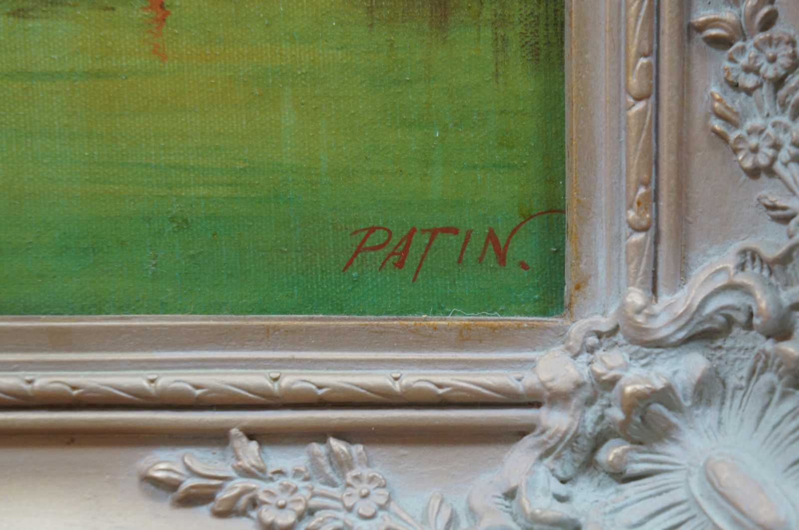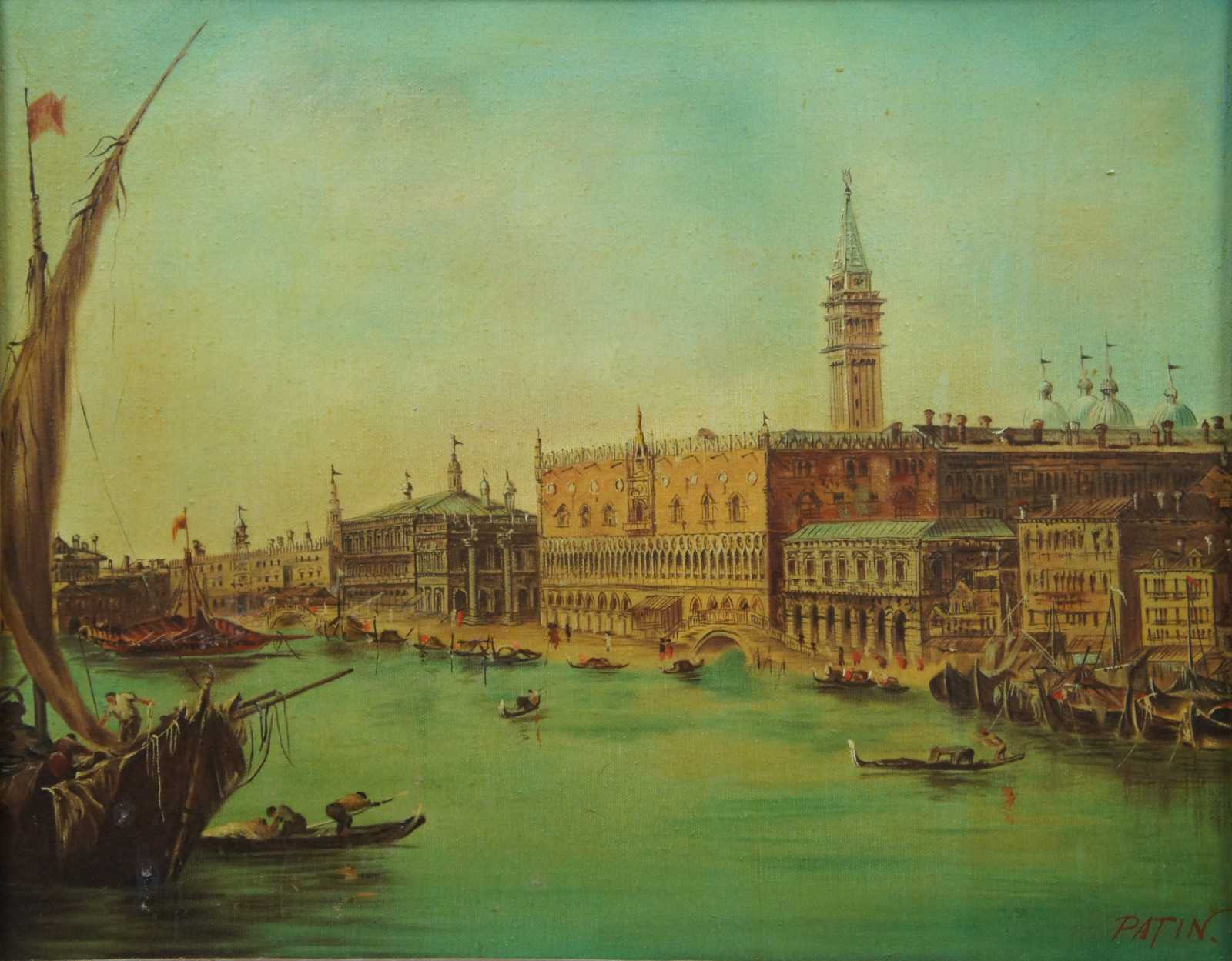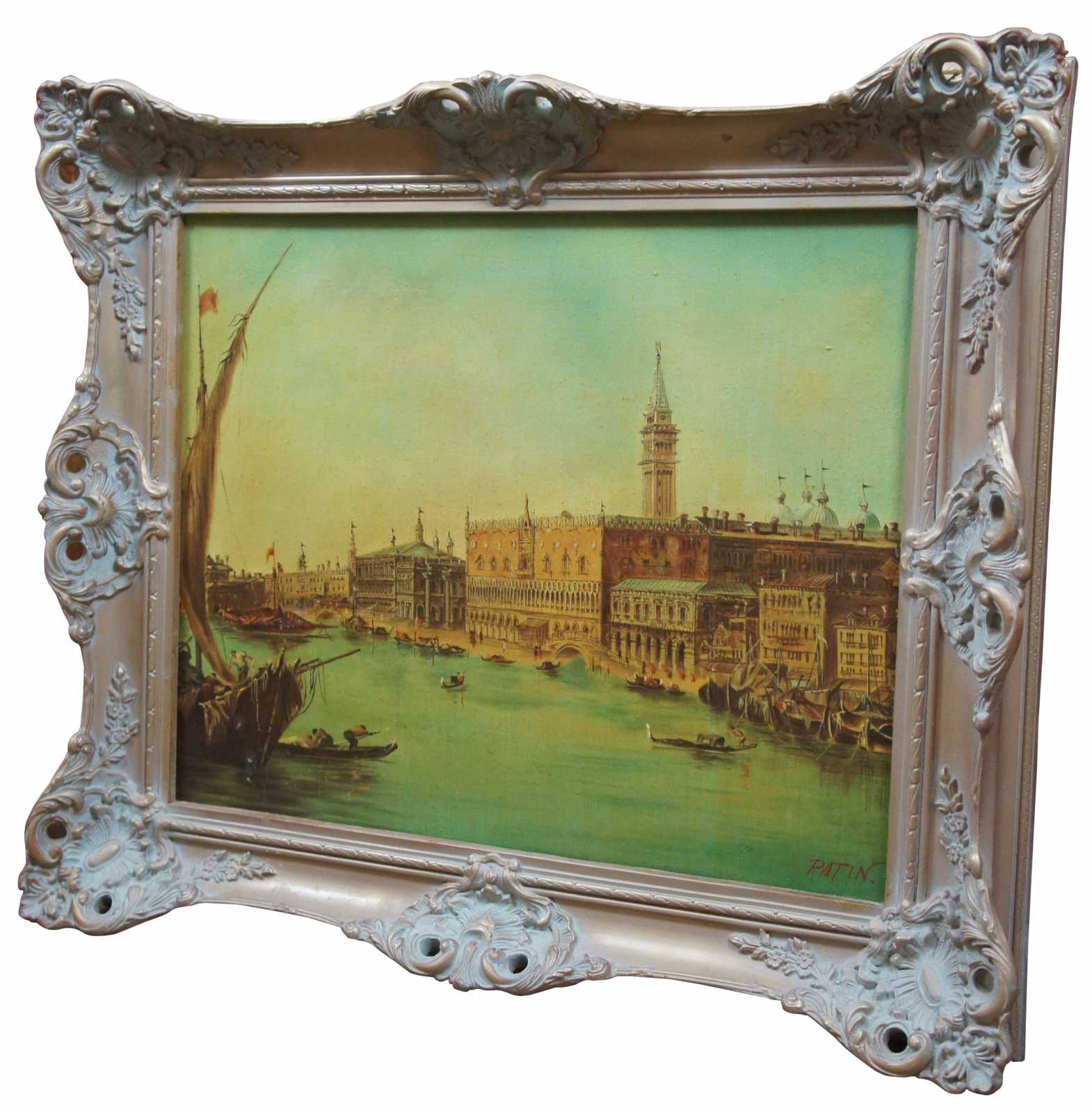 20th century glimpse of the canal in Venice Italy. Depicts vaious boats and gondolas docking in the harbour. Signed Patin lower right. The beautiful historic achitecture of Venice seen in full display along the right side.