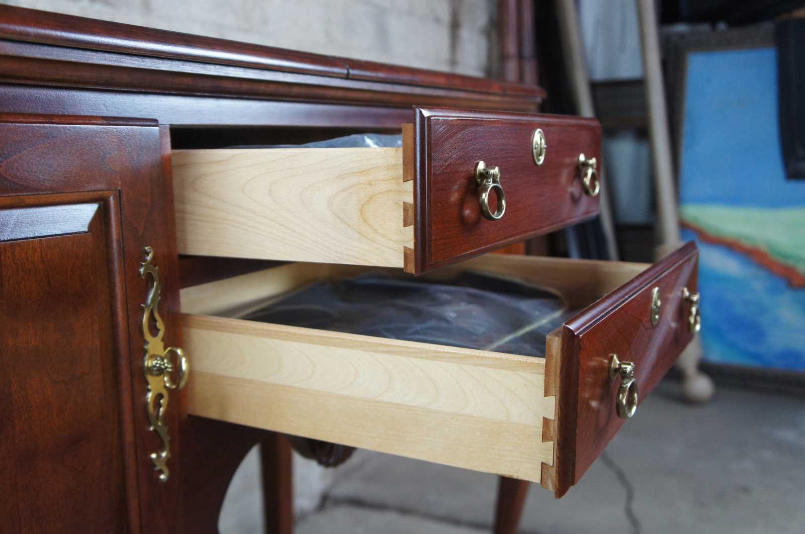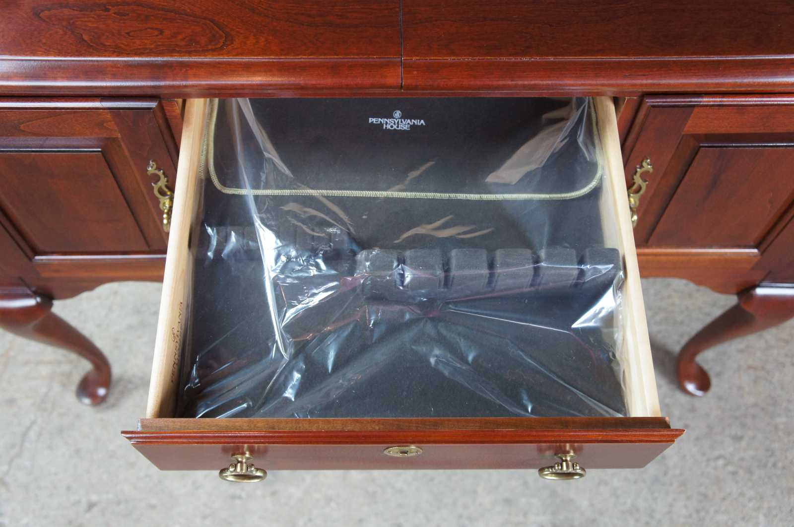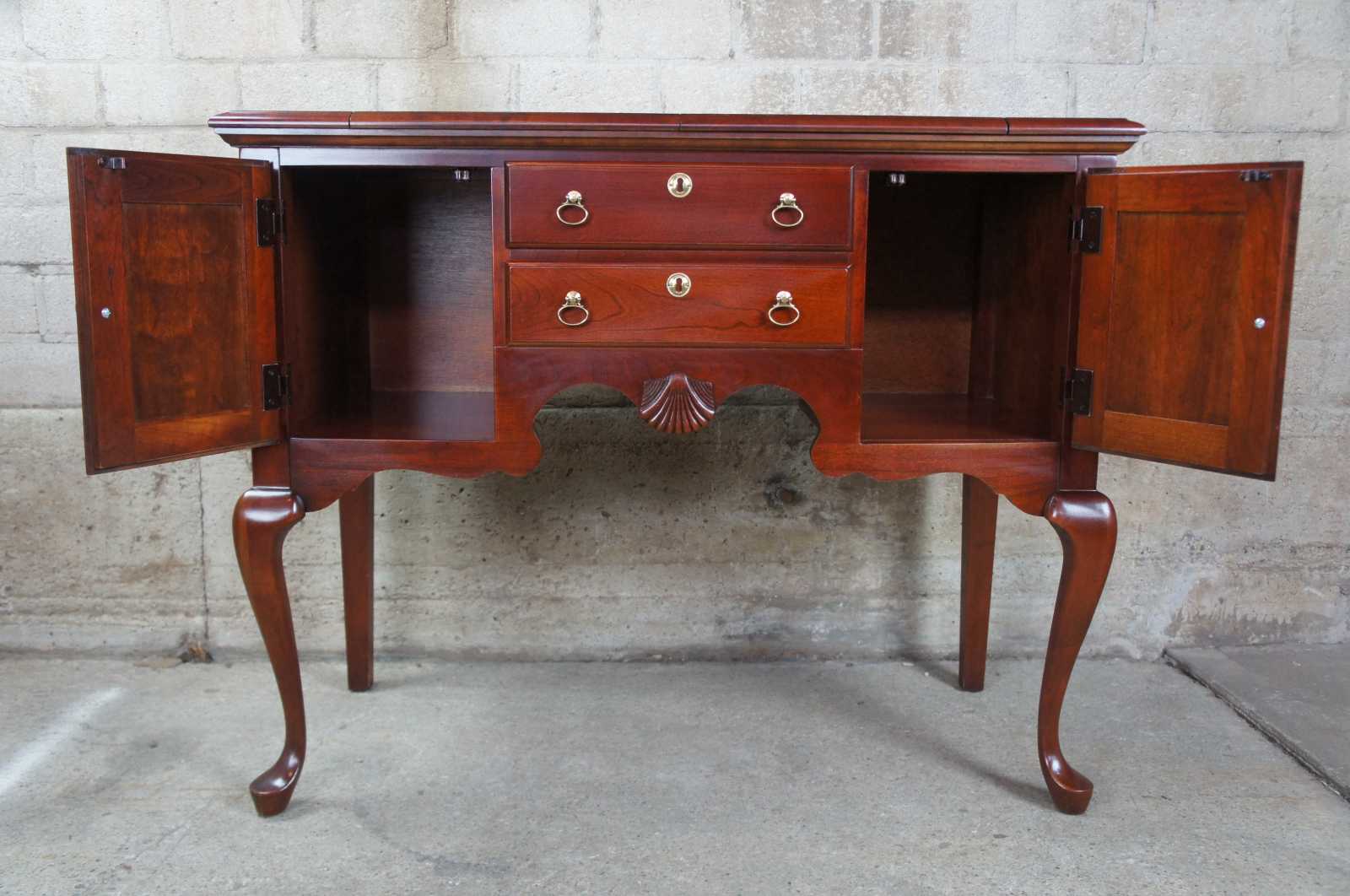 Vintage 2001 Pennsylvania House flip top cherry buffet or server. Features 18th century design made of solid cherry construction with traditional Queen Anne styling, raised panel cabinet doors with dovetailed drawers, brass hardware, and felt lined drawer over slipper feet. The top opens to a formica surface, great for serving or displaying your bar ware. Shaped like a lowboy. 50-3825