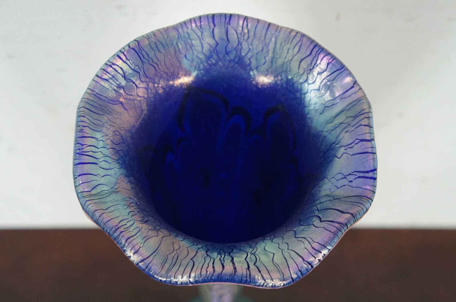 Hand blown art glass trumpet shaped flower vase in iridescent blue with white pulled feather details. For those who are considering this vase, please note that this vase is not tiffany.