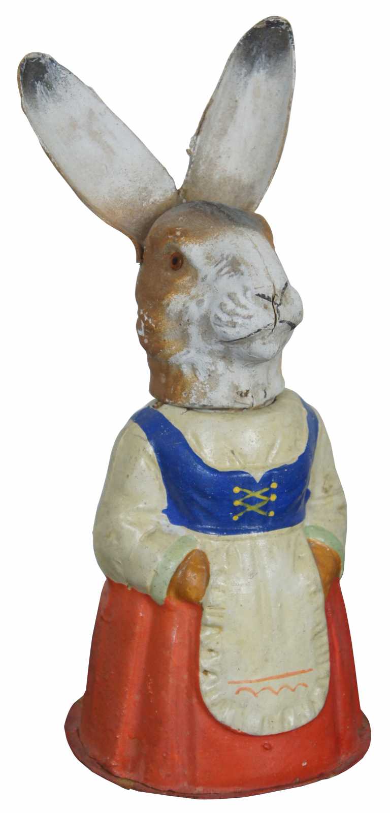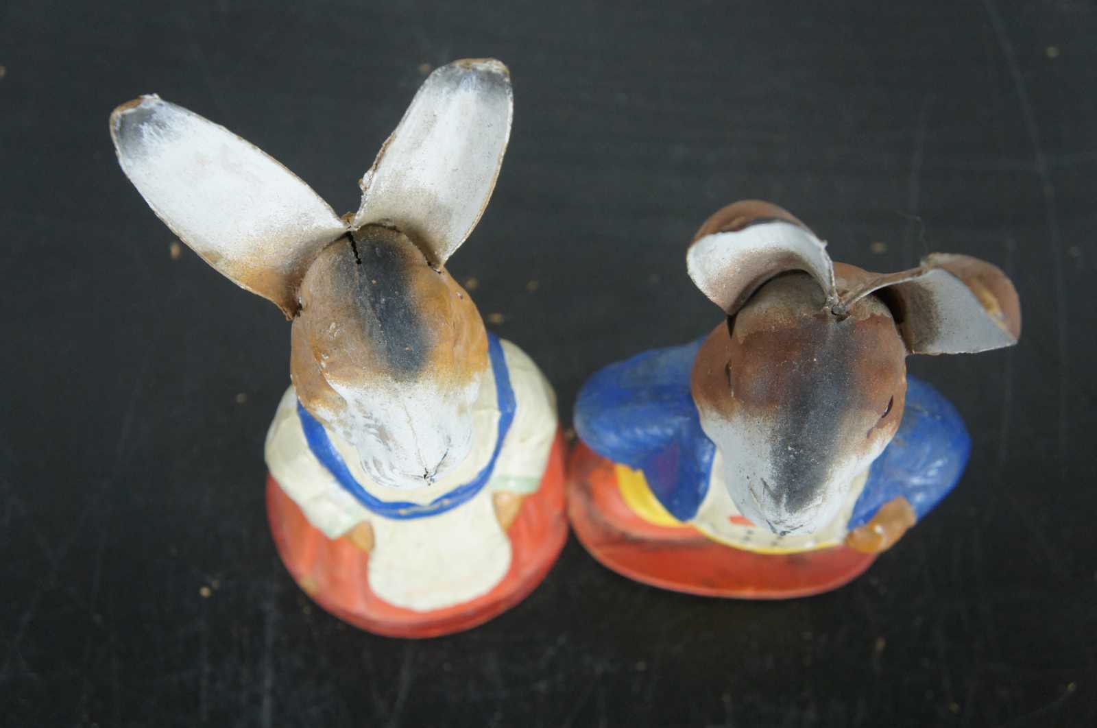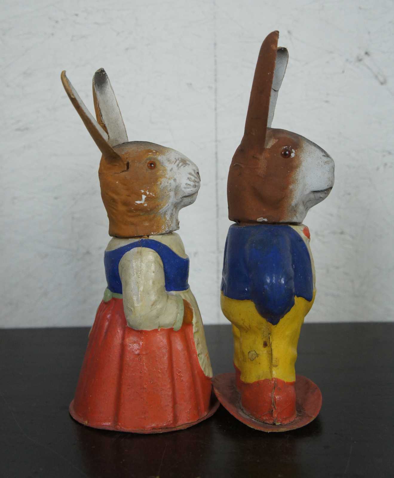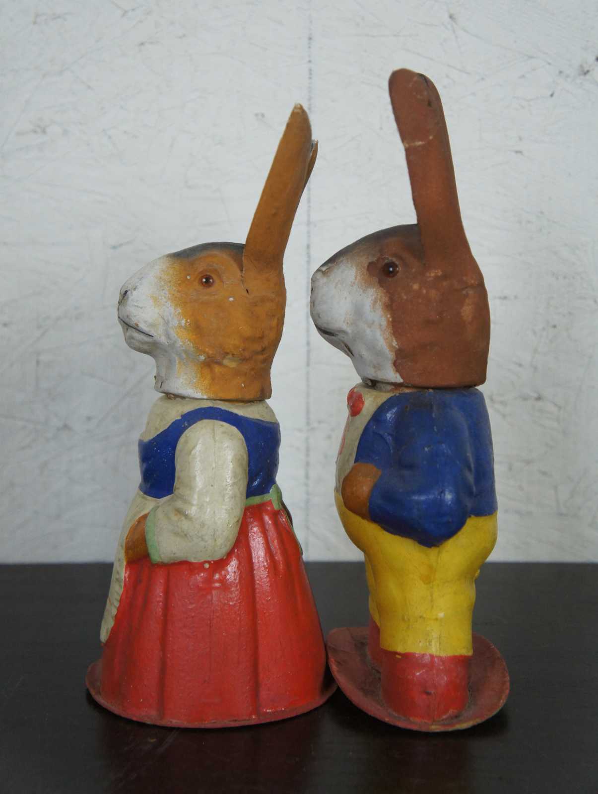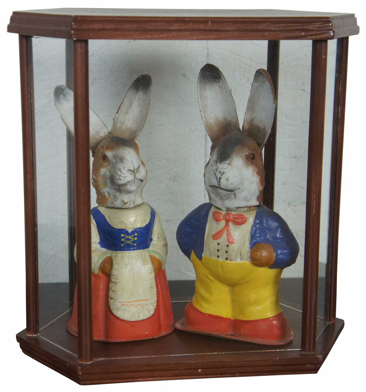 Pair of antique German paper mache, painted folk art rabbit / easter bunny Mr. & Mrs. figurines candy containers dressed in red, yellow and blue outfits and housed in a wood and glass display case.