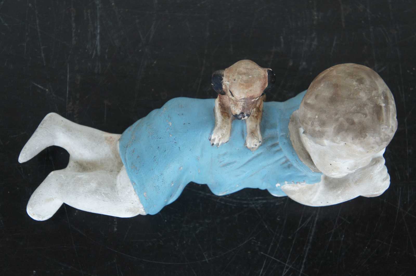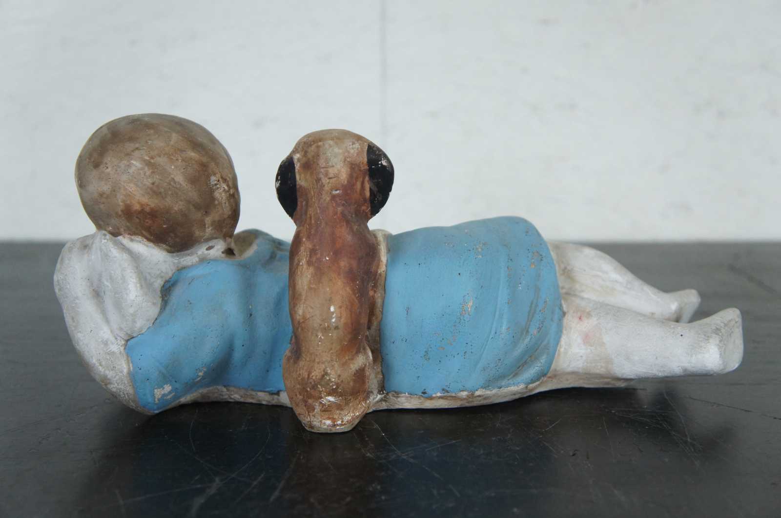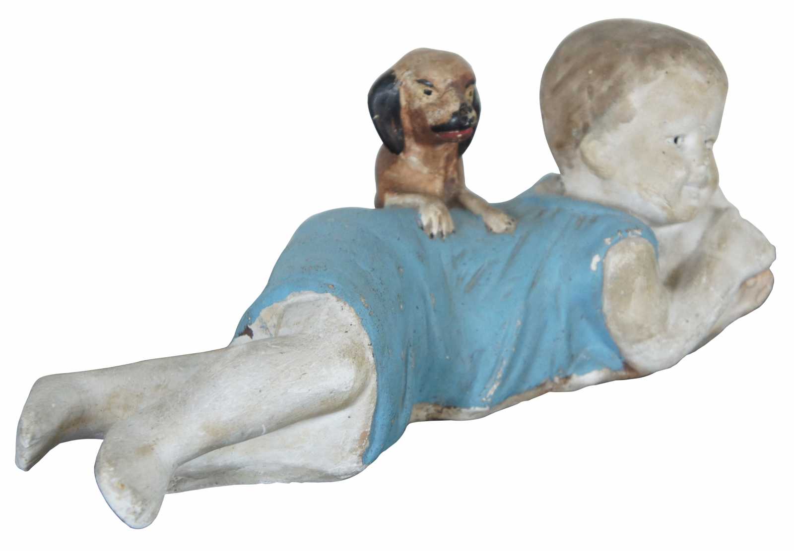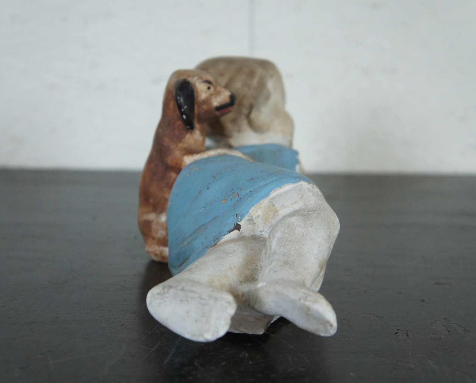 Antique 19th century piano baby figurine, shaped like a child reclining on a pillow with a brown dog. Piano babies were figurines used to hold a shawl in place over a piano.
