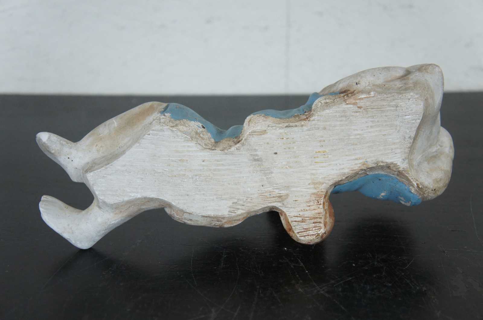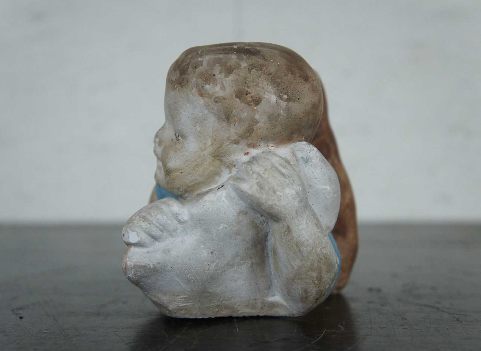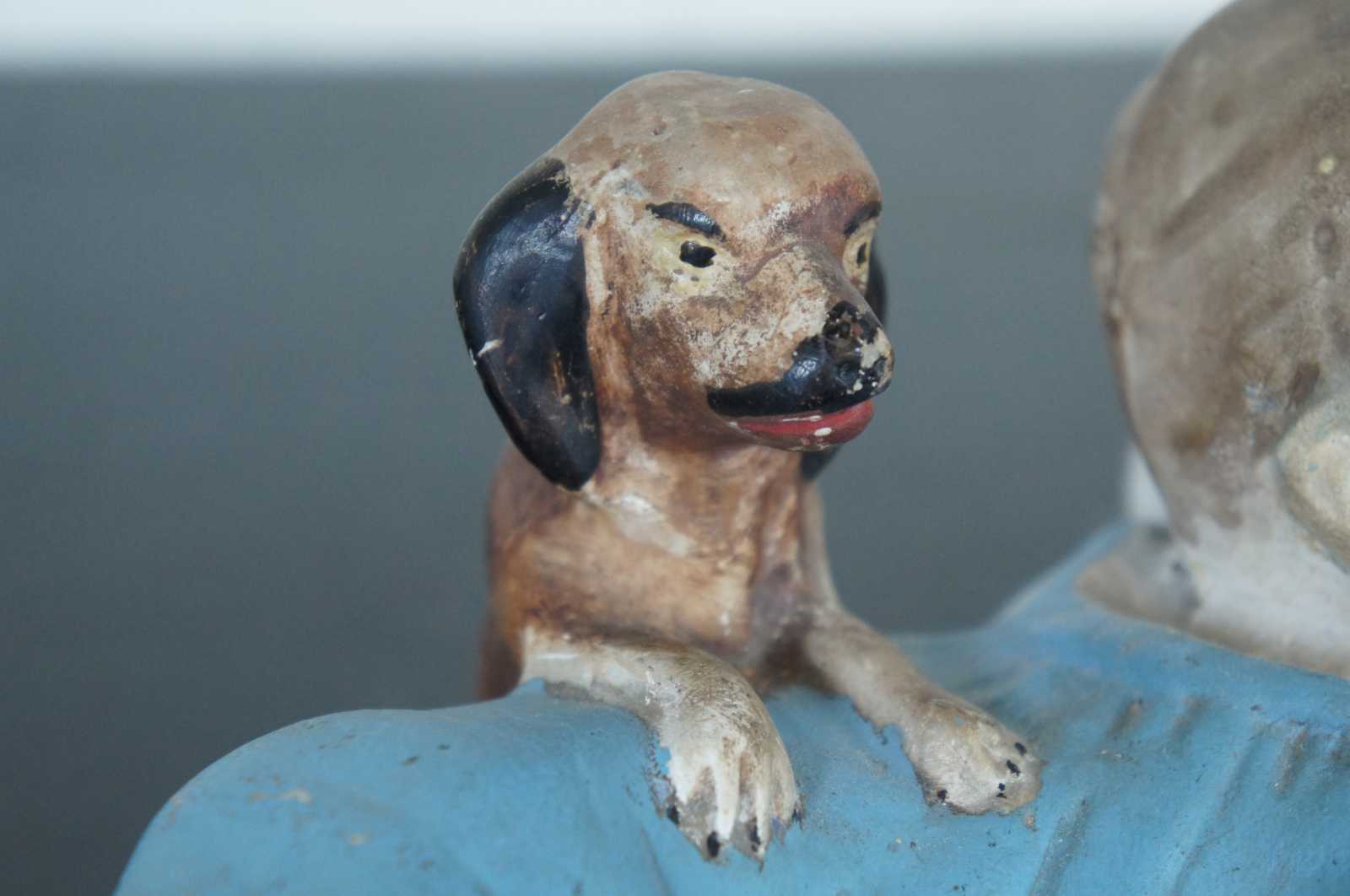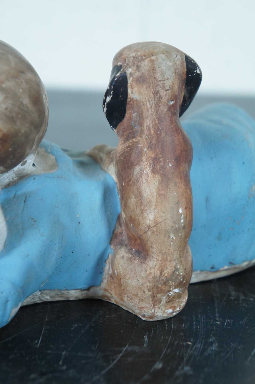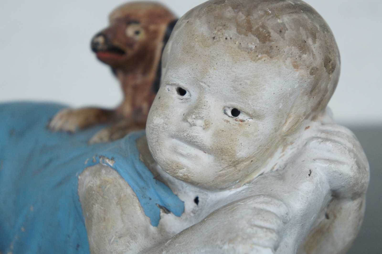 Antique 19th century piano baby figurine, shaped like a child reclining on a pillow with a brown dog. Piano babies were figurines used to hold a shawl in place over a piano.