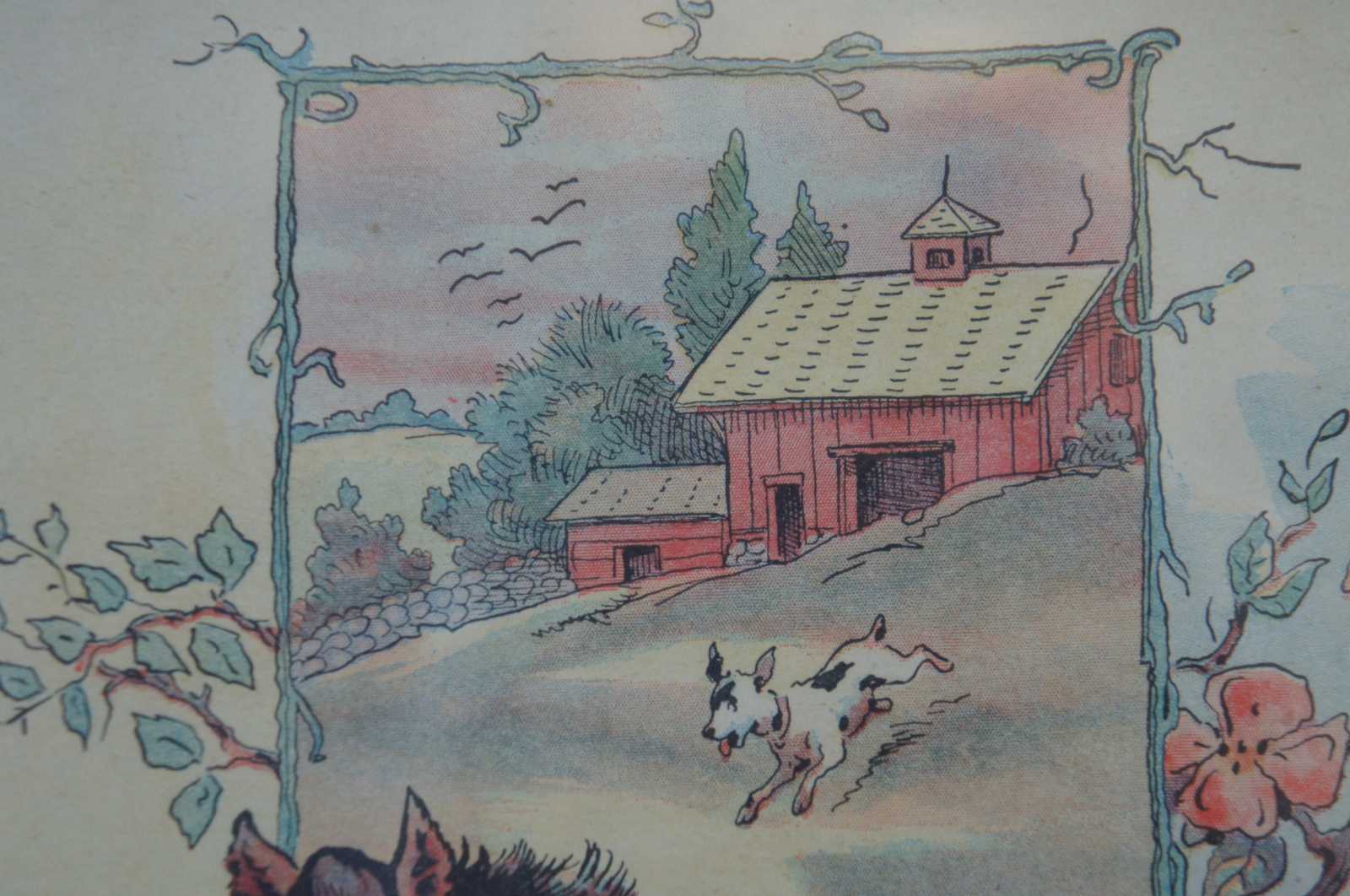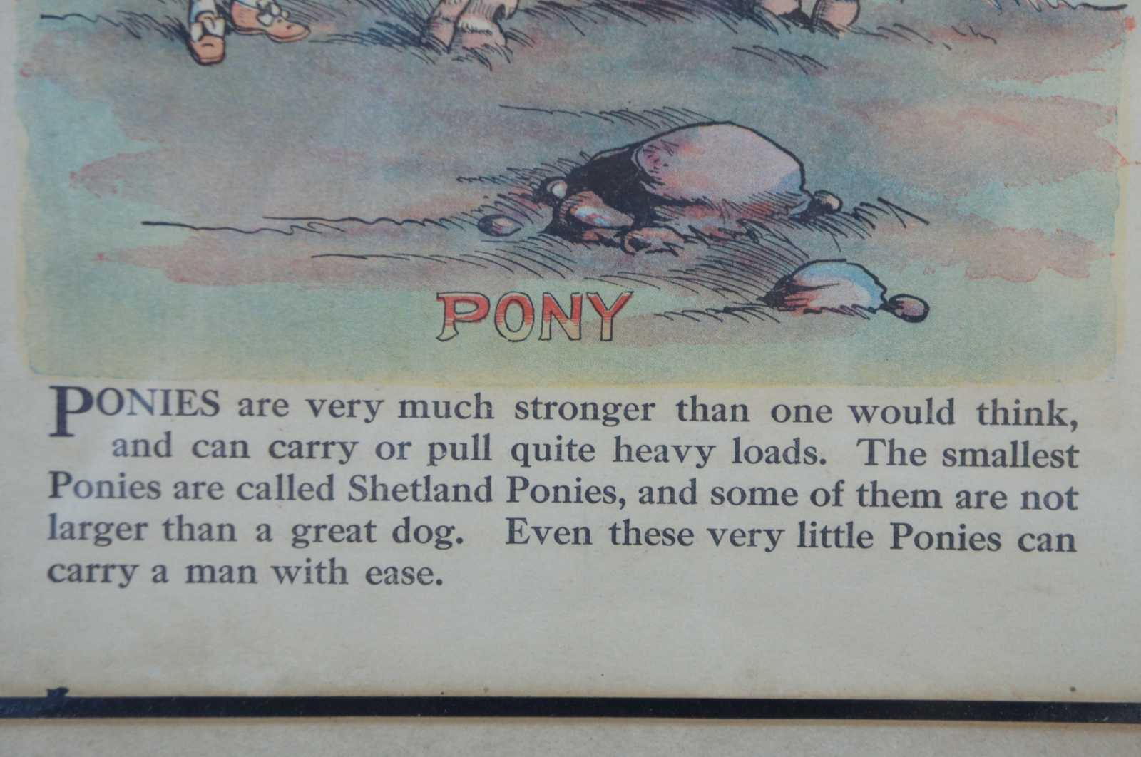 Framed 1915 antique storybook page about ponies. Features a girl with her pony and dog in a country farmhouse setting. It reads: "PONY PONIES are bery much stronger than on would think, and can carry or pull quite heavy loads. The smallest Ponies are called Shetland Ponies, and some of them are not largeer than a great dog. Eveen these very little Ponies can carry a man with ease".