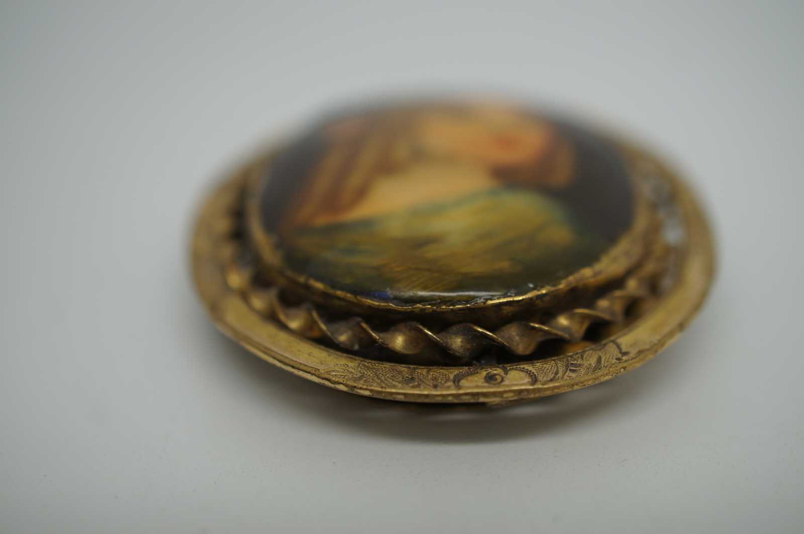 Antique hand painted cameo portrait of a young woman with blonde hair in sausage curls, set in a gold tone frame of twisted rope and floral accents.