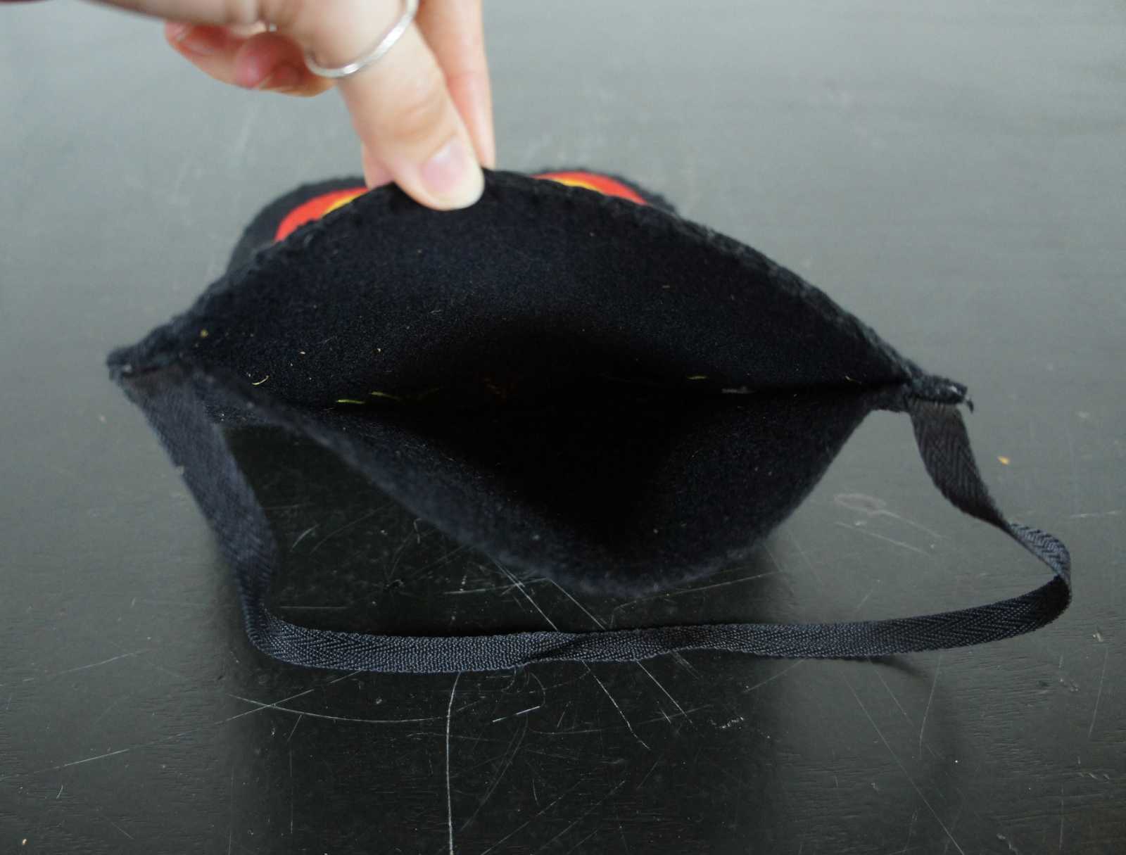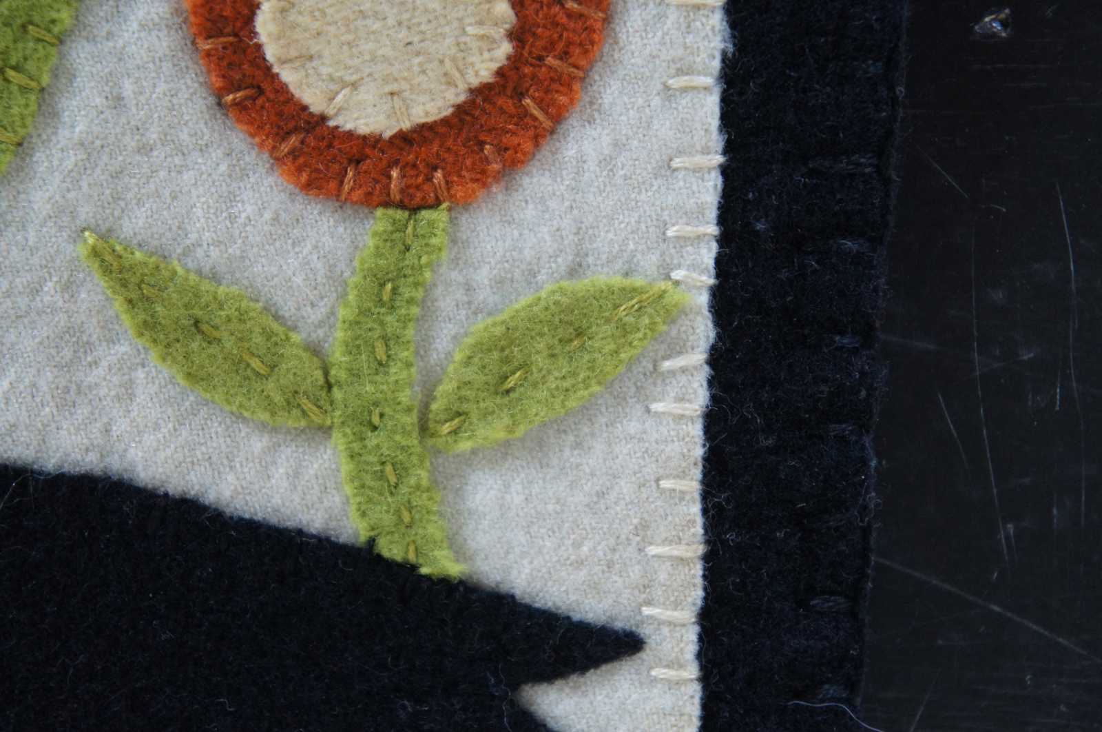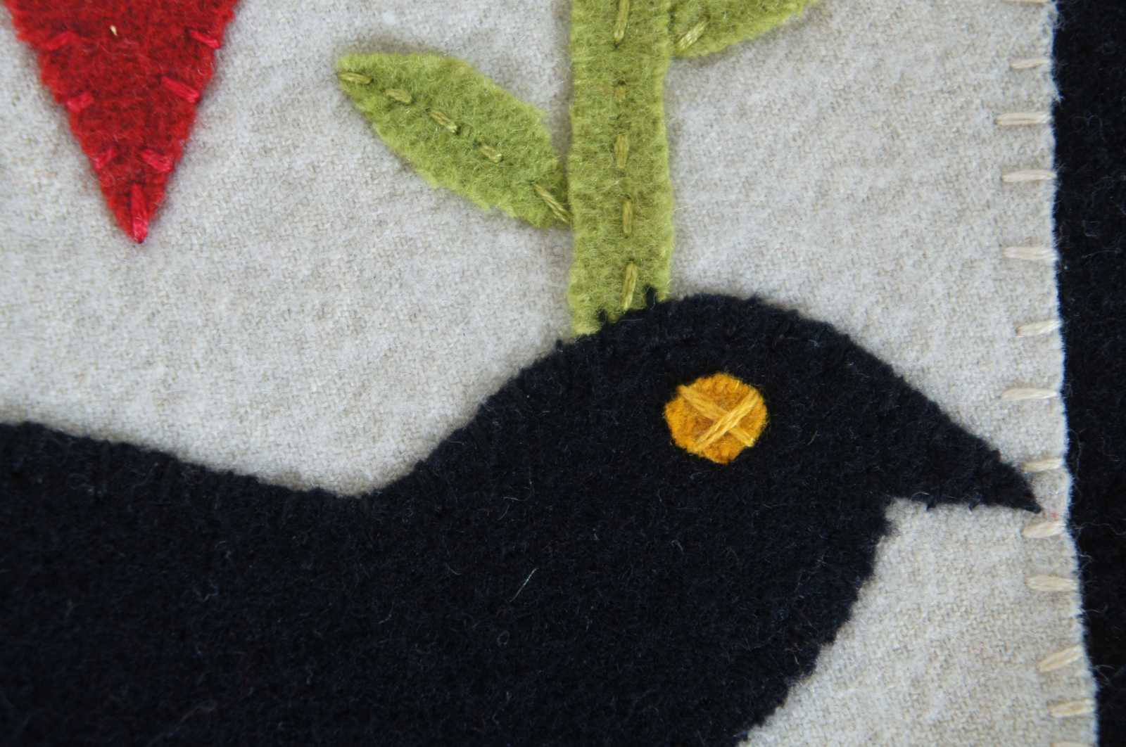 Handmade folk art felt bag with applique patch needlework construction featuring a black bird, red sunflower, heart appliques.