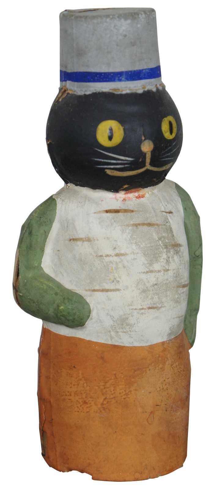 Antique German paper mache anthropomorphic candy container, shaped like a black cat with yellow eyes dressed in orange, green and white with a gray pill box hat, displayed in a wood base bell jar.