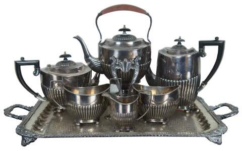 Antique art deco nine piece silver plated tea set by Sheffield, England’s Israel Freeman & Son Ltd. Working in London at the beginning of the 20th century and moving to New York City in the 1920s. The company was still in business in NYC in 2006 and being run by a mother/daughter team. According to their website (now closed), the mother/daughter are descendants of Isaac Freeman and, at the time, were still selling small silver items. Hammer and fist mark I.F.S LTD Made in Sheffield England EPNS 1145.