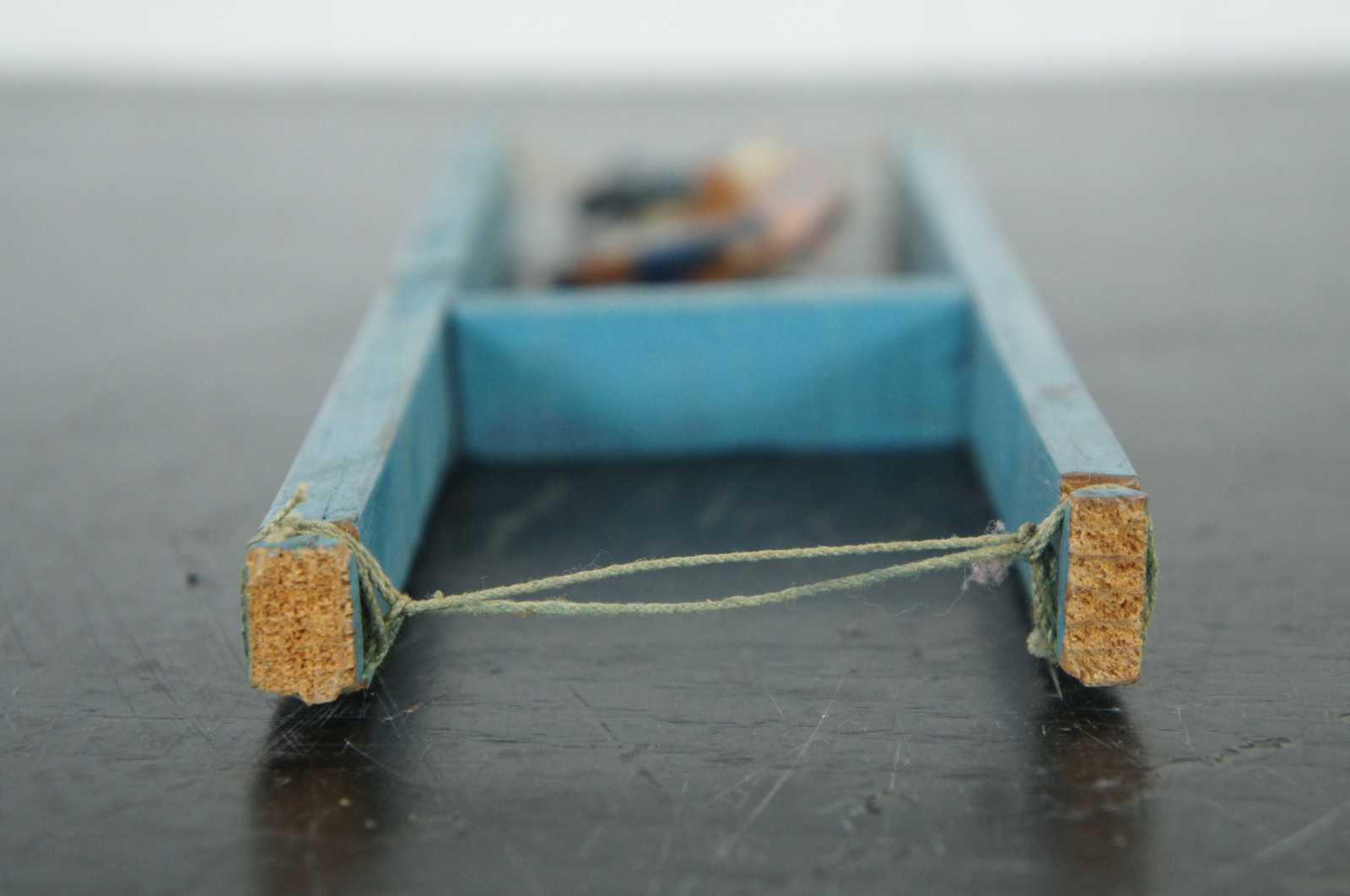 Antique wooden circus acrobat figure in blue and orange.