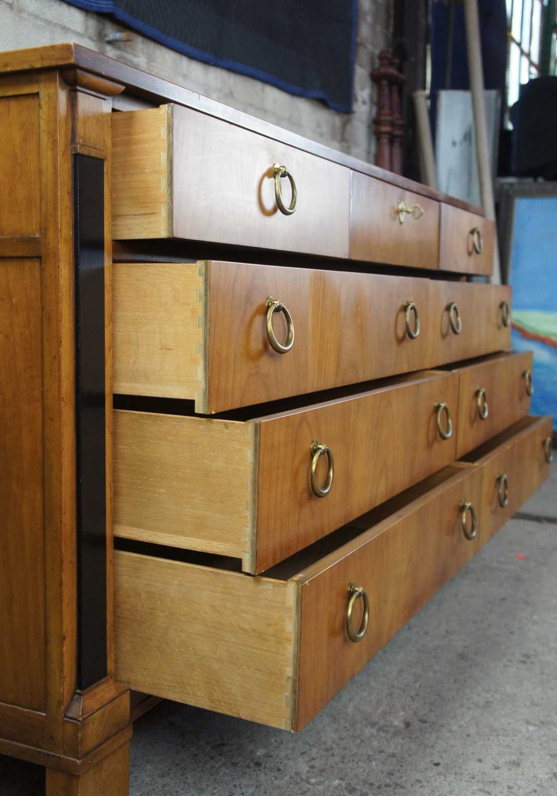 Circa 1960s Baker Furniture Neoclassical inspired chest of drawers. Made from Fruitwood with ebonized mounts along the outside, nine drawers and brass hardware.