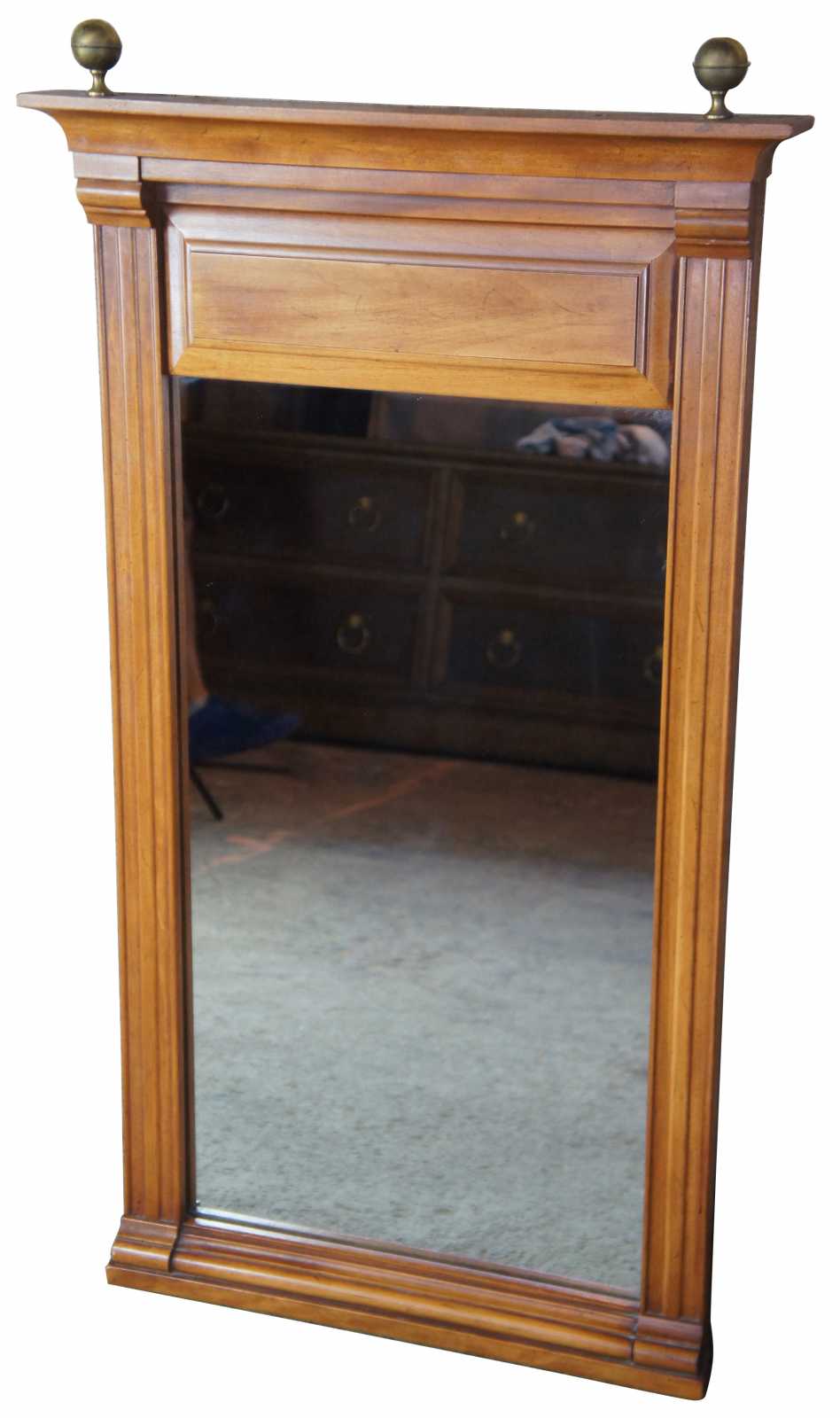 Circa 1962 Fruitwood wall hanging mirror by Baker furniture. Great for use along a dresser or on the wall. #7761.