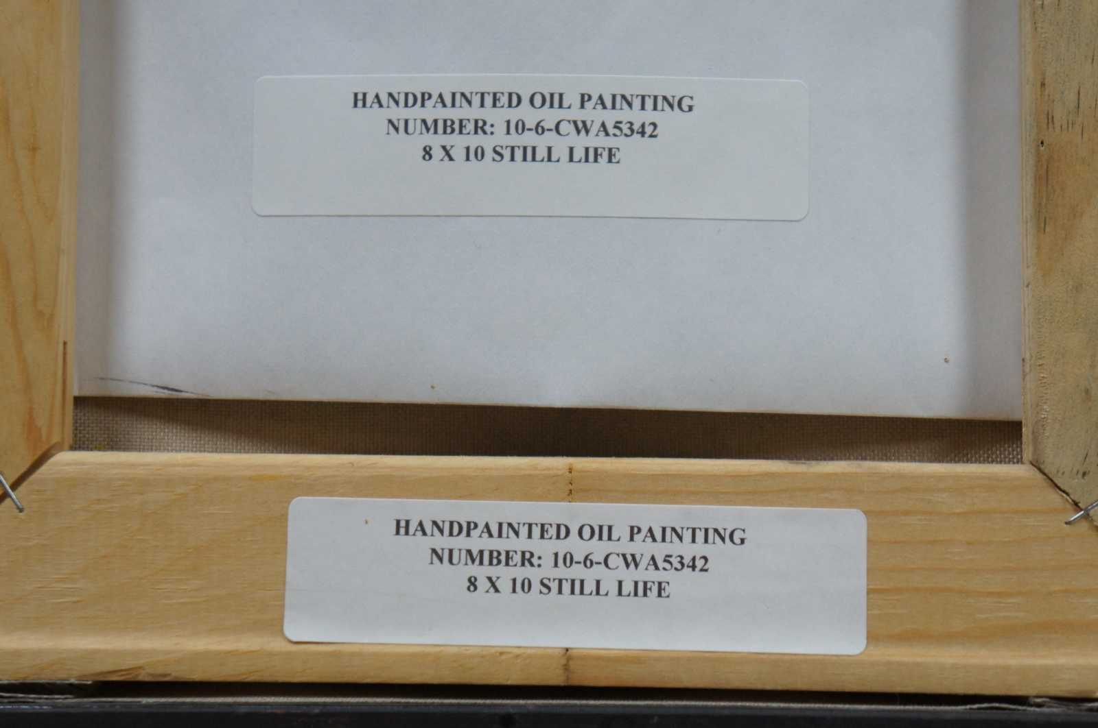 Two hand painted oil on canvas paintings by R. Patterson, one featuring a tankard, bowl and cherries; the other featuring a vase and cherries. R. Patterson was born in 1938 in England. A contemporary artist who studied at Oxford University and futherered his education in France.