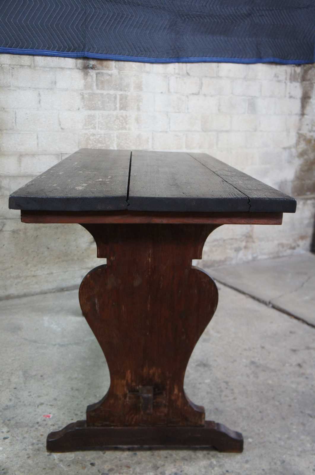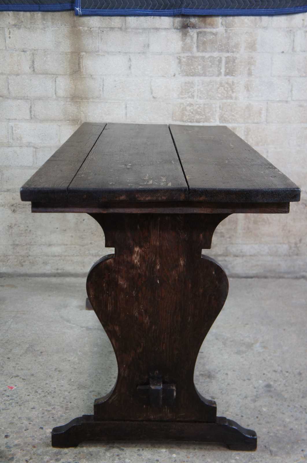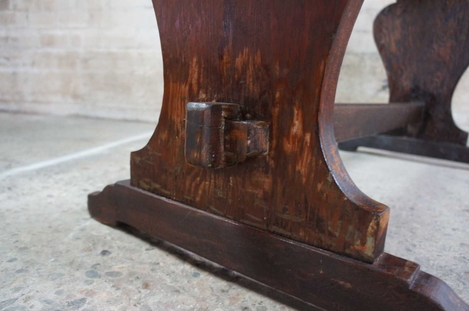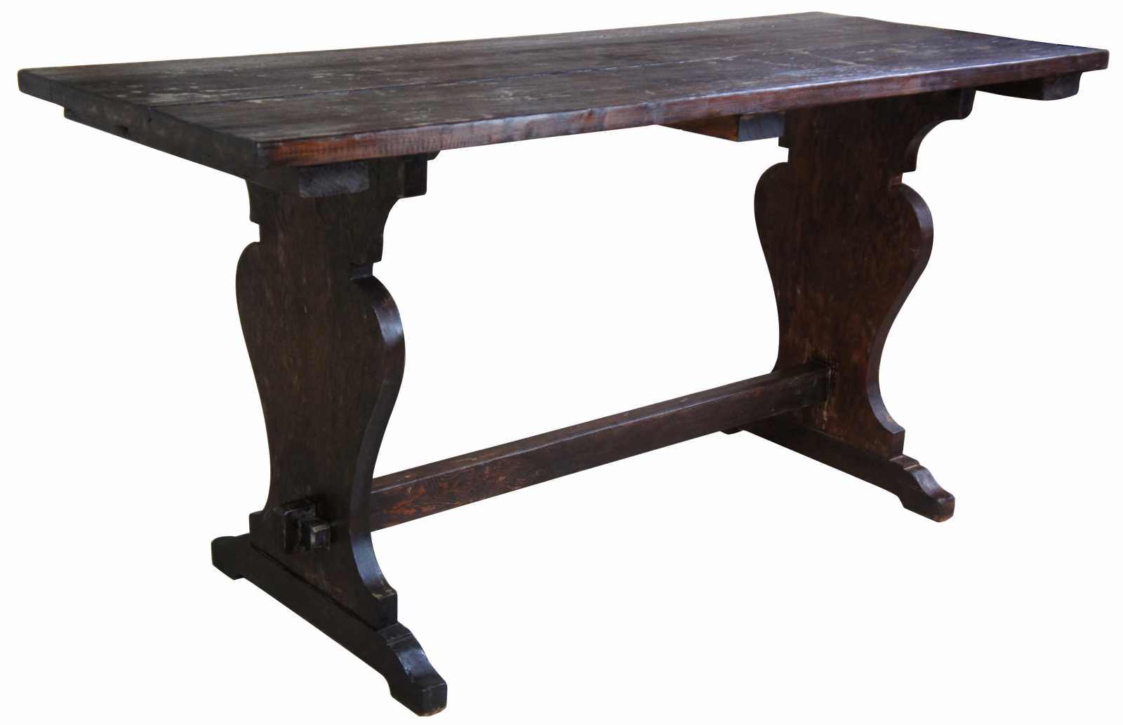 Vintage trestle table or desk. Features old world or farmhouse styling with rustic wood top and trestle base.