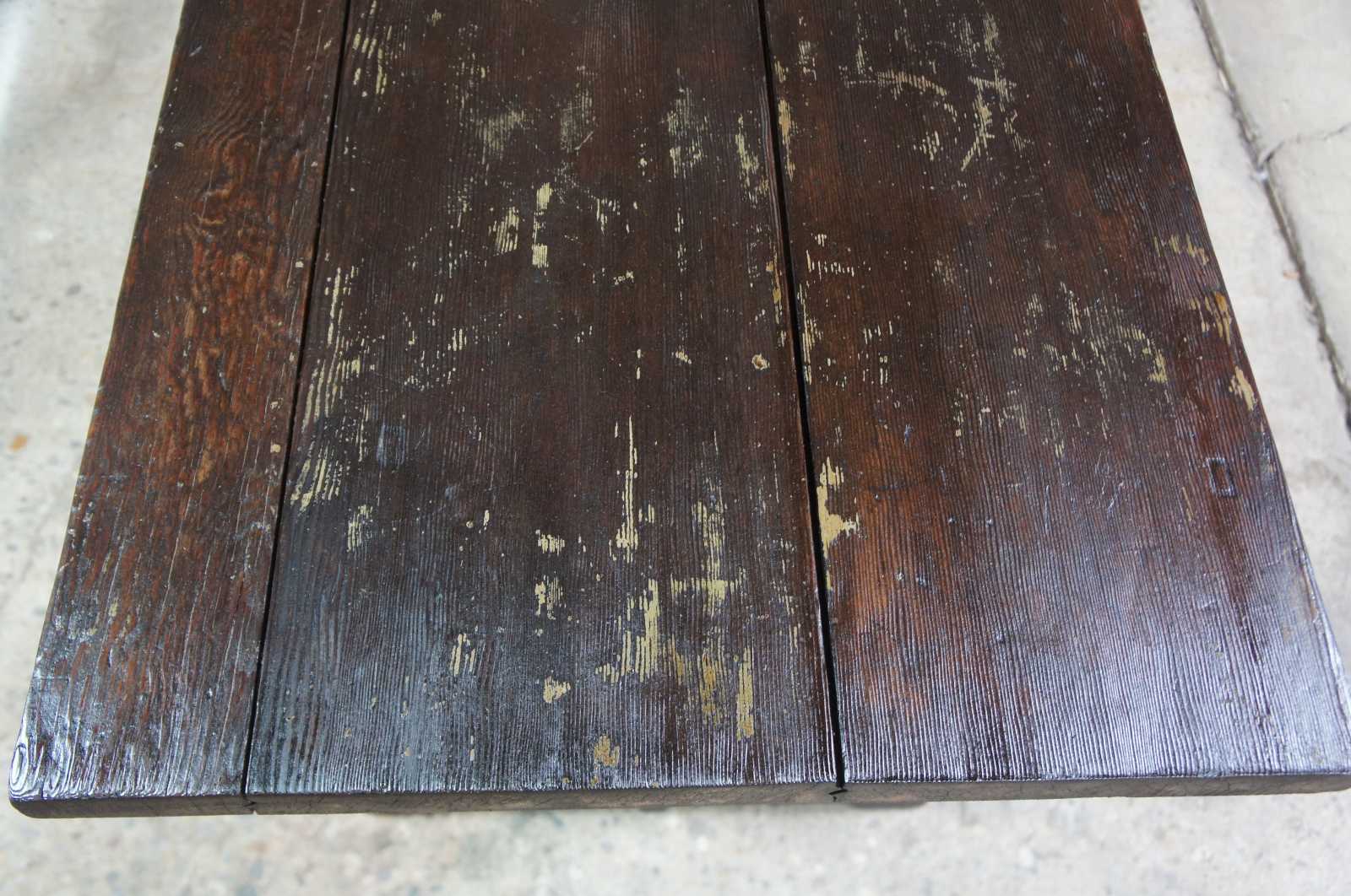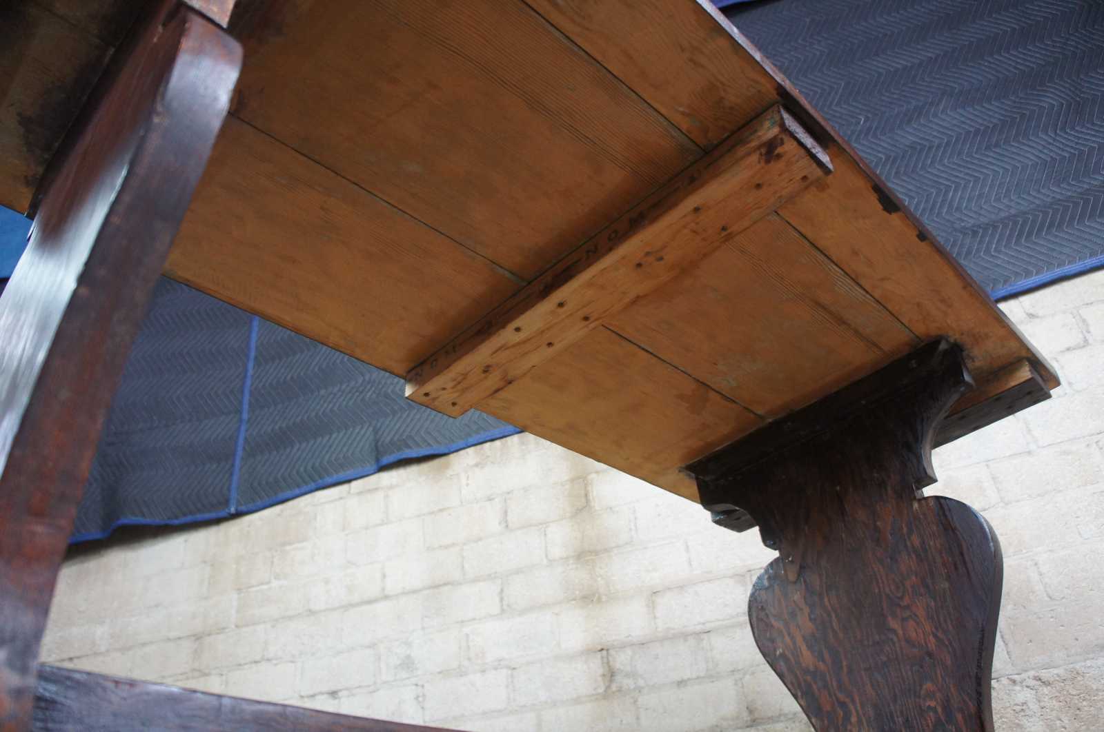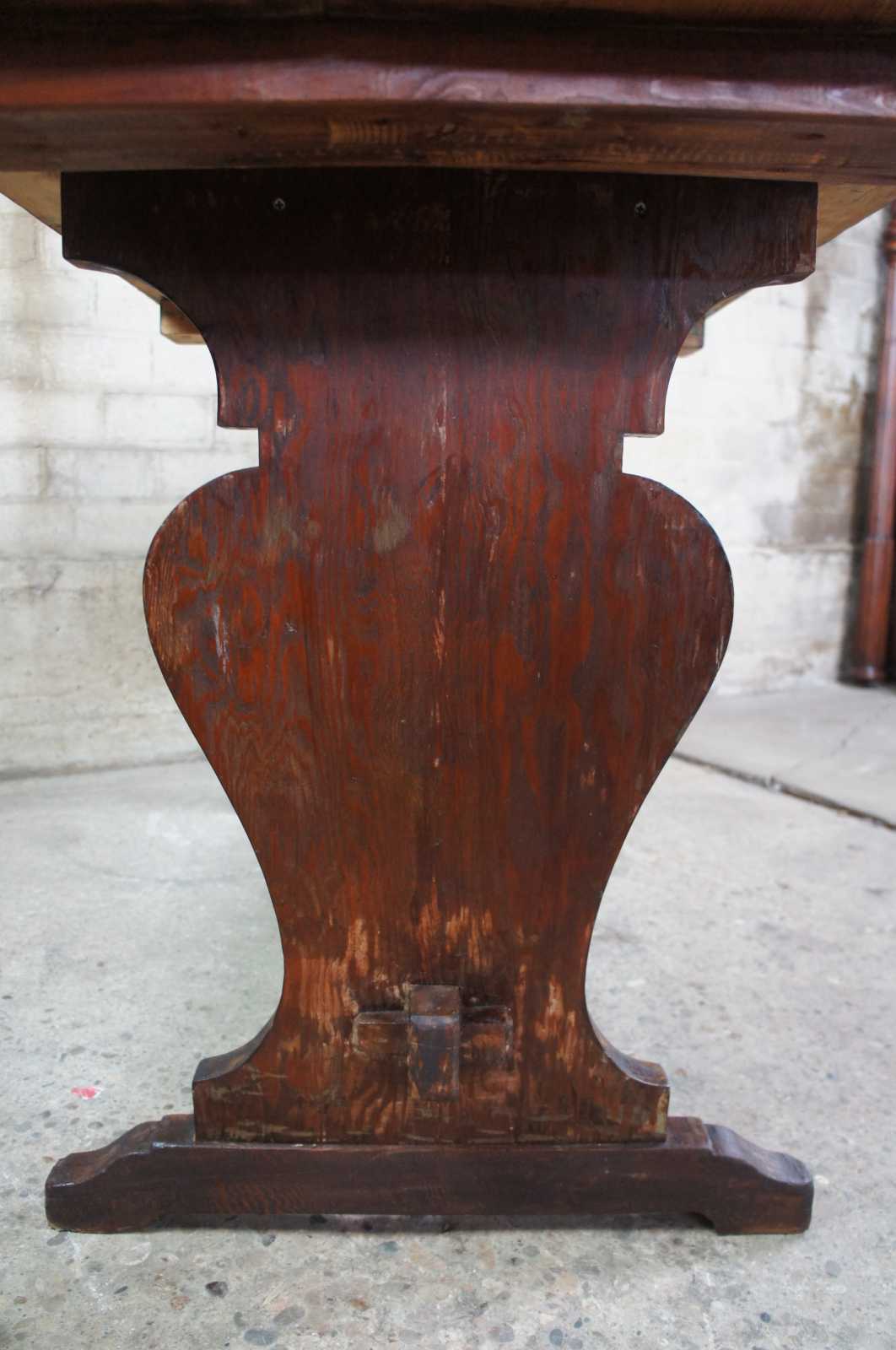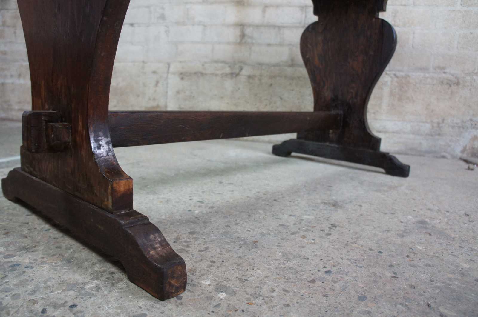 Vintage trestle table or desk. Features old world or farmhouse styling with rustic wood top and trestle base.