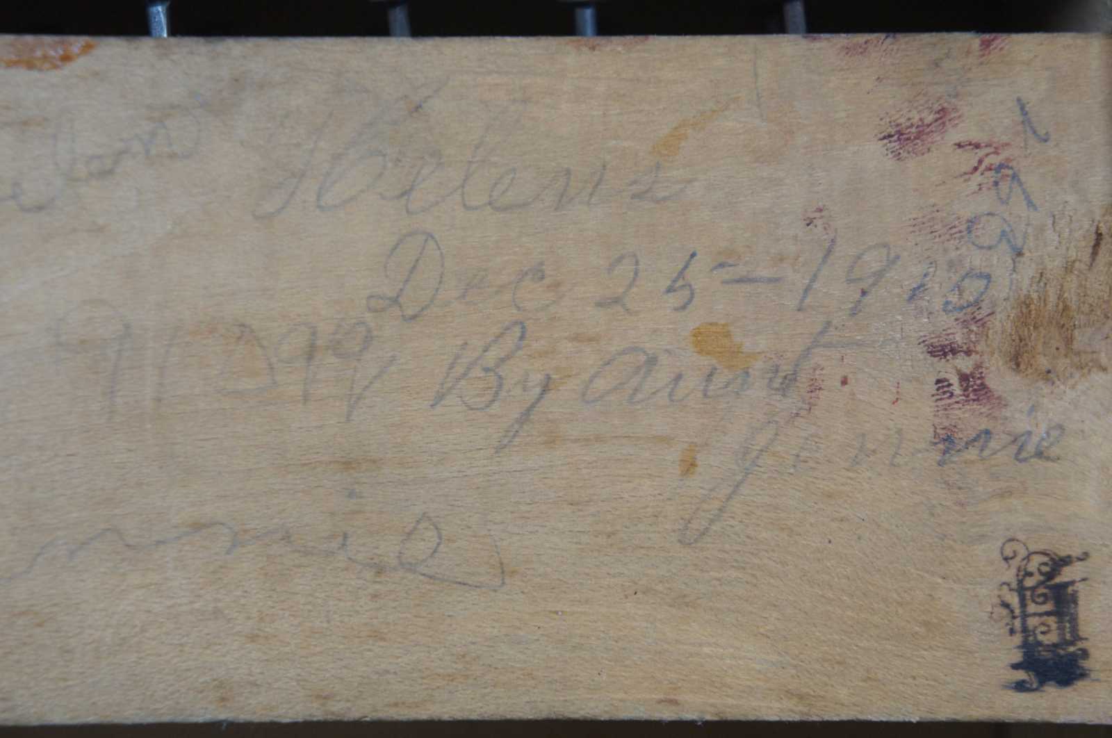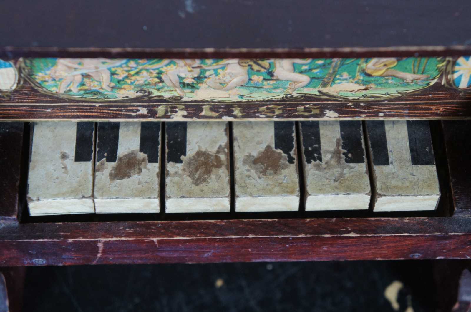 Antique German Bliss toy piano with a six note glockenspiel and lithograph image of cherubs playing instruments.
