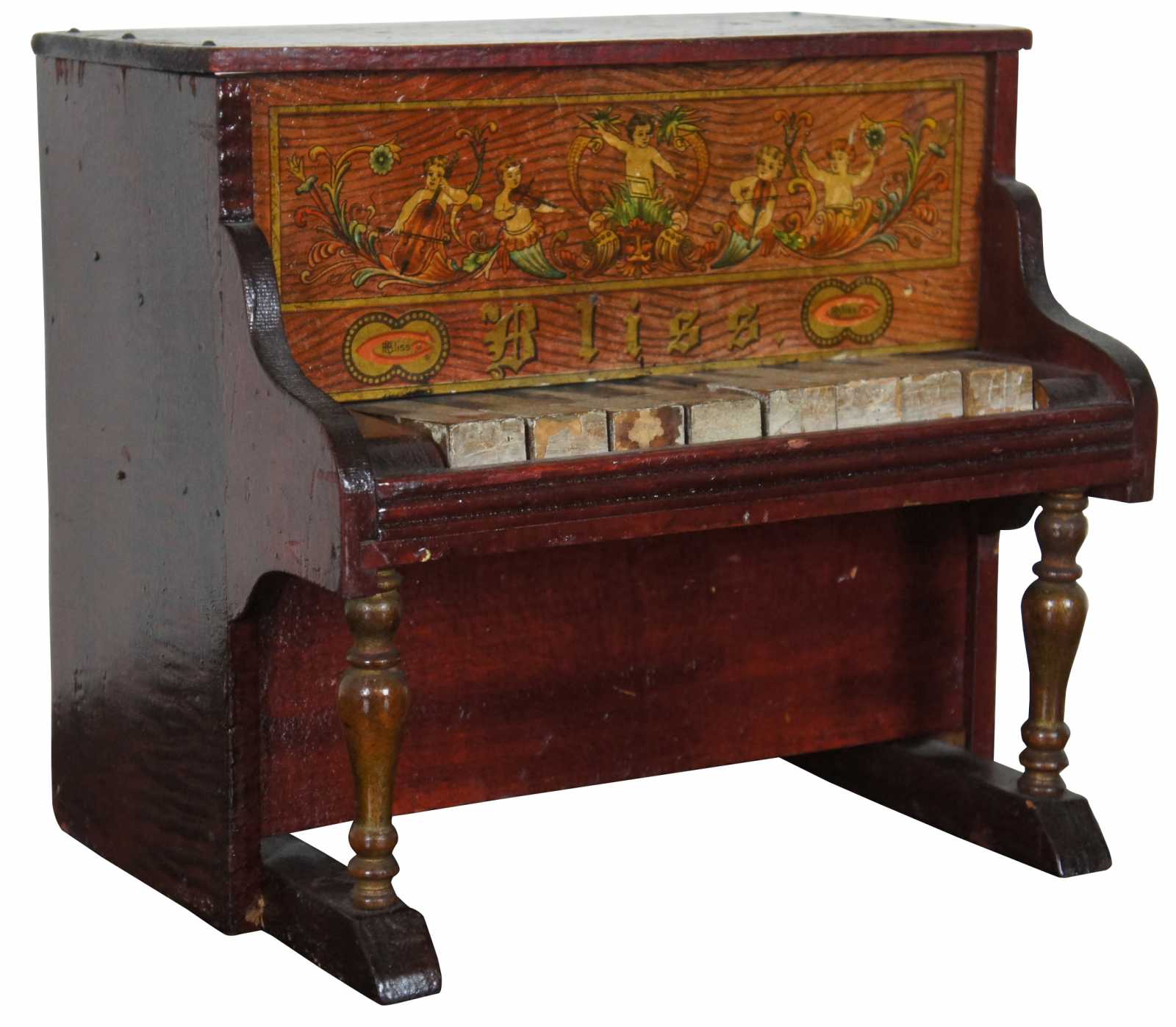 Antique wooden toy upright piano by Bliss with lithograph print featuring an orchestra of cherubs. Eight working wooden keys that strike on a miniature glockenspiel inside.