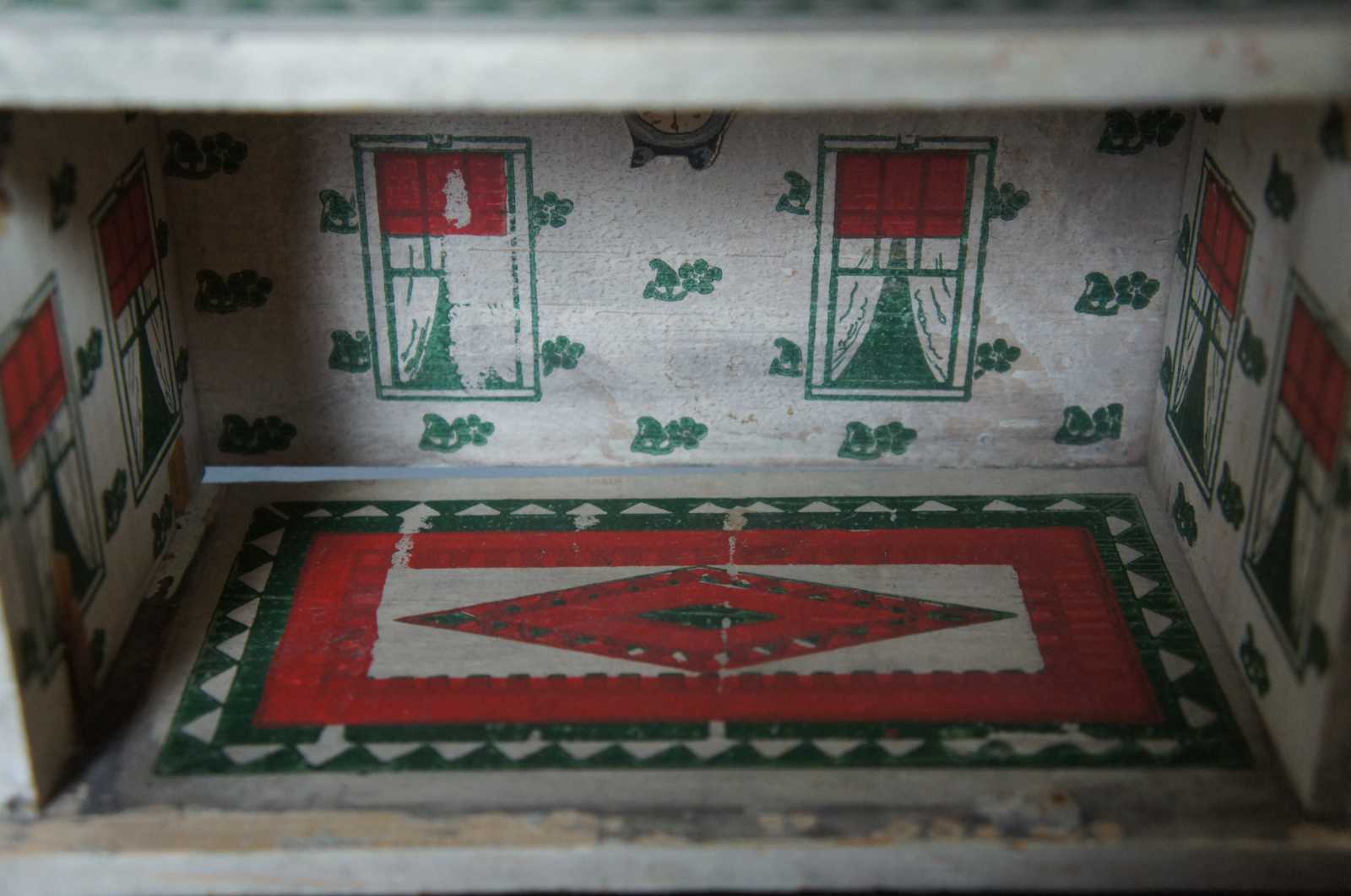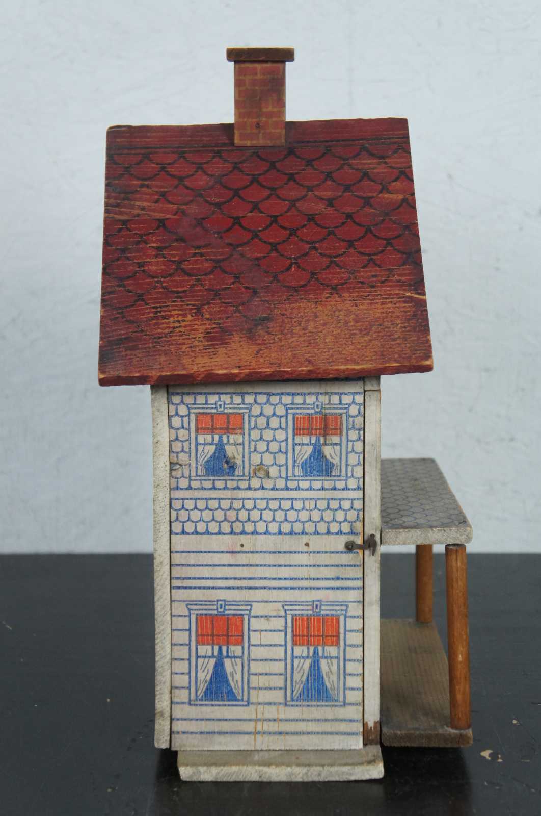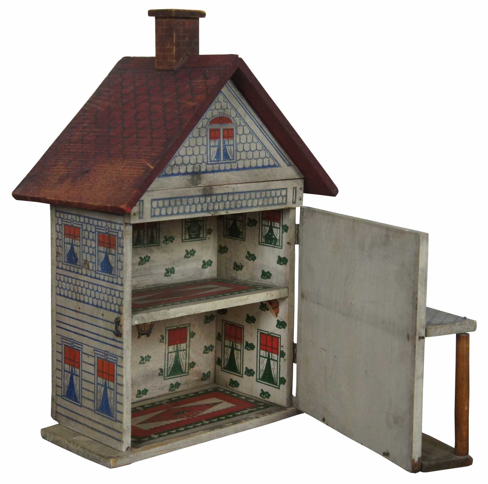 Antique wooden white doll house with red roof, screen printed blue and red details and flat roofed front porch. Front opens to reveal two levels decorated in red and green.