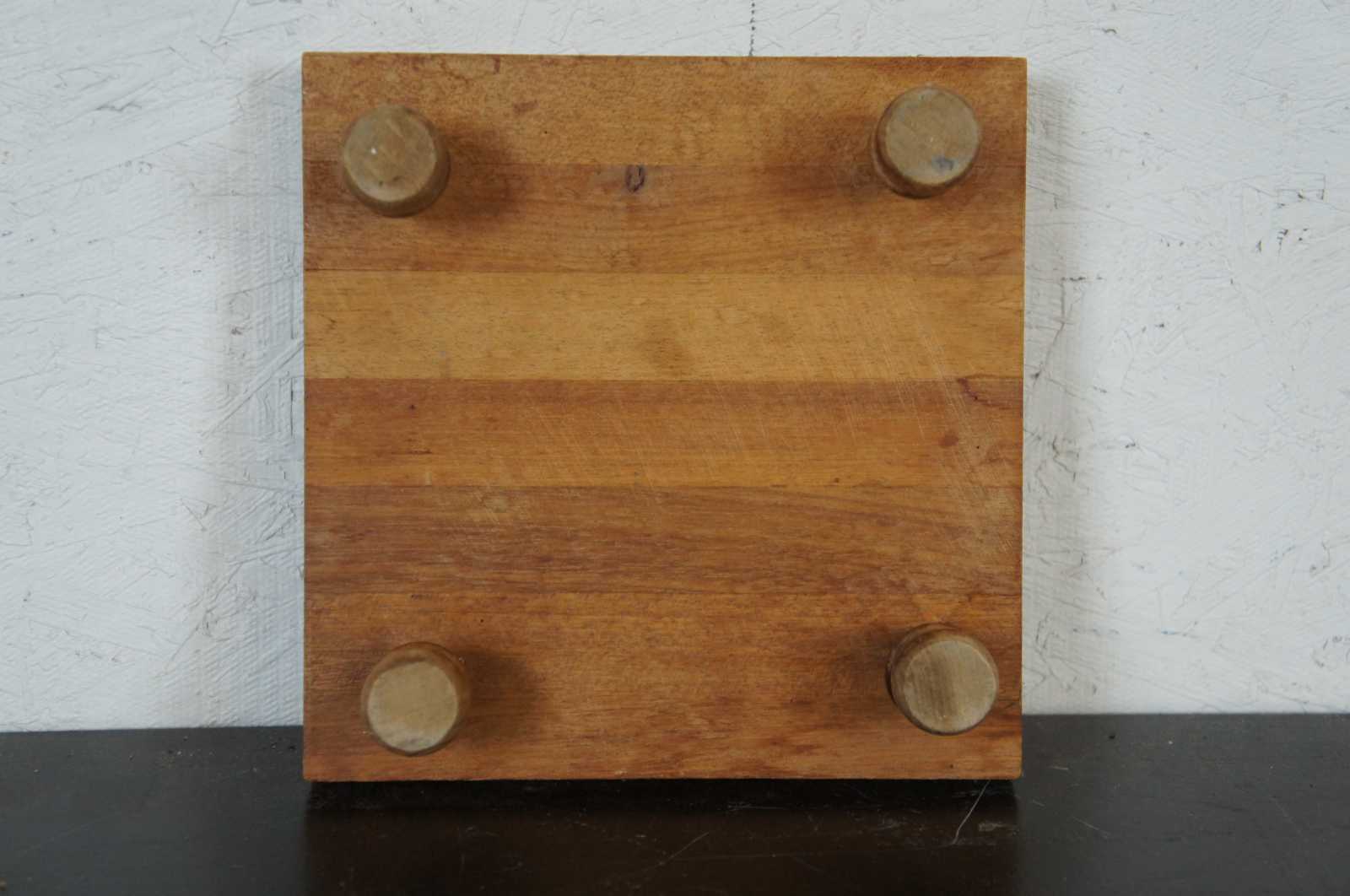 Rustic wood block trivot or board. Great for use as a cutting board, hot plate, or for serving guests. Features turned bun feet.