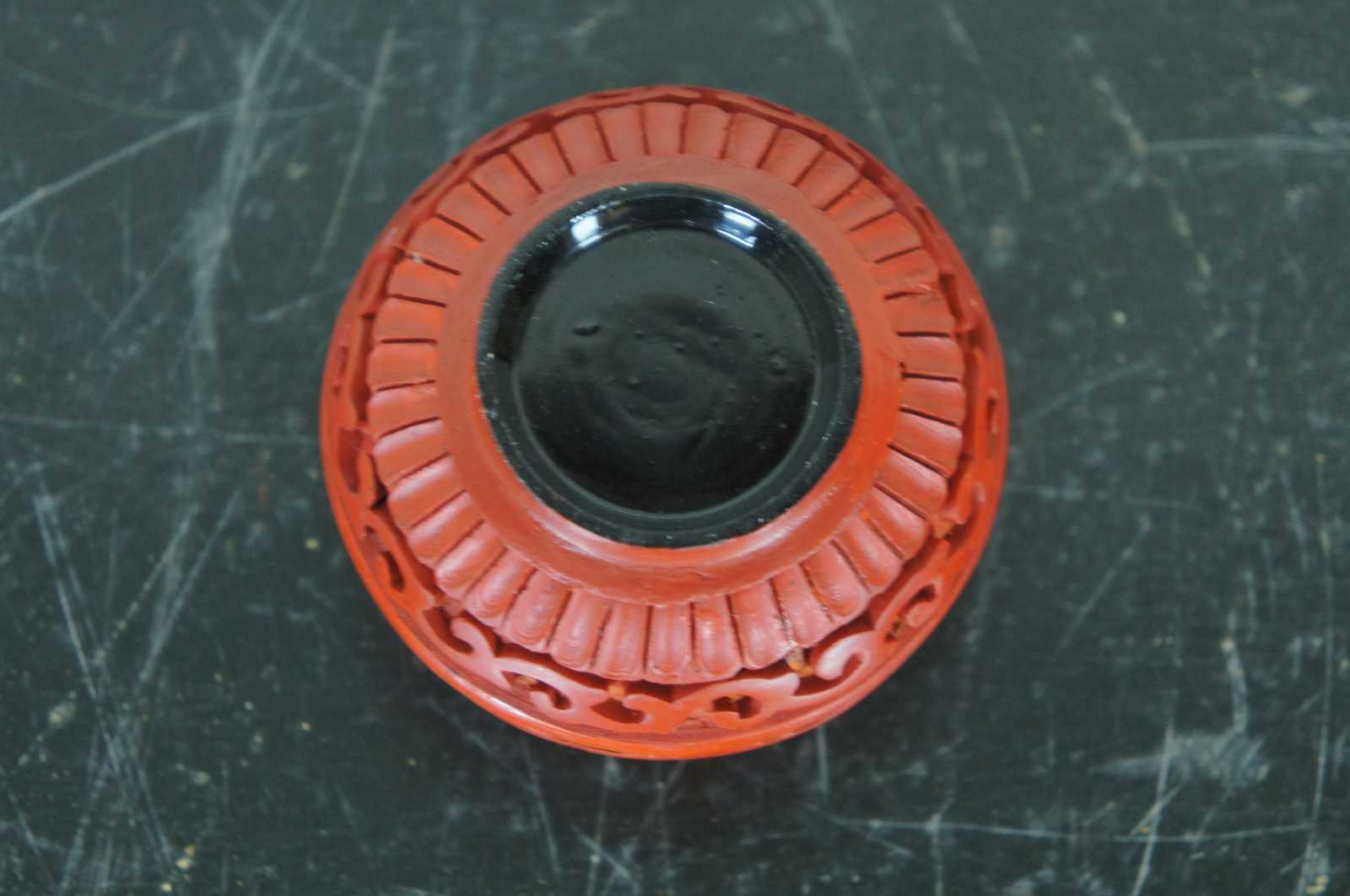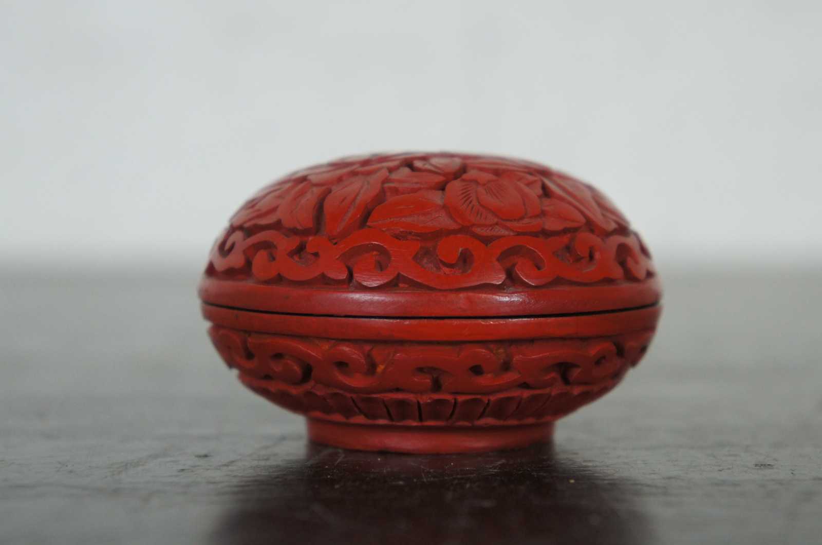 Antique carved red lacqured trinket or jewelry box. Features floral Chysanthemums carved in the exterior with black lacquer interior.