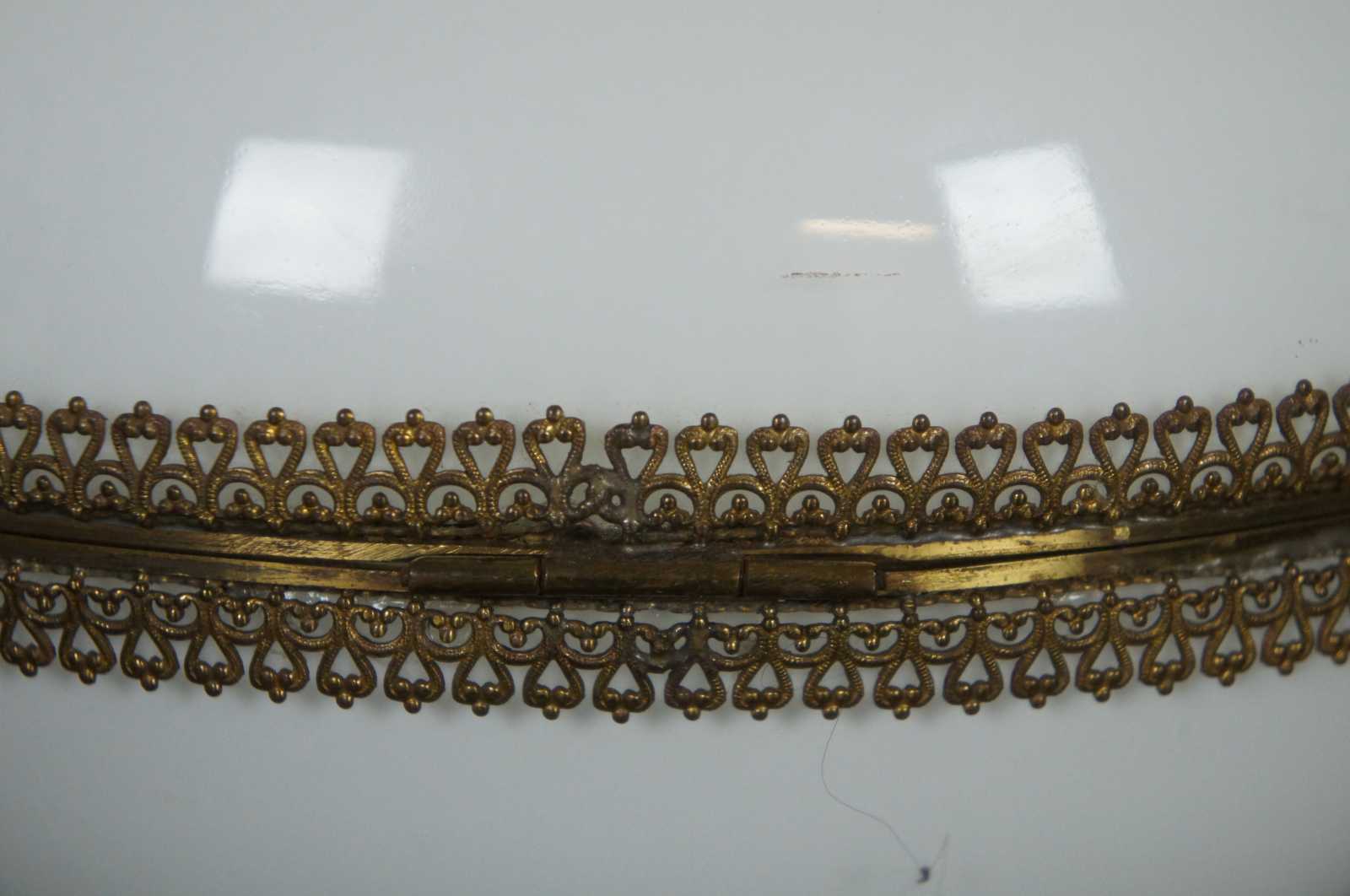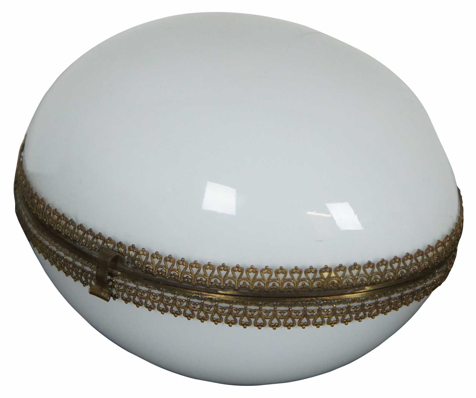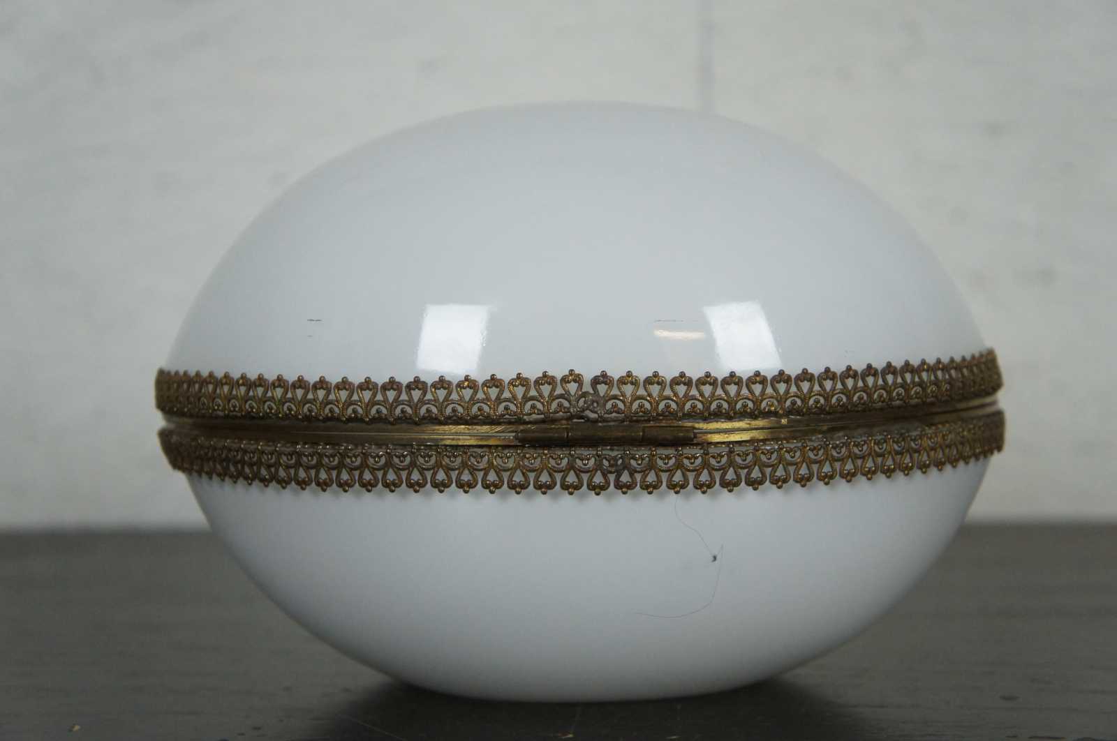 Antique French Victorian white Opaline glass and bronze accented hinged jewelry casket or box. Features and egg shape with bronze gallery, opening to keepsake area, resembling a large limoge.