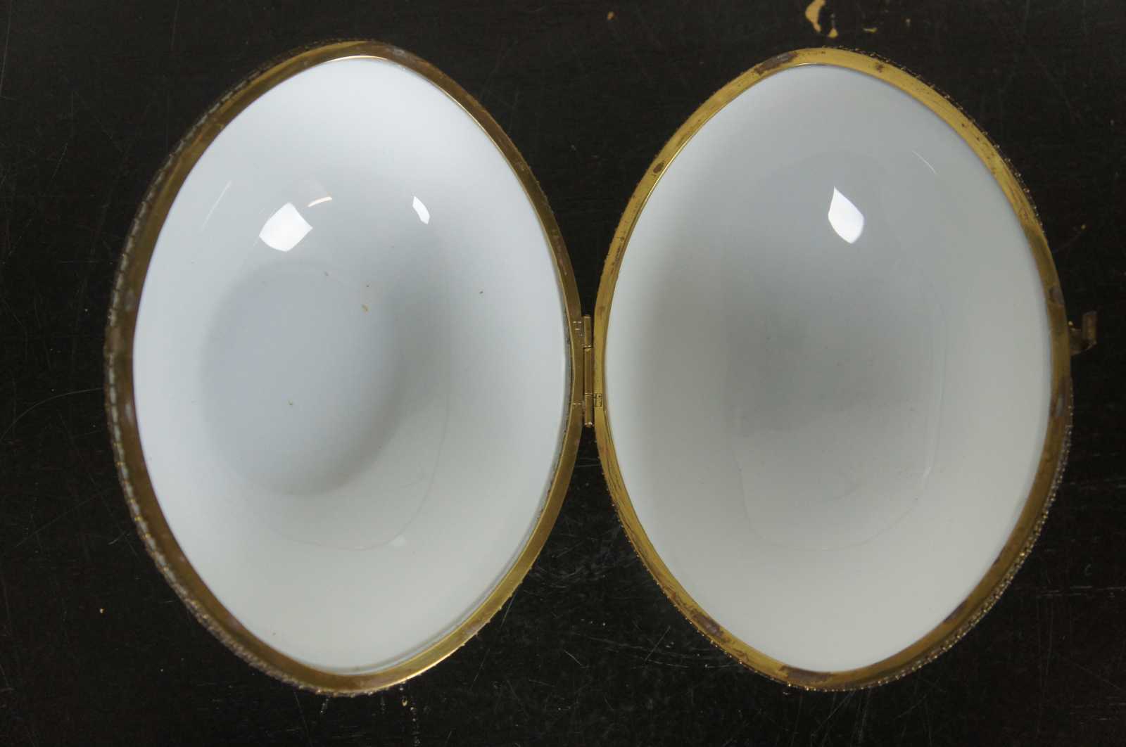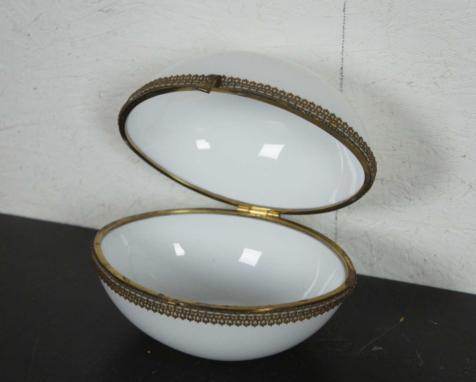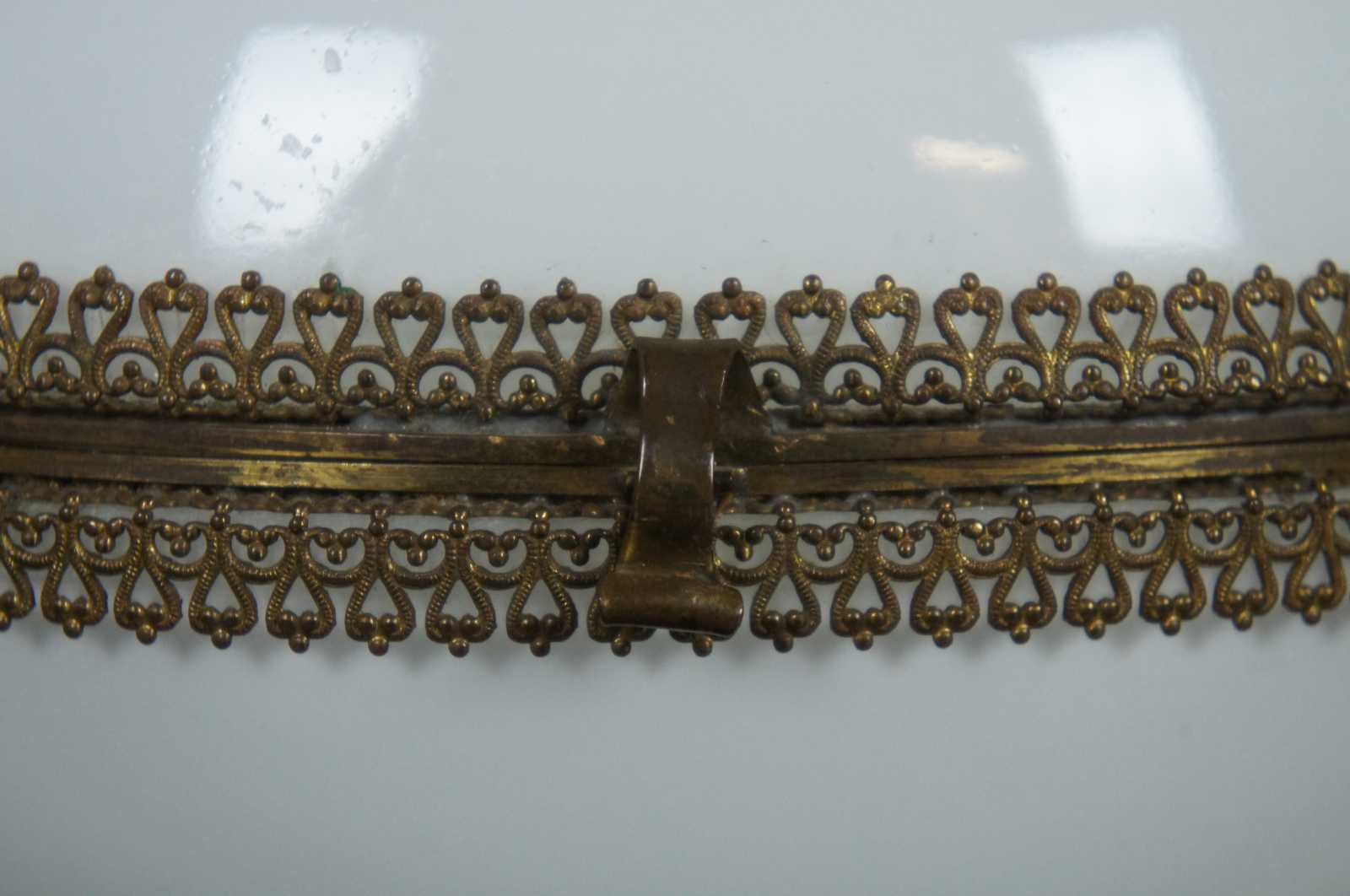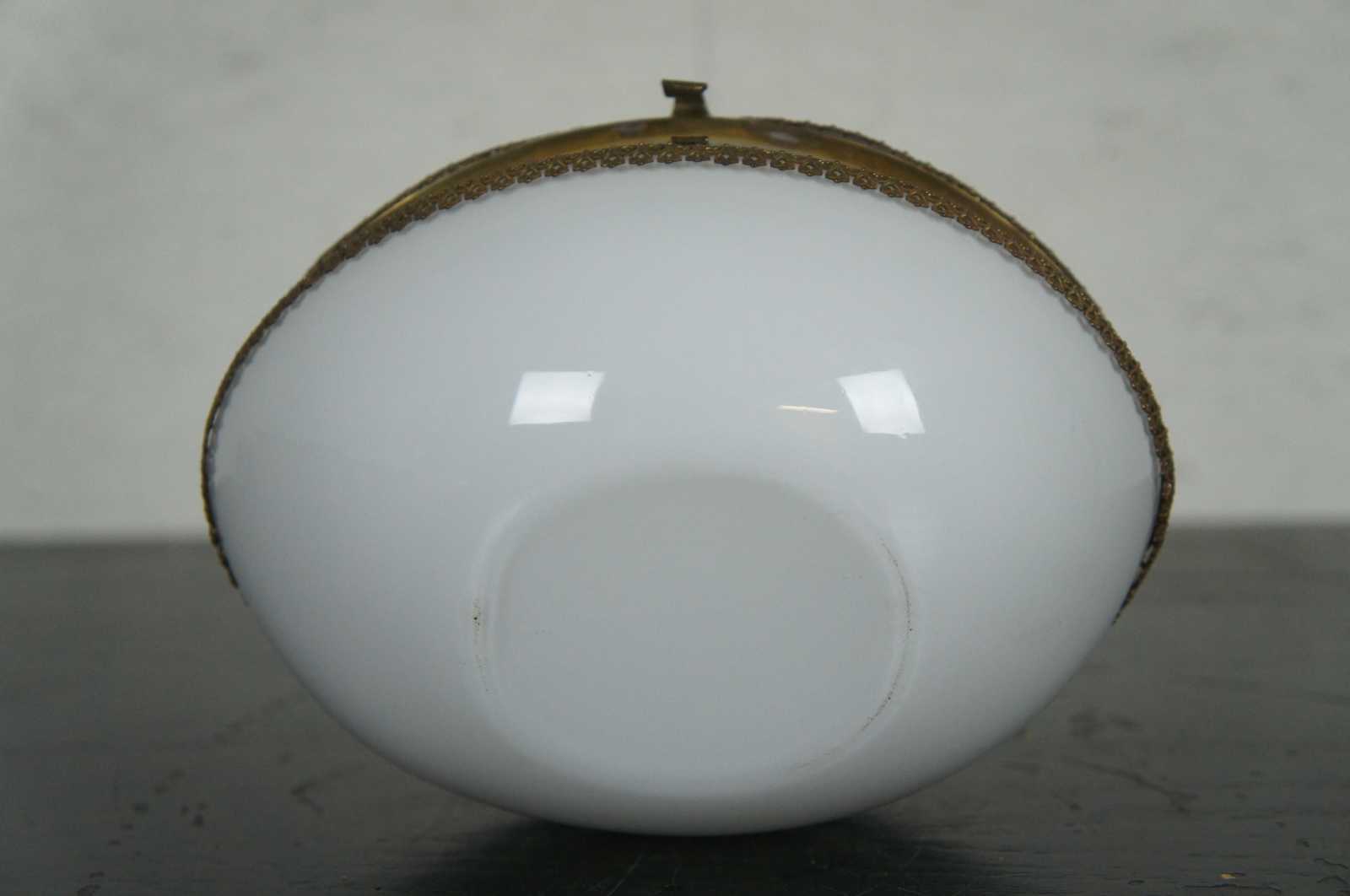 Antique French Victorian white Opaline glass and bronze accented hinged jewelry casket or box. Features and egg shape with bronze gallery, opening to keepsake area, resembling a large limoge.