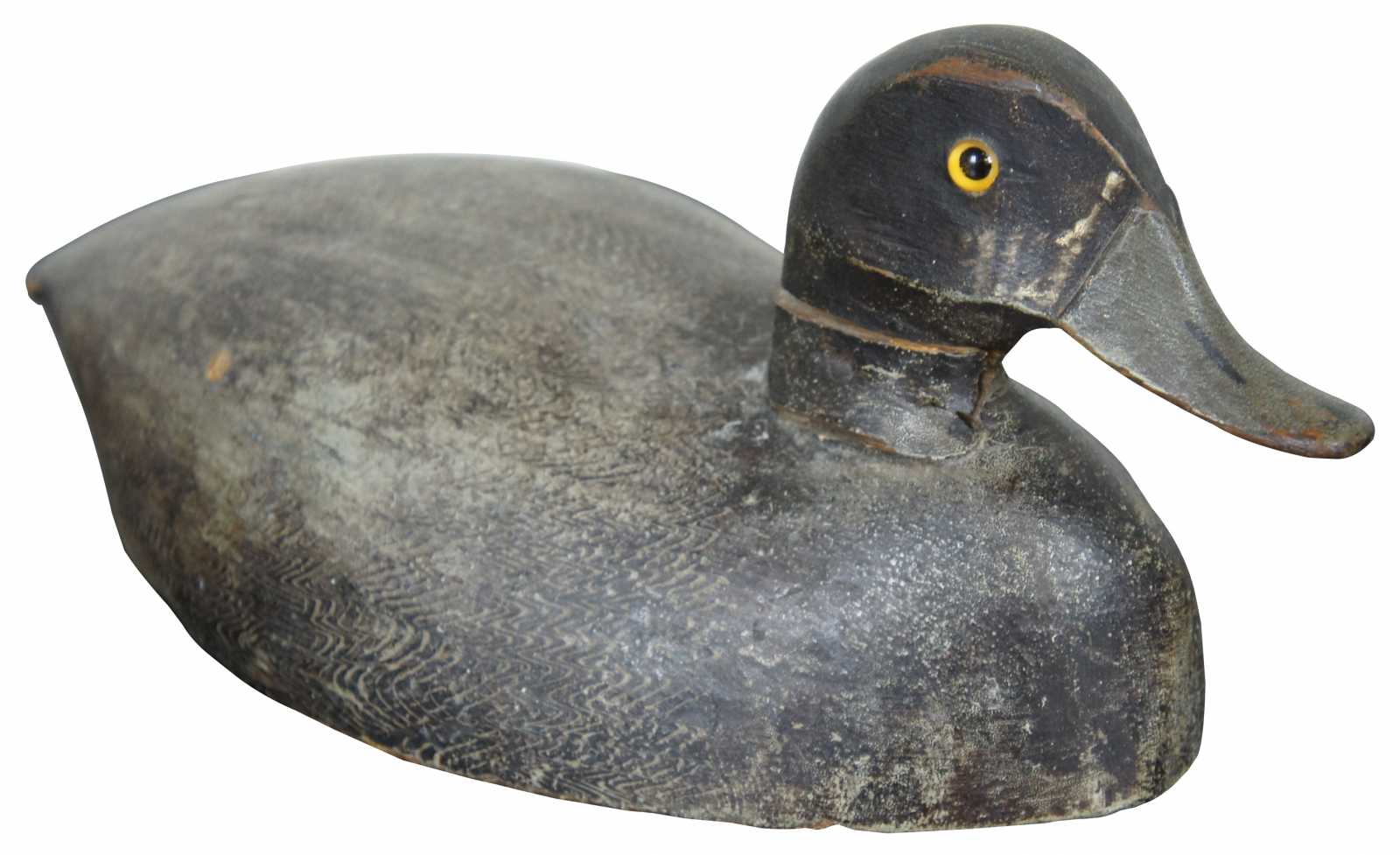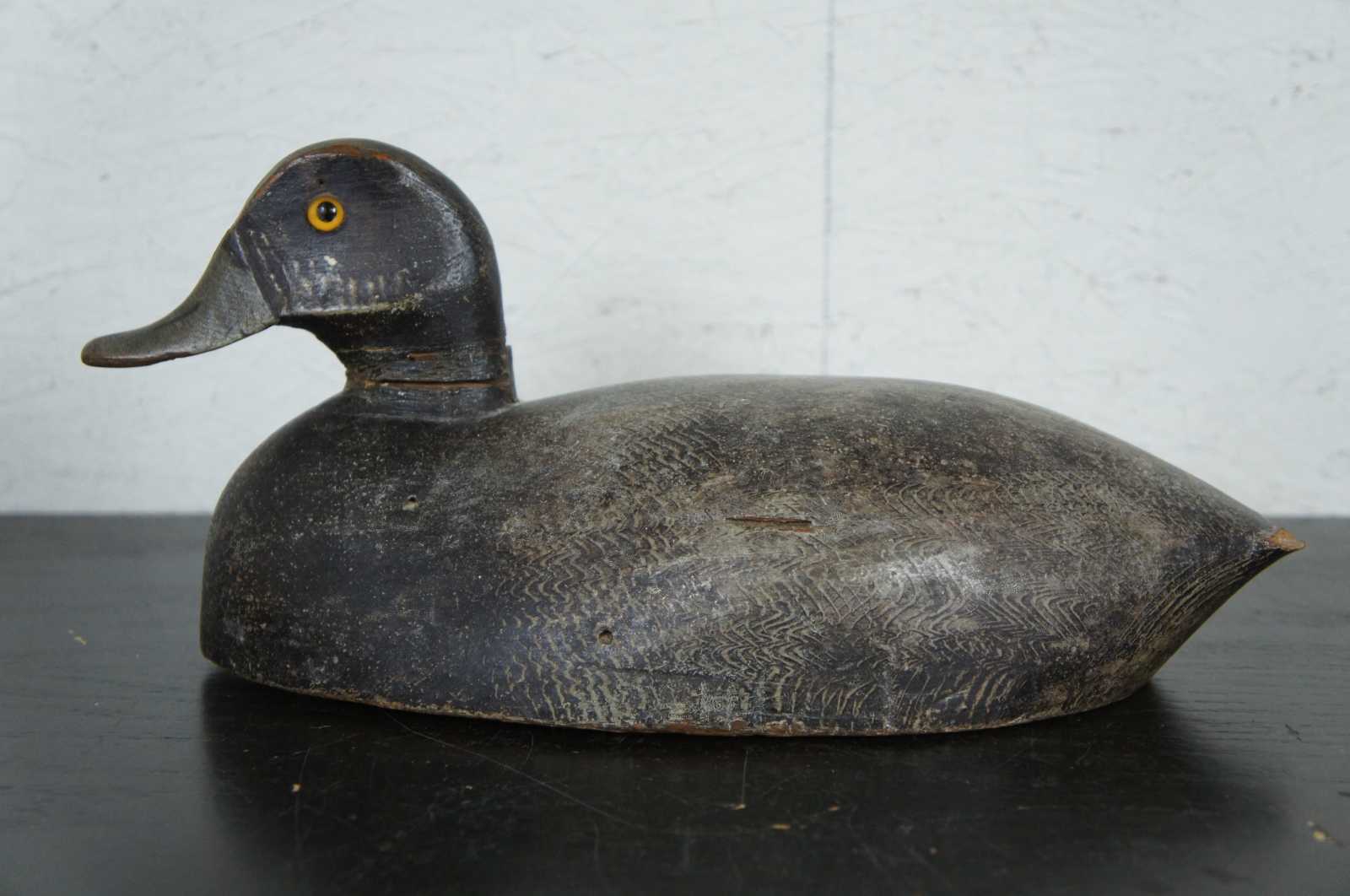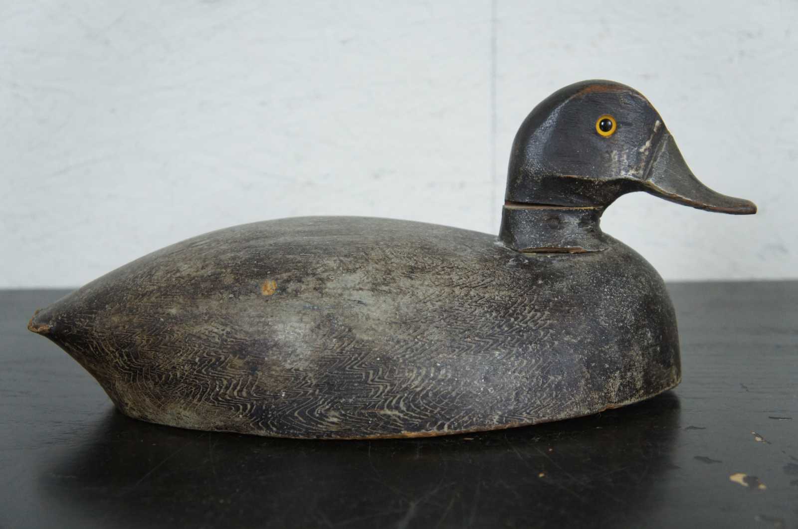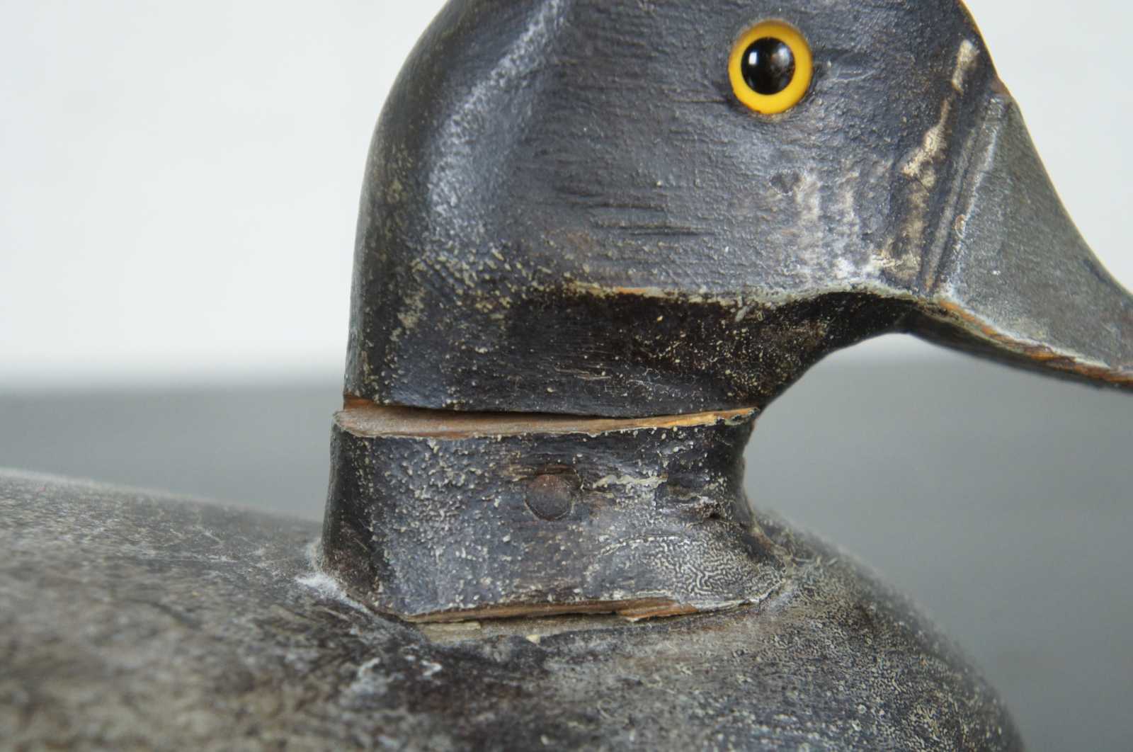 Distressed antique folk art carved wooden and painted duck decoy with yellow glass eyes.