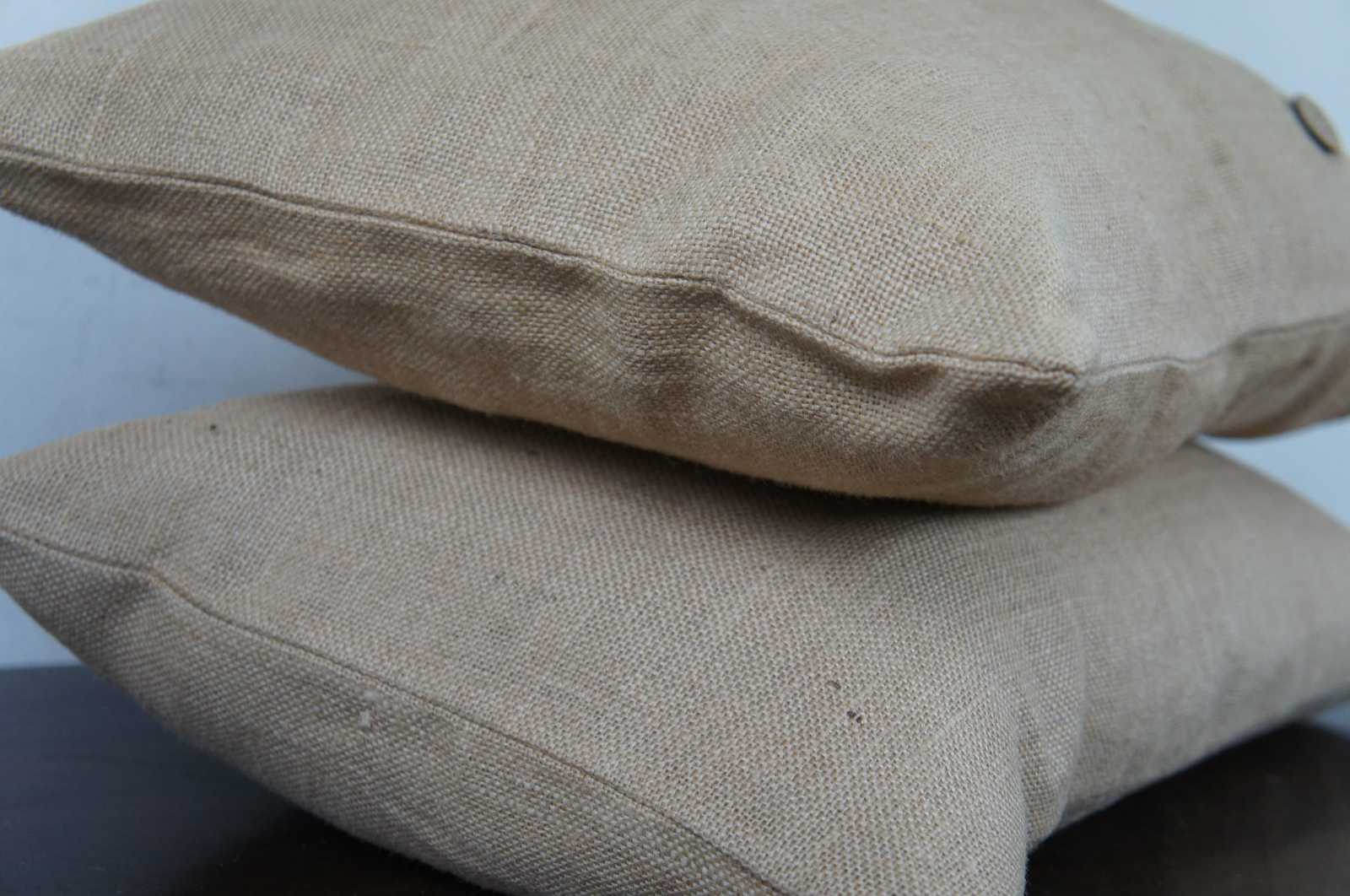 Set of two Pottery Barn unused down filled lumbar throw pillows, with rustic kenaf covers with coconut buttons.
