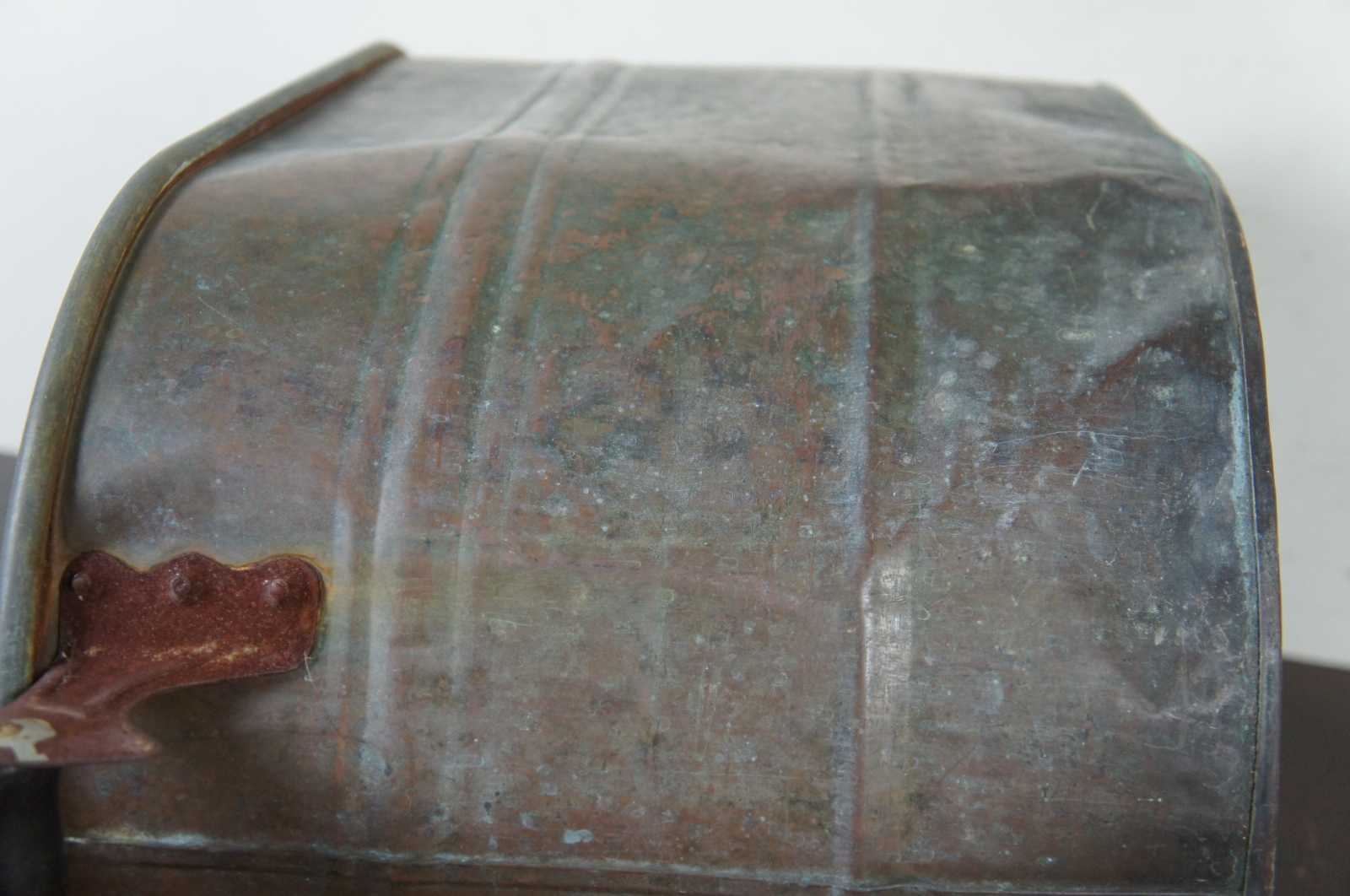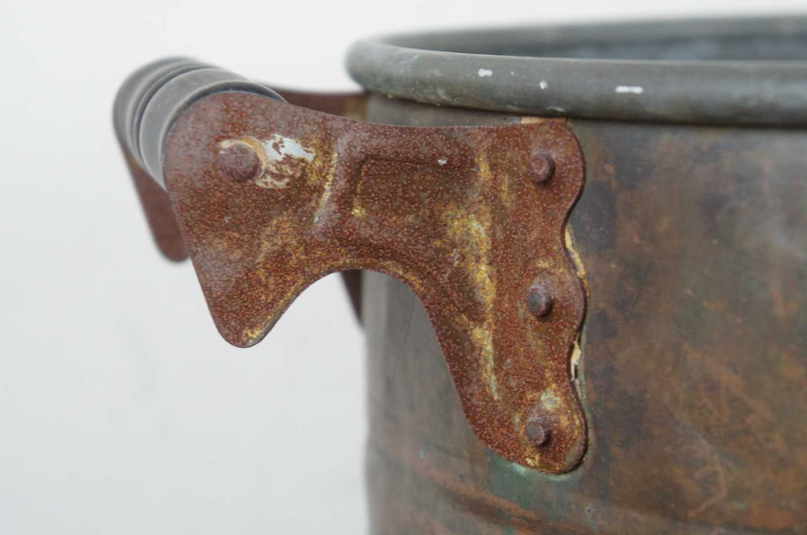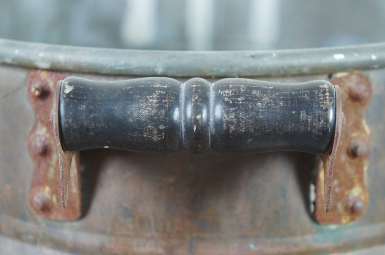 Antique primitve galvanized copper wash tub or boiler, oval shaped with wooden handles and a faint checkered pattern in the sides.