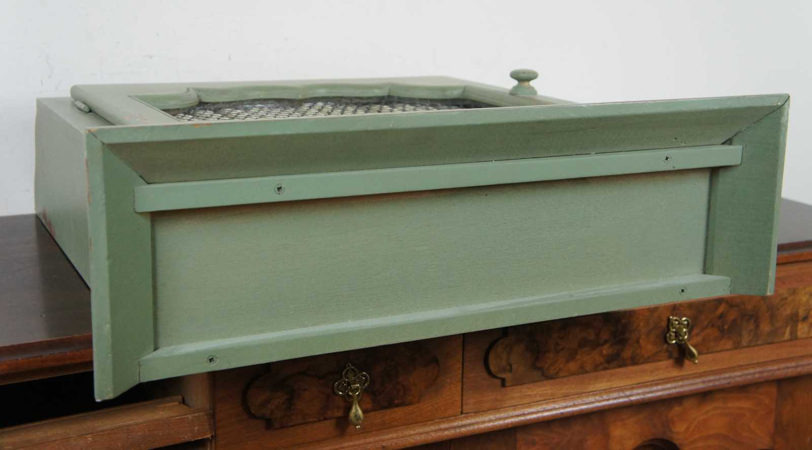 Rustic mint green painted wall cabinet with a curtained chicken wire door by British Traditions Inc, makers of reproduction European country furniture based in the USA.