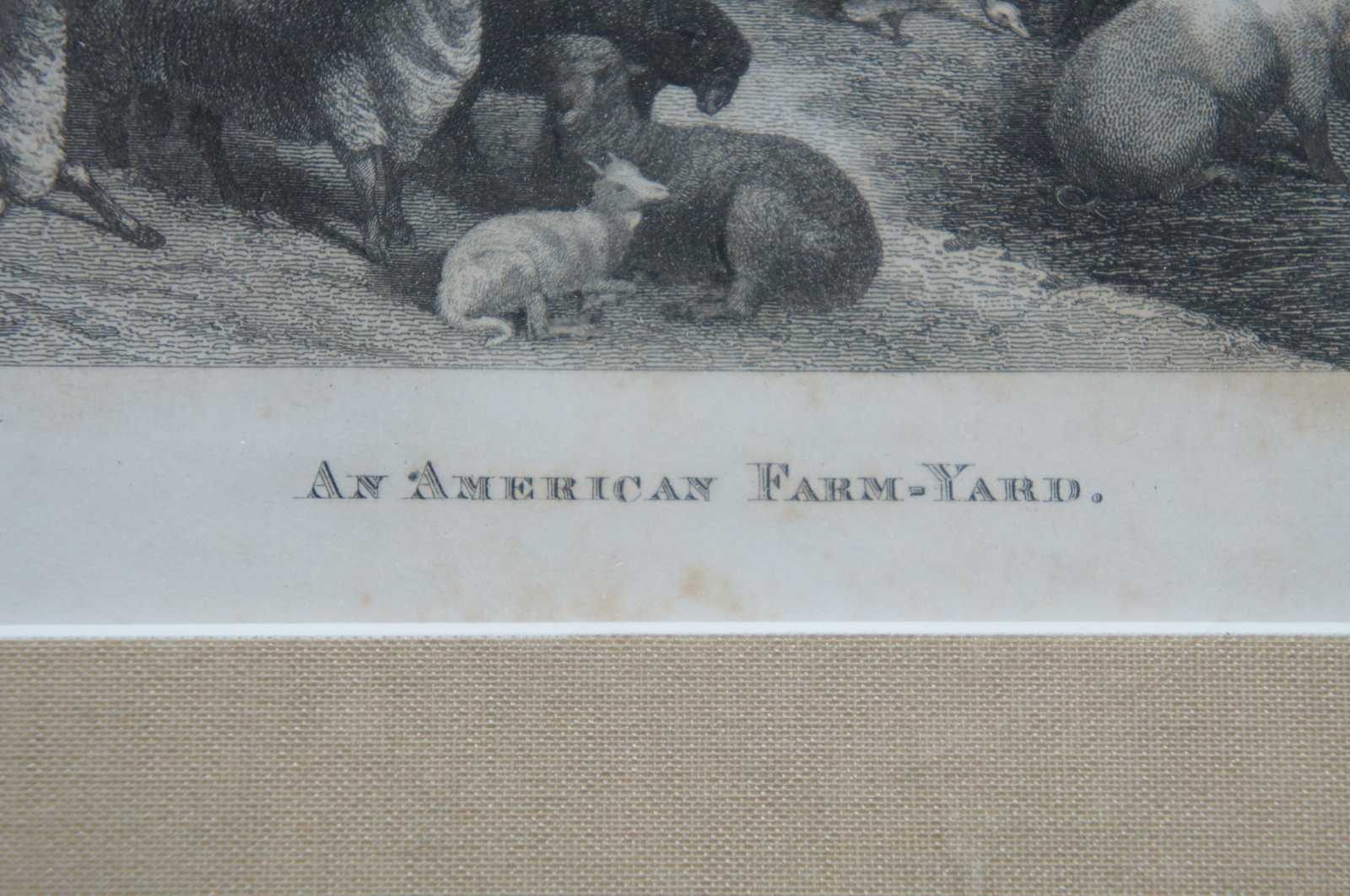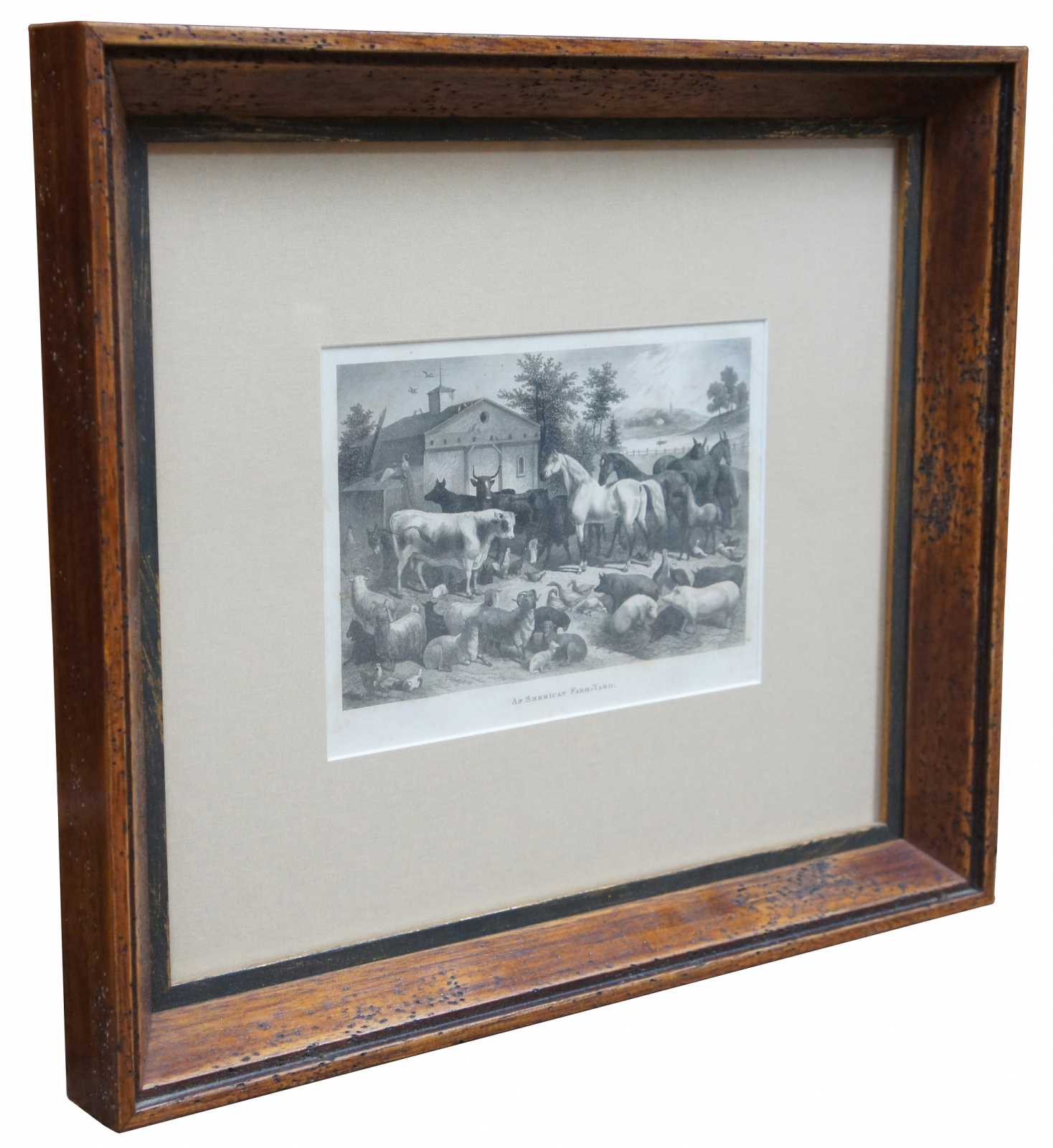 Facts for Farmers - Materials fror Land-owners about Domestic Animals, Gardens and Vineyards, Edited by Solon Robinson in Two Volumens New York, A.J.Johnson 1873. The landscape features pigs, sheep, horses and cows in front of a barn with a lake in the background.
