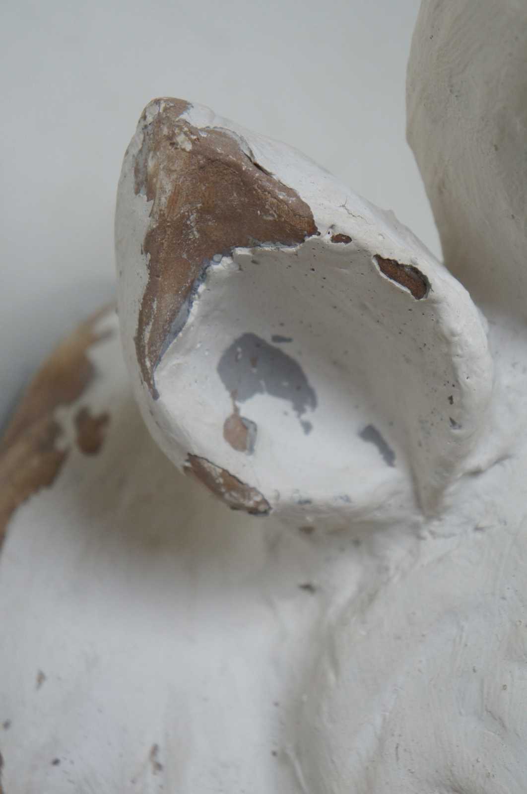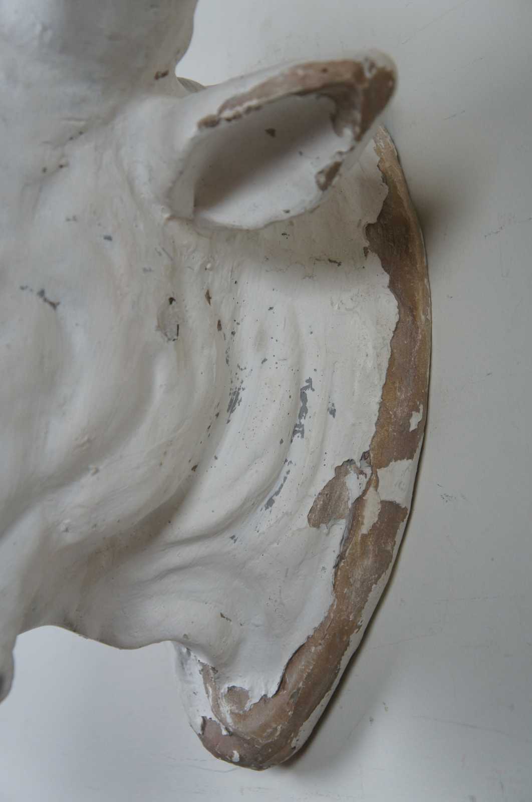 Realistic composite ceramic bull head wall hanging, finished with a rustic, artistically distressed white glaze.