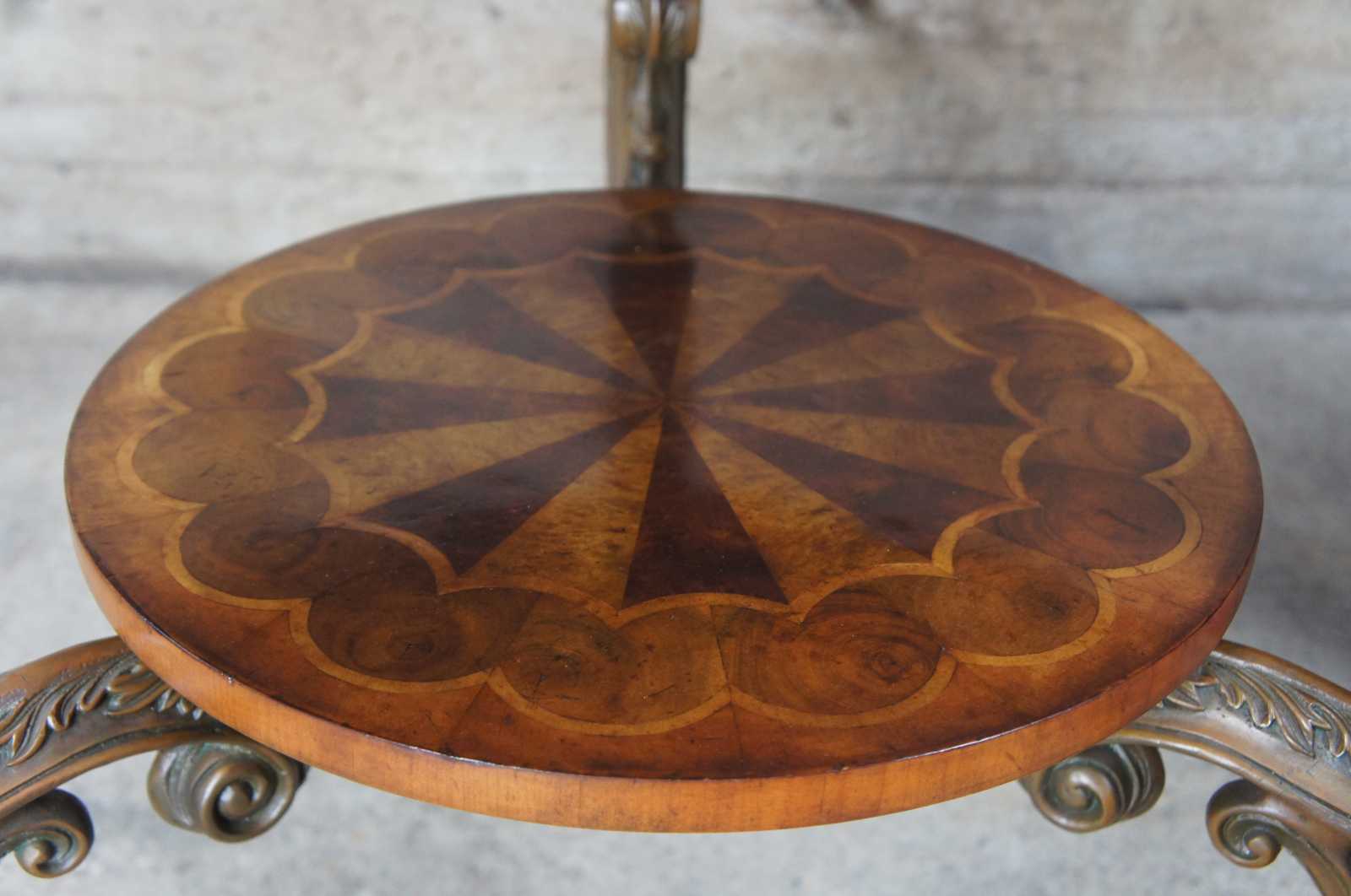 Theodore Alexander entryway center table with ornate bronzed iron base. The vibrant top is amplified by a sunburst pattern, and the use of mahogany and walnut. The drum shaped apron includes three drawers and is accented by walnut burl. The lower shelf matches the upper tier. Table is very heavy.