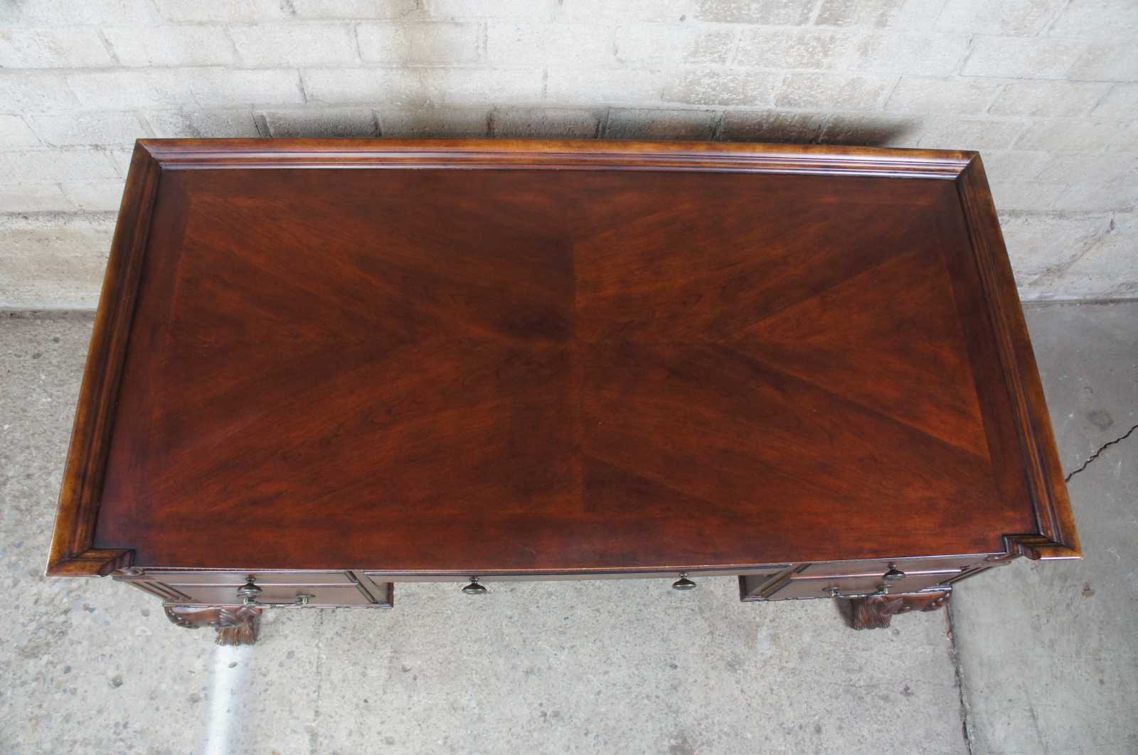 Hekman furniture mahogany writing desk. Features chippendale styling with hairy paw feet. Includes four drawers, scalloped legs, gadrooning and fluting along the trim, and a gallery around the surface. Additionaly features, a matchbook veneer top and keyboard drawer.