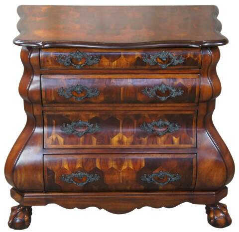 Theodore Alexander Dutch Bombe chest. Influenced by a combination of 18th century Dutch and Chippendale styling. Features a serpentine design made from mahognay with four drawers, ornate hardware, ball and claw feet and geometric parquetry finish. A great piece for any entry.