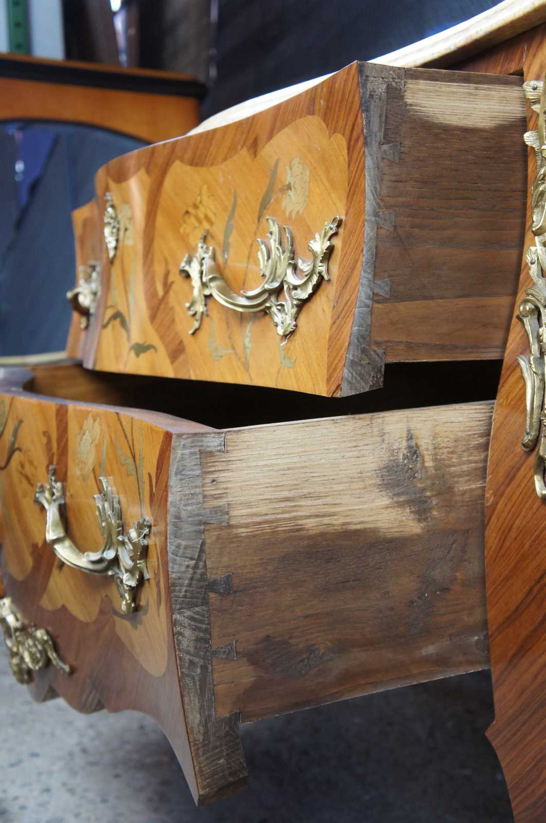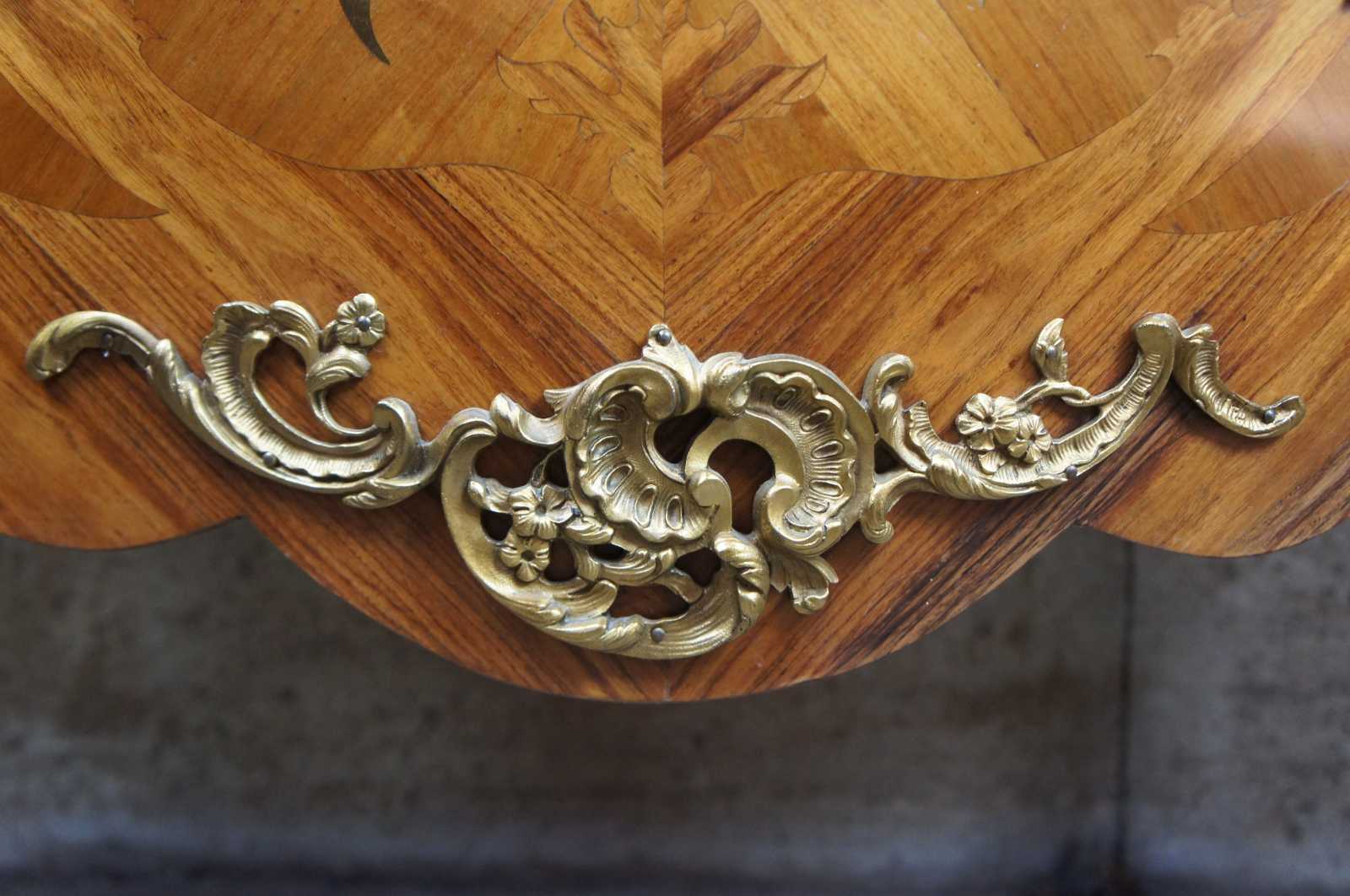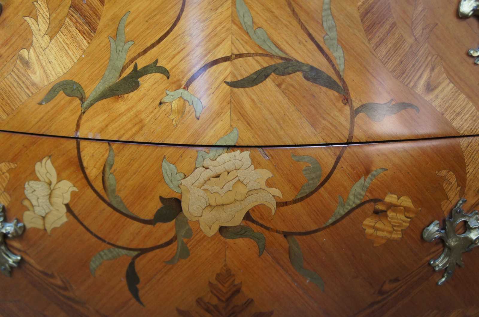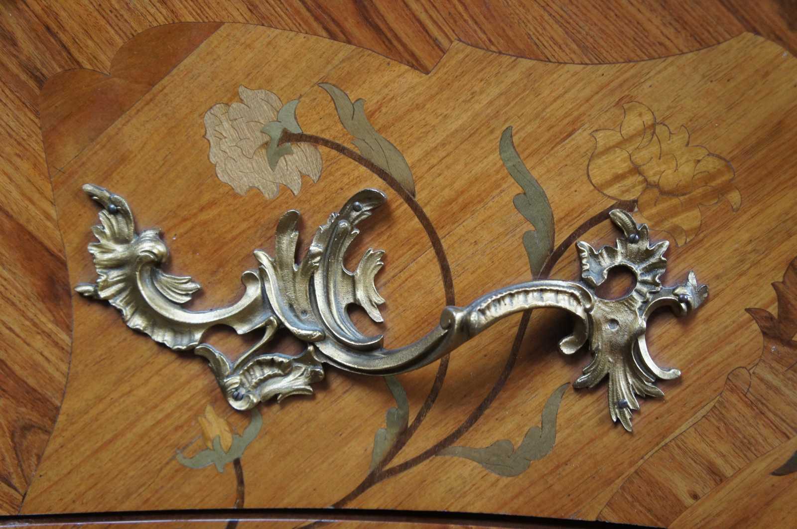 Two antique 19th century French serpentine Louis XV style commodes. Made from Tulip and Rosewood with marquetry inlay, gilt bronze mounts and marble tops. Each commode features hand dovetailed drawers and a beautiful floral rose motif.