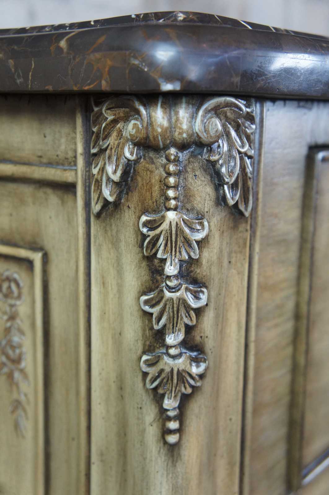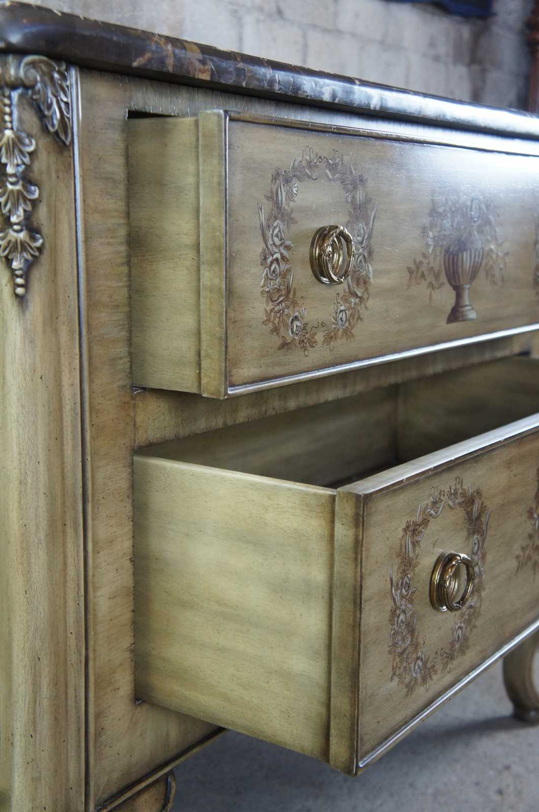 Circa 1990s Maitland Smith hand painted stone top chest. Features Louis XV styling with hand painted floral detail and brass hardware.