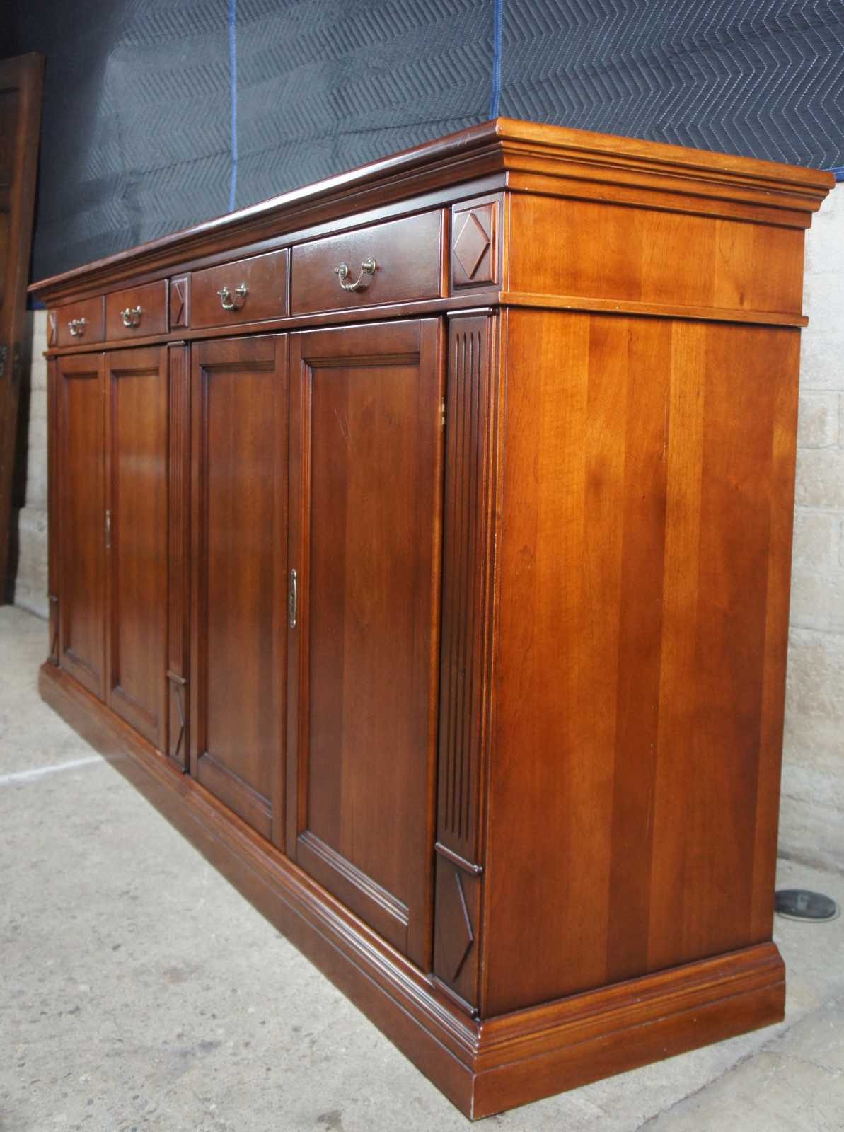 Italian made and traditional inspired cherry sideboard. Features a tall stature with four drawers over lower cabinets. Includes fluted columns between diamond pattern medallions. Could be used as a bookcase, bar back, media cabinet or entry, hallway or dining piece.