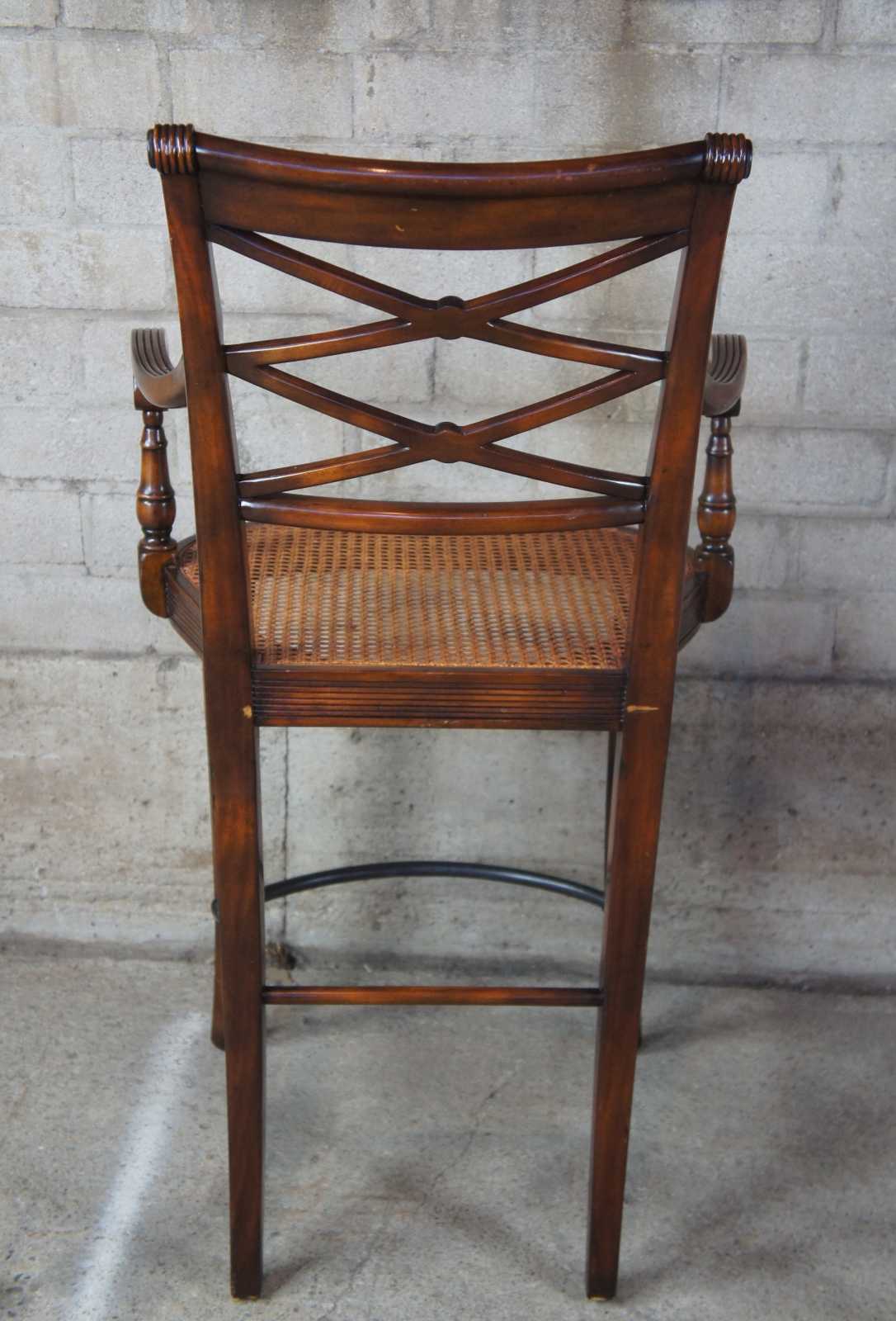 Theodore Alexander counter height bar stools # 4100. Features a hand carved armchair with reeded decoration, over scroll and double 'X' pierced back above a cane seat with upholstered downfilled cushion. The chairs are made from mahogany and feature sabre legs.