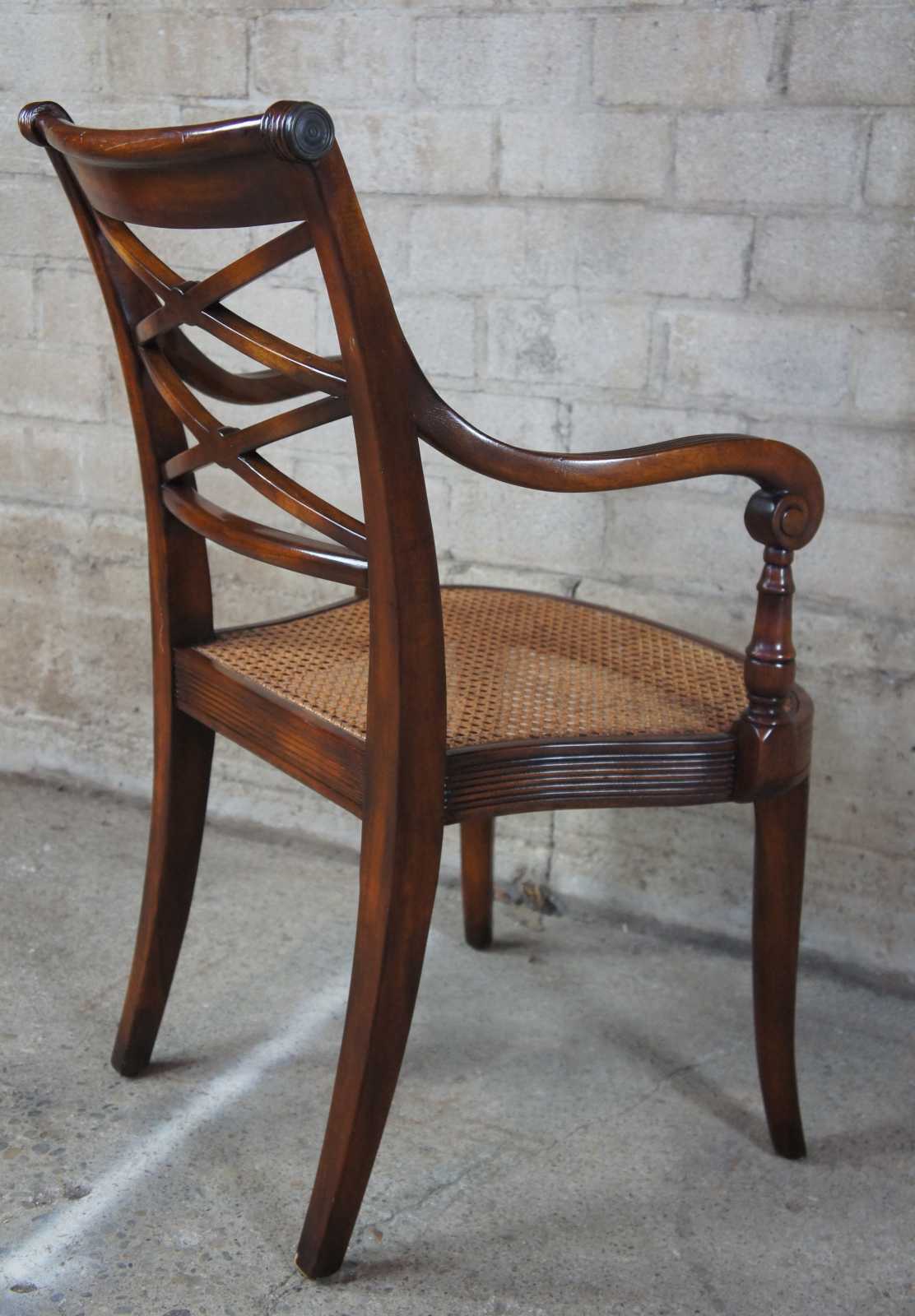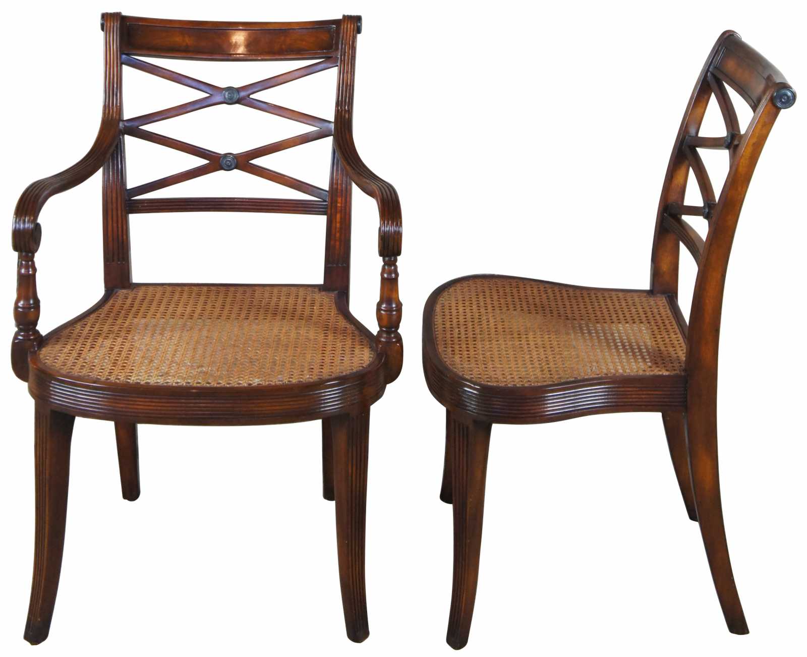 Theodore Alexander 4100-902. A hand carved armchair with reeded decoration, the over scroll and double 'X' pierced back above a cane seat with upholstered downfilled cushion. The chairs are made from mahogany and feature sabre legs.