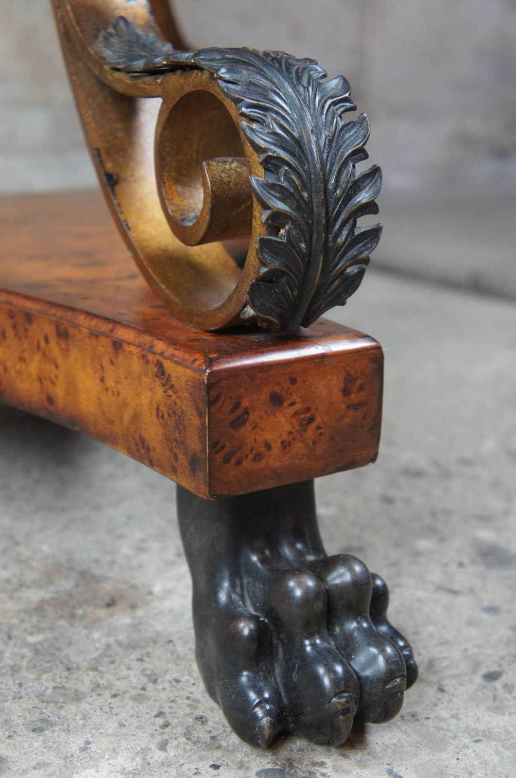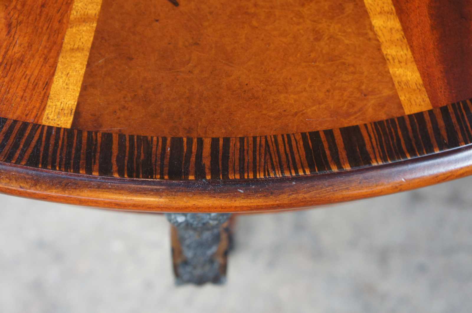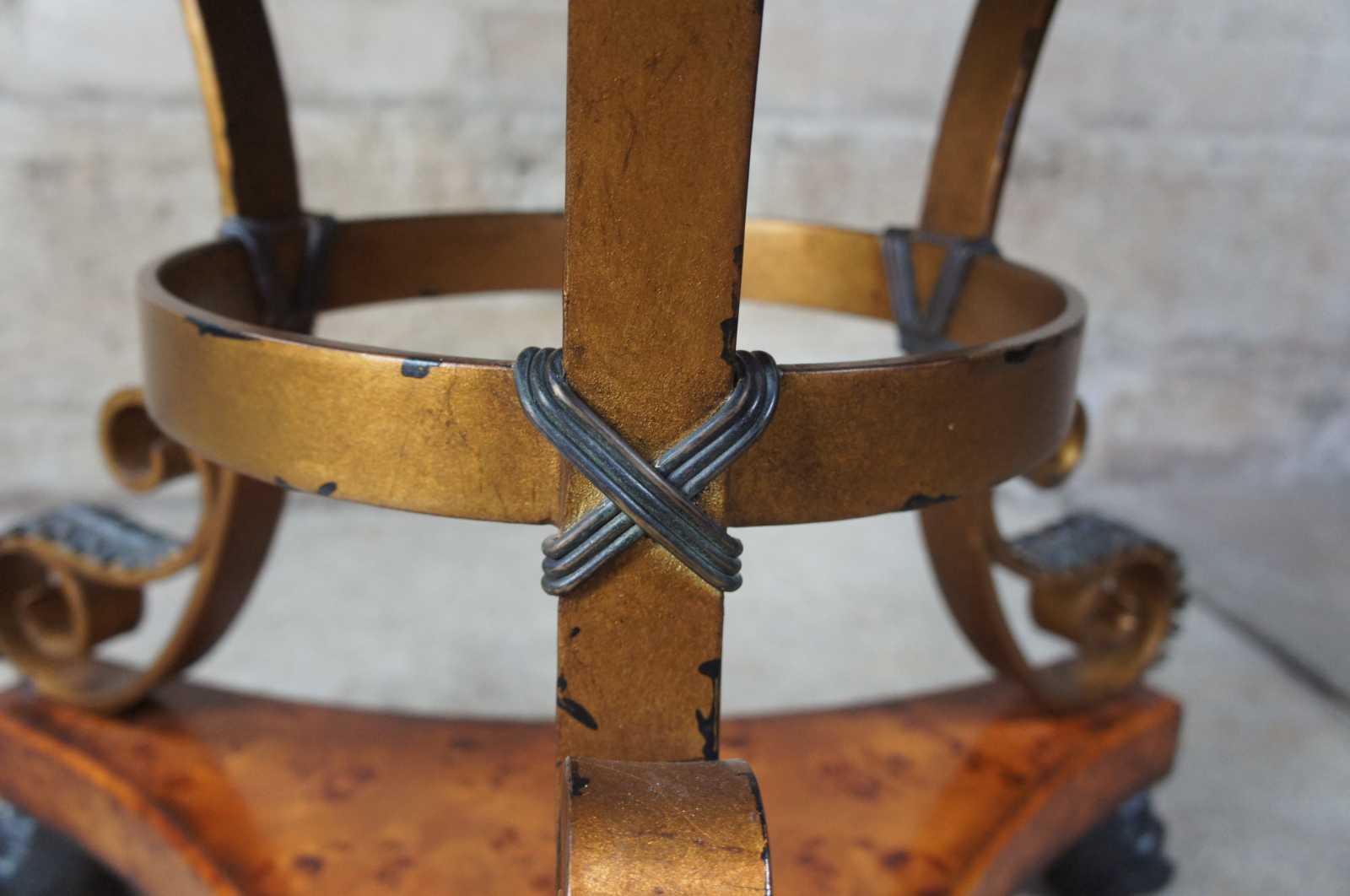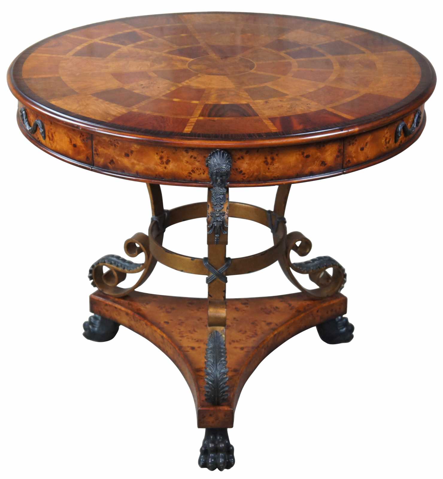 Theodore Alexander entryway center table with a gilt iron base leading down to paw feet. The vibrant top is amplified by the use of mahogany and walnut in a circular banded pattern framed in Dark Morado. The drum shaped apron includes three drawers and is covered in walnut burl with Egyptian revival mounts. The table is supported by tarnished brass lion paw feet with acanthus accent above.