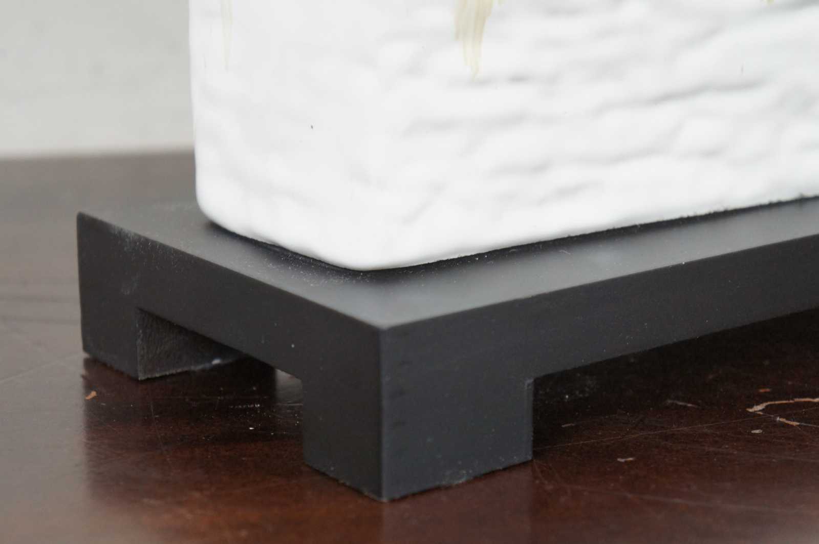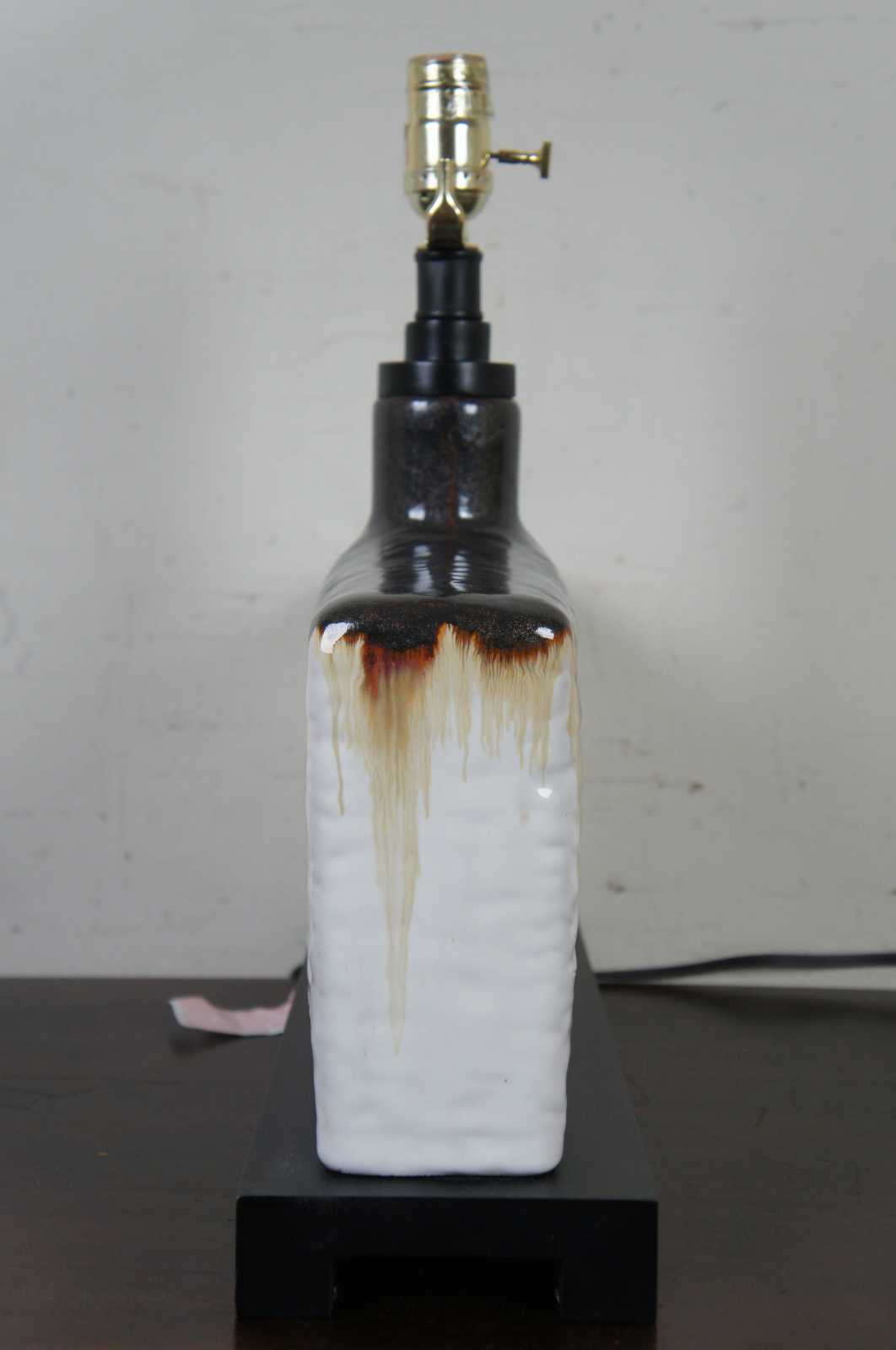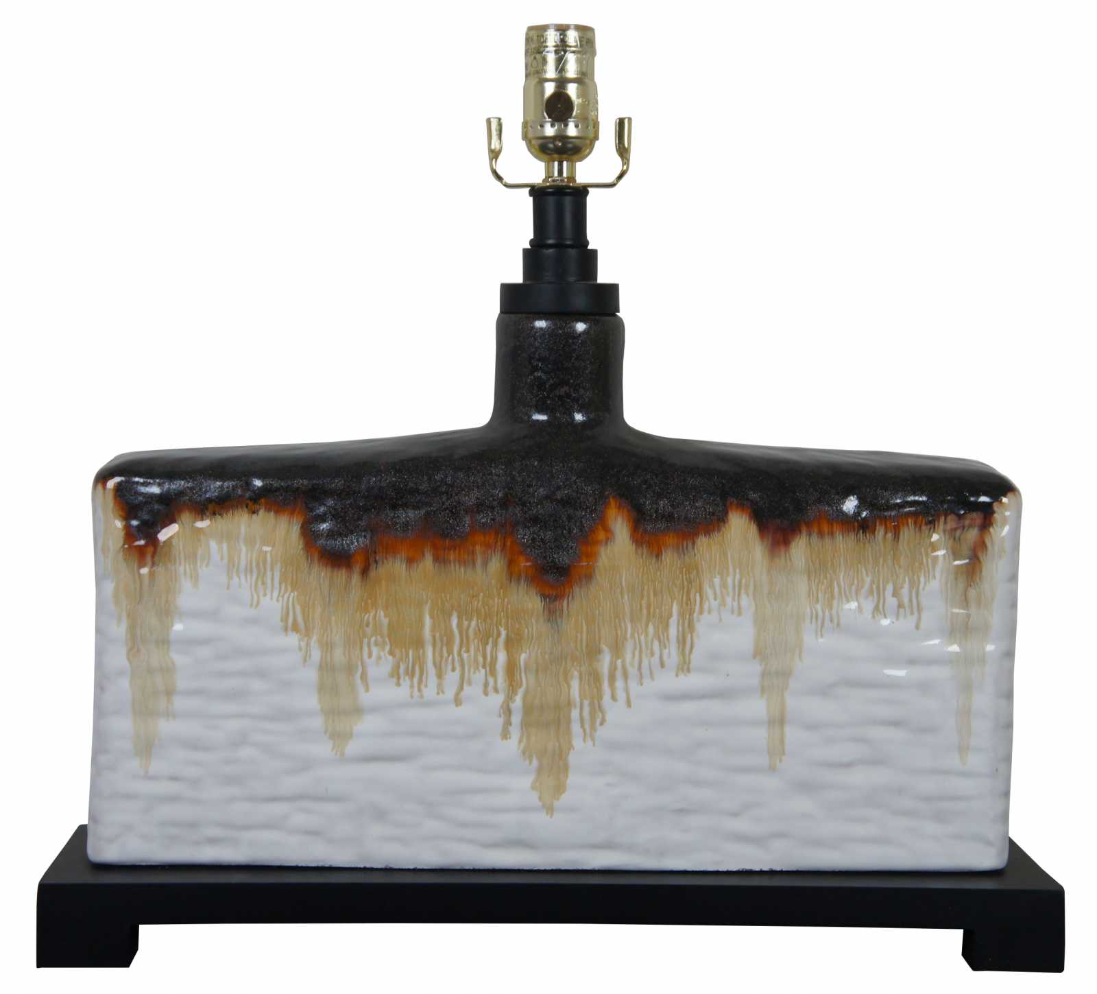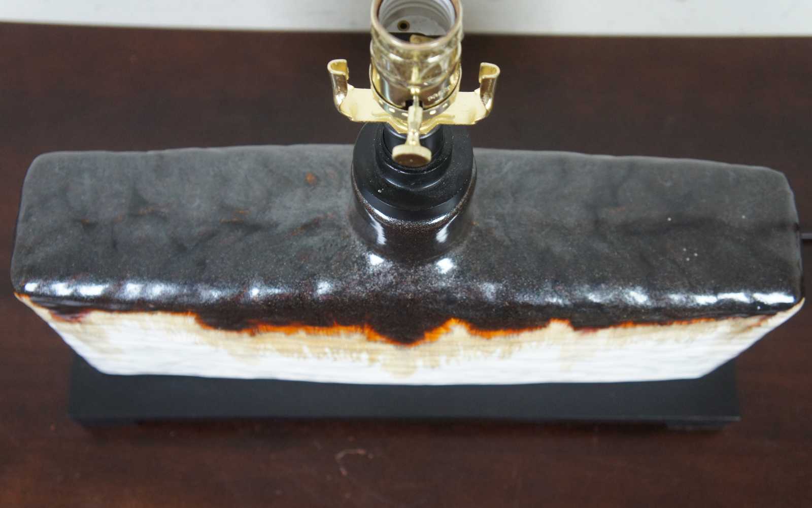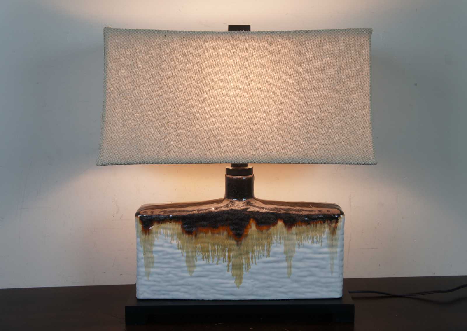 The heavy antiqued ivory glaze on this rectangular table lamp is accented at the top of the base with the application of a dark bronze and rusty orange edge drip. The khaki linen lamp shade is a perfect foil for this piece which will sit nicely on an end table.. Style 26455-1, Adelanto.