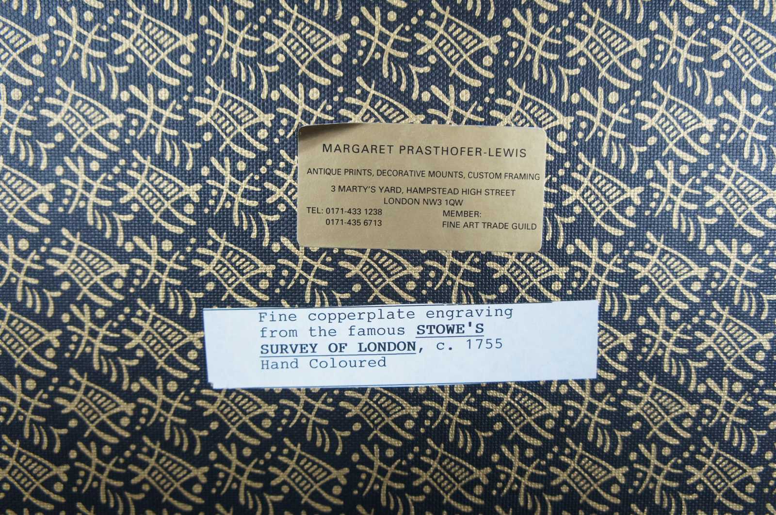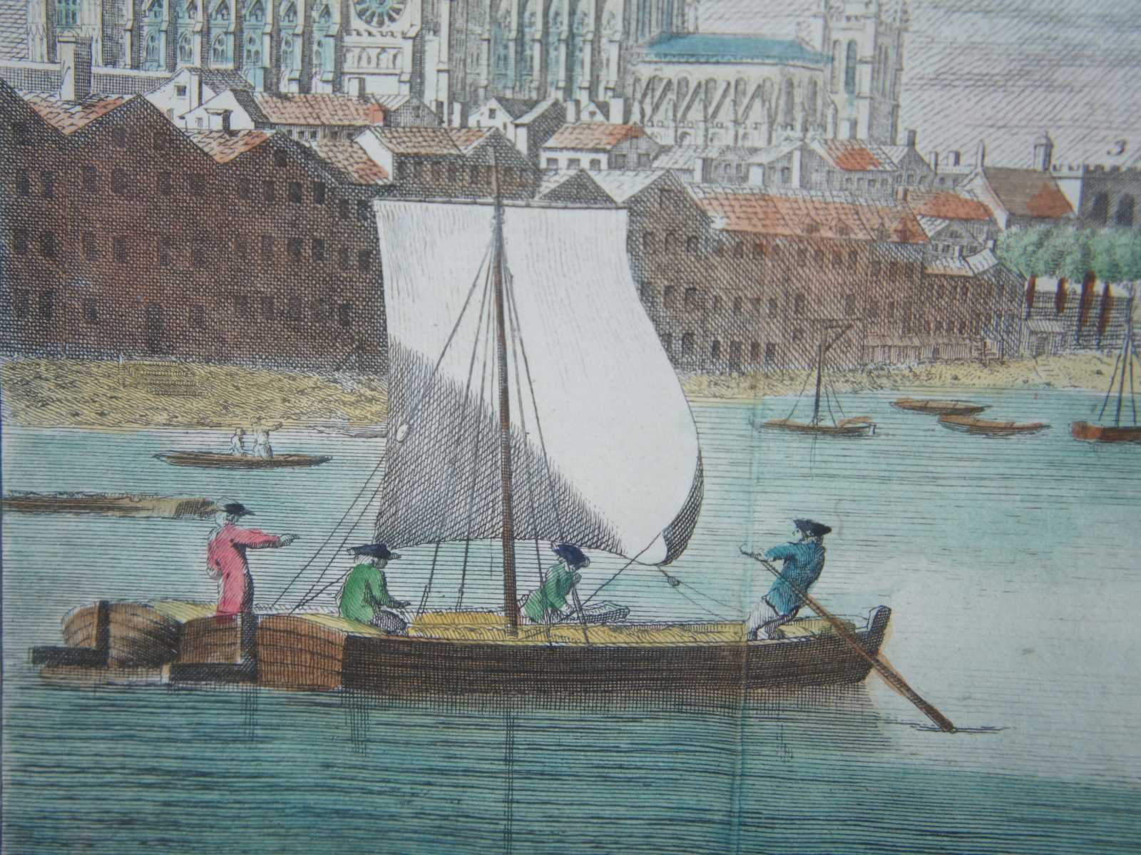 Antique hand colored riverscape / landscape copperplate engraving based on a painting by Jacob Maurer and engraved by Paul Fourdrinier - A View of Westminster Bridge from Lambeth, published according to Act of Parliament 1754 for Stowe’s Survey of London. BIO: Paul Fourdrinier sometimes referred to as Peter or Pierre Fourdrinier, was an 18th Century engraver in England. Paul Fourdrinier, engraver and printseller, was born on 20 December 1698 in Groningen in the Netherlands, the son of Jacques Fourdrinier and his wife, Jeanne Theroude, Huguenot refugees from Dieppe, Normandy. He was a pupil of Bernard Picart at Amsterdam for six years, and came to England in 1720. He was employed in engraving portraits and book illustrations. He also engraved two works by Peter Monamy, marine paintings displayed in Vauxhall Gardens. The engravings were published in 1743, but may have been executed earlier. Starting in 1742 Fourdrinier produced a series of books consisting of numerous folding charts showing "The Succession of Colonels to all his Majesties Land Forces from their Rise to 1742", as well as many other details of British military and naval personnel. The 2004 edition of the Oxford Dictionary of National Biography makes it clear that in the 19th century edition of the Dictionary of National Biography this engraver's works and career were assigned to two individuals, Peter (or Pierre) and Paul Fourdrinier. Peter/Pierre is now seen to be a fictitious individual resulting from an accidental misnaming of Paul. Paul Fourdrinier is mentioned as the engraver of some of the works listed above, and he has been identified with the Paul Fourdrinier who was of the parish of St. Martin's-in-the-Fields, married to Susanna Grolleau, and who died in January or February 1758. The couple had at least five children, including a son Henry Fourdrinier, whose daughter, or granddaughter, Jemima Fourdrinier was the mother of Cardinal John Henry Newman. The engravings listed are in all cases inscribed ‘P. Fourdrinier.’ The title-page of Chambers's ‘Civil Architecture’ says that the plates were engraved by ‘Old Rooker, Old Fourdrinier, and others.’ Paul Fourdrinier also founded a stationery business which was carried on by his son and grandsons (Henry and Sealy)) until at least 1811.