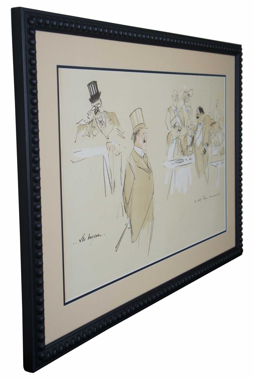 Antique French cartoon print showing a well dressed man watching other rich looking figures as they lounge about a restaurant over the words “Les voyeur… le petite tango commercial” (The voyeur… the small commercial tango/dance).