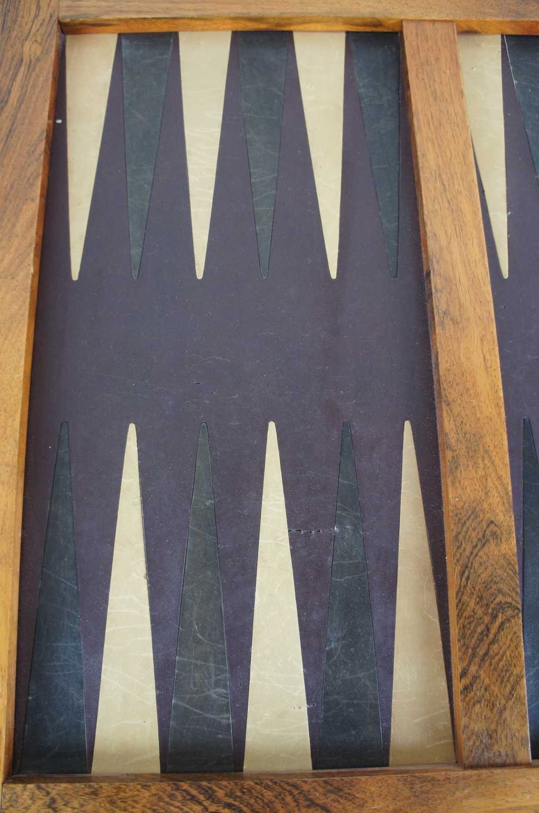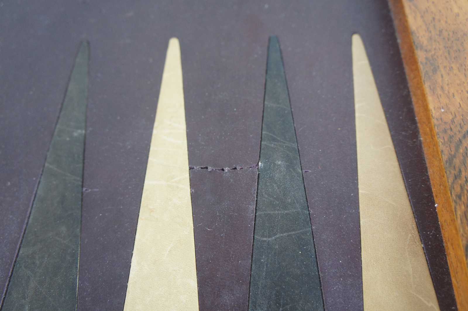 Vintage, non-folding, wood and leather backgammon board with black and white triangles on a purple hued background. Board only, no pieces.