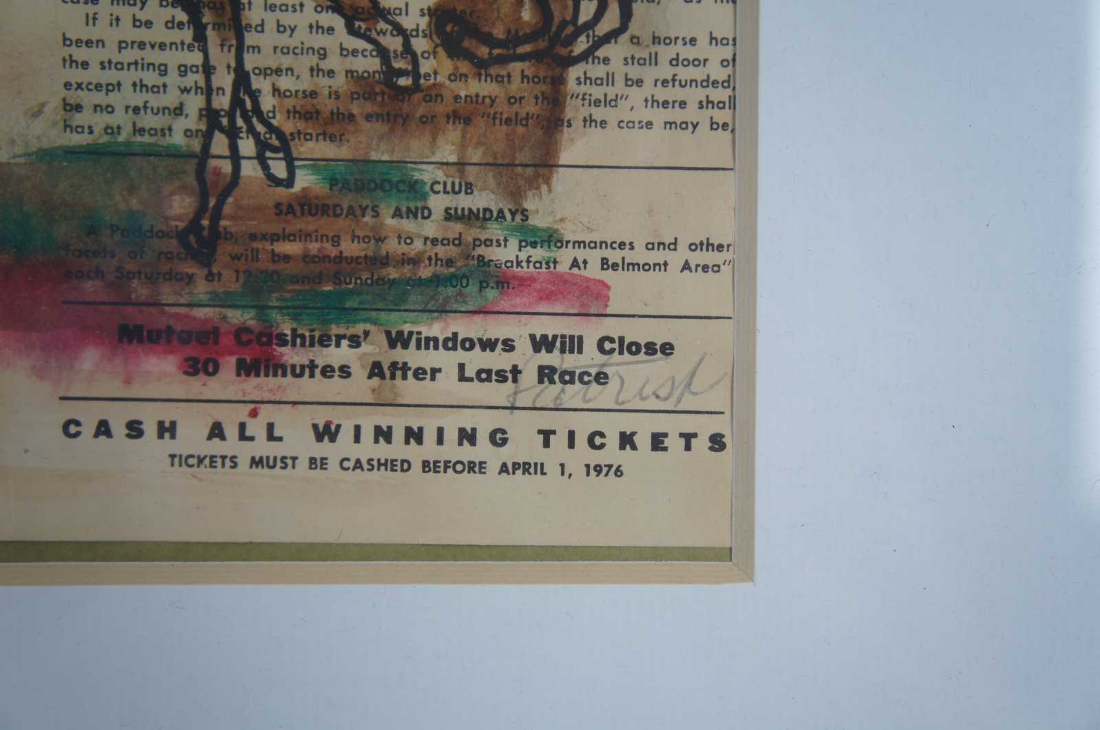 Copy of program from Belmont Park for race 7 and 8, with watercolor artwork. The piece features two racing horse jockeys on brown horses, pencil signed at bottom corner, Patrick.