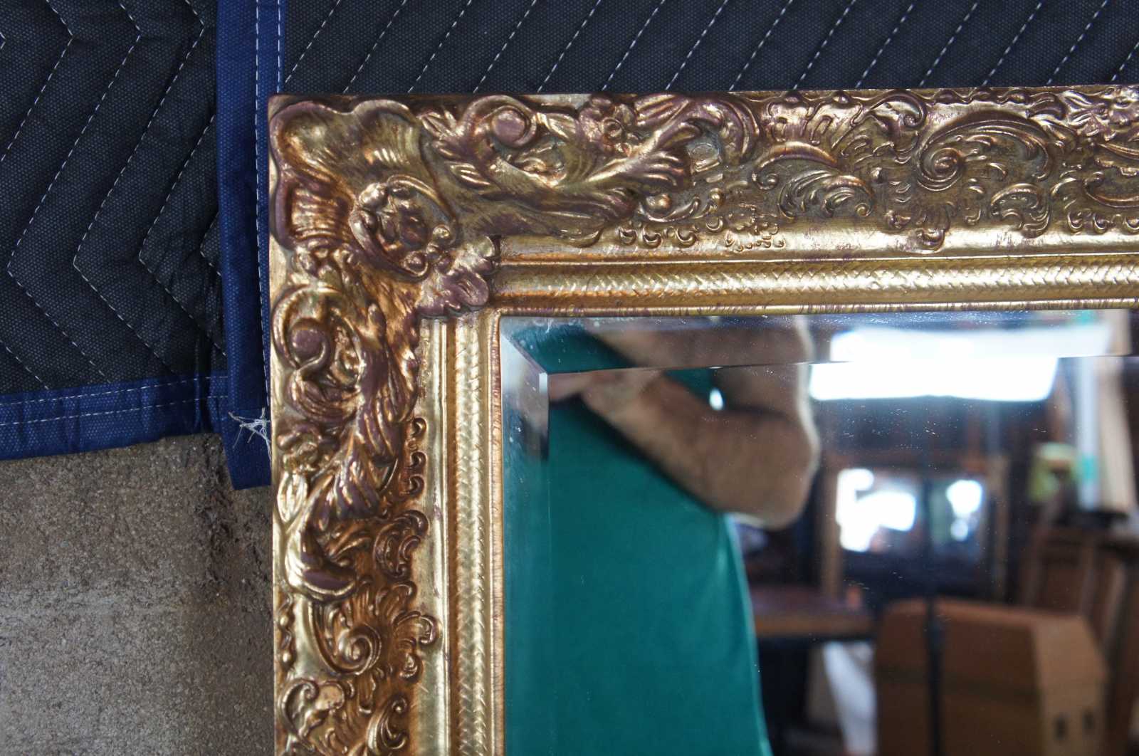 A unique French or Hollywood Regency style mirror. Features a scalloped gold frame with bevelled glass mirror. The mirror is setup to be hung vertically or horizontally making a versatile addition to any space.