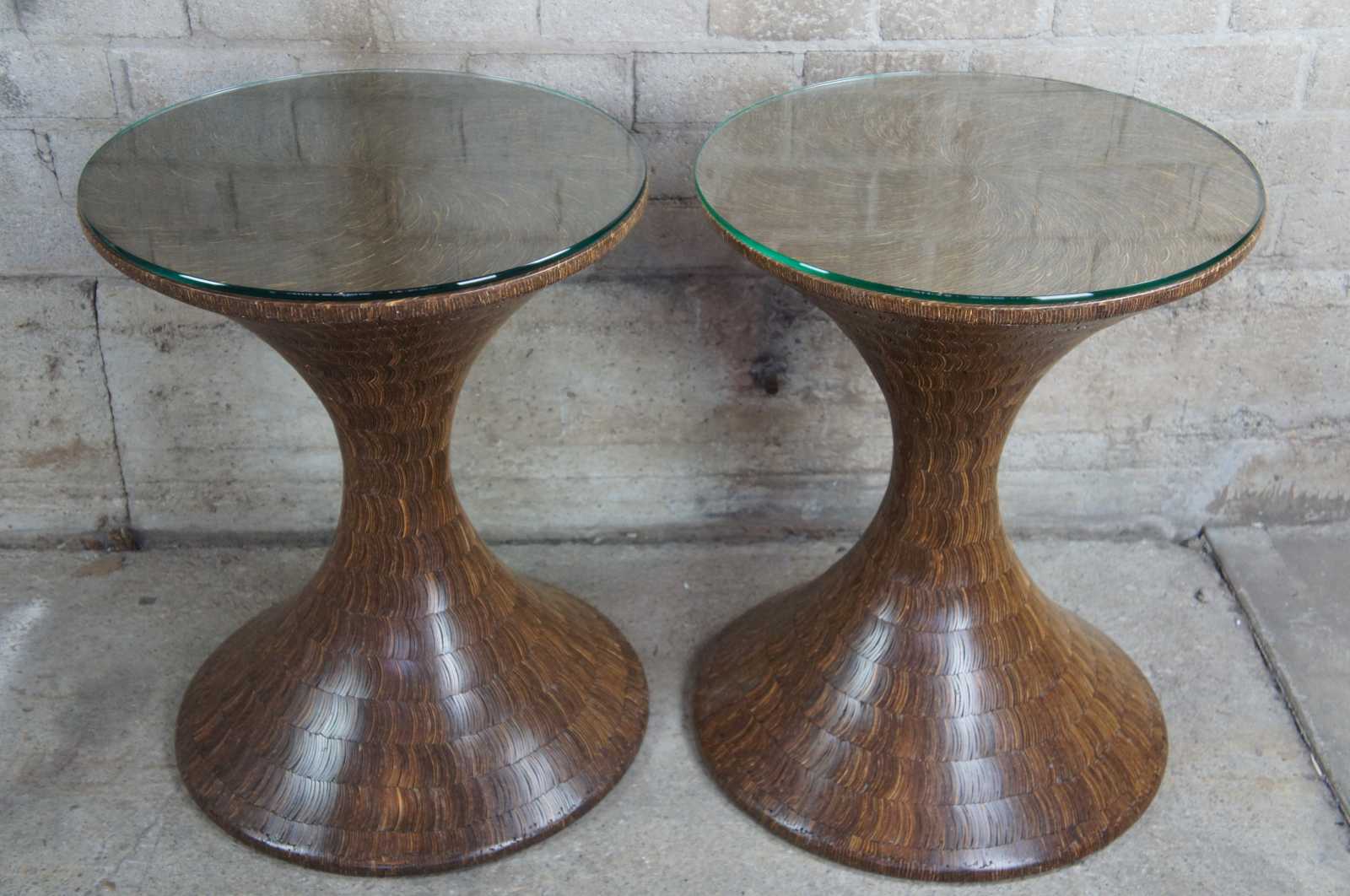 Unique pair of hourglass shaped pedestals or side tables. Each is made from inlaid slivers that are patterned in a swirel shape and lead to a painted top, affixed with glass.